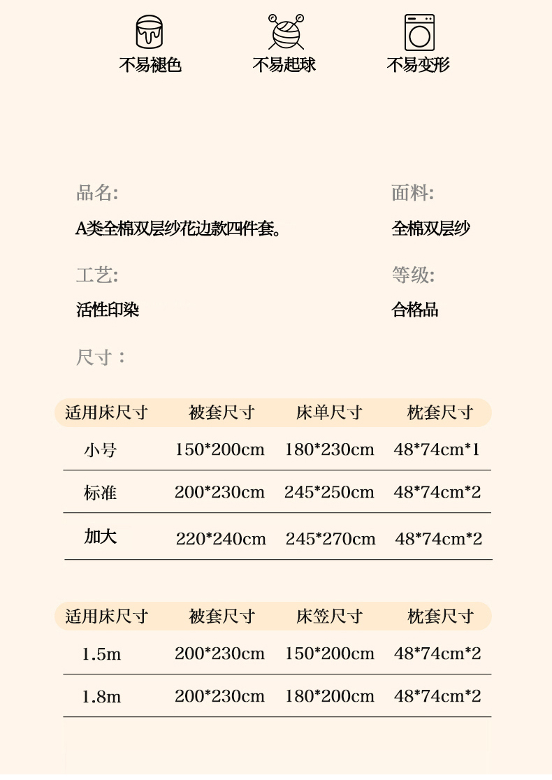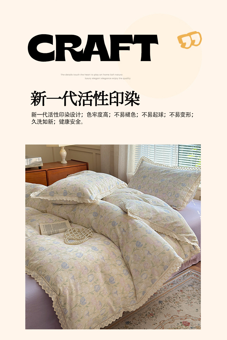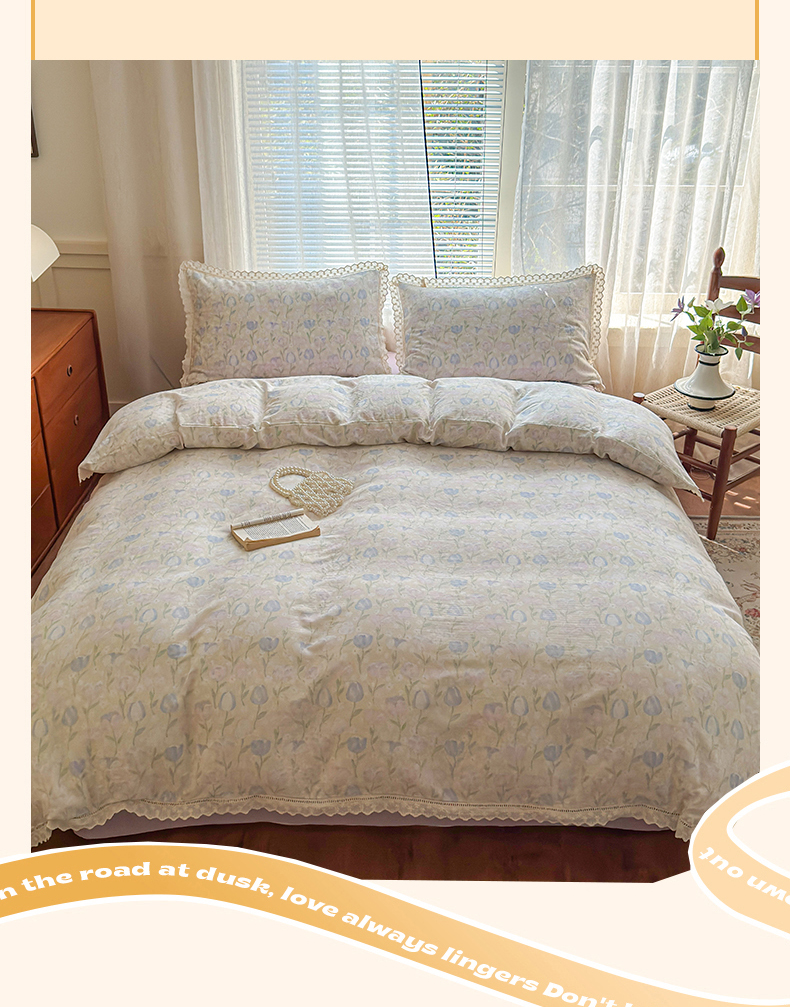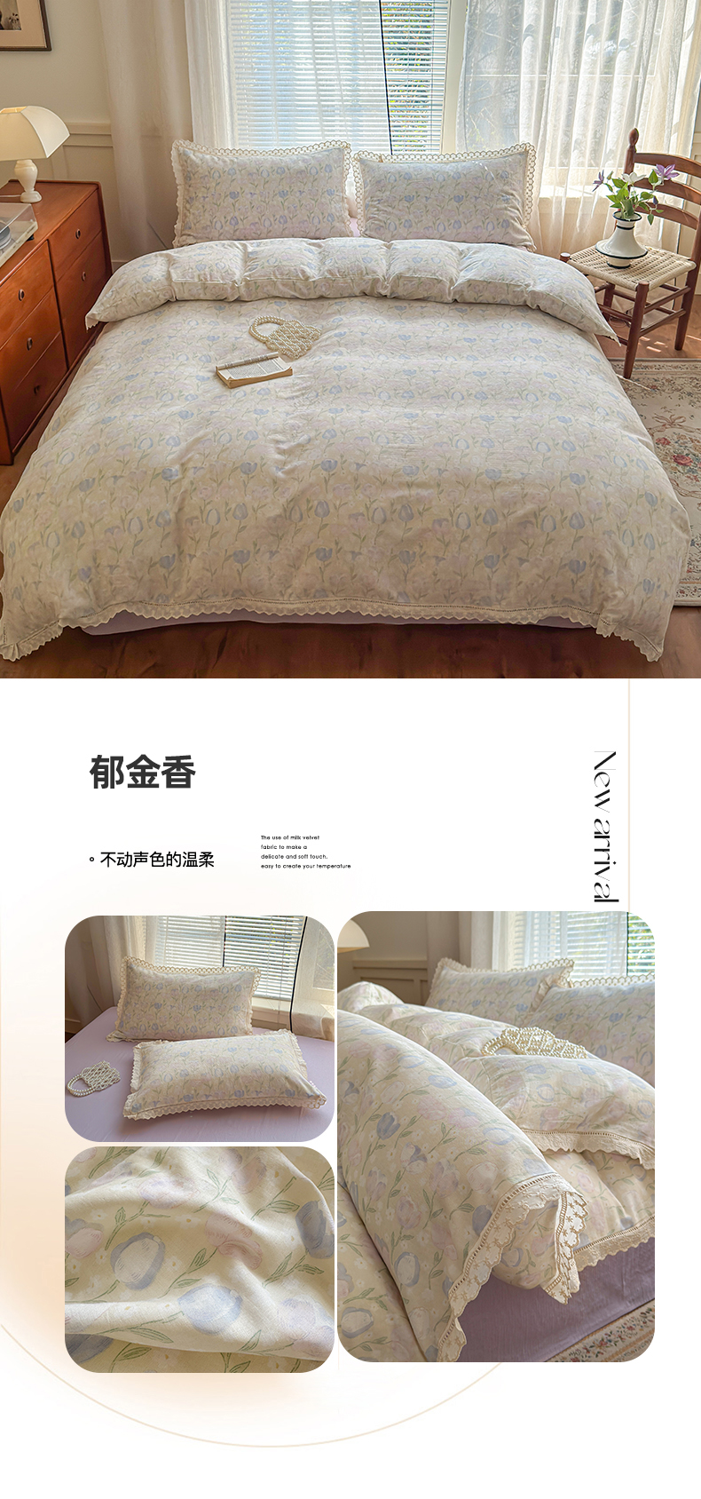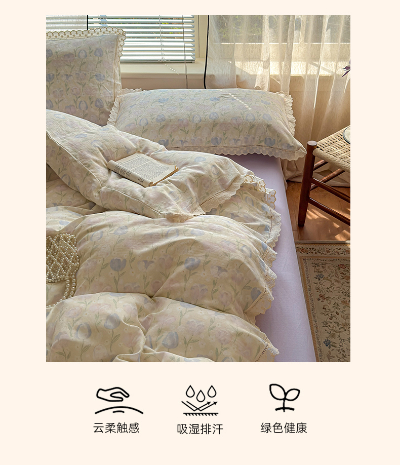 商品名称:曼之夏 2025新款A类全棉双层纱花边四件套 郁金香