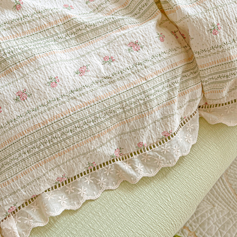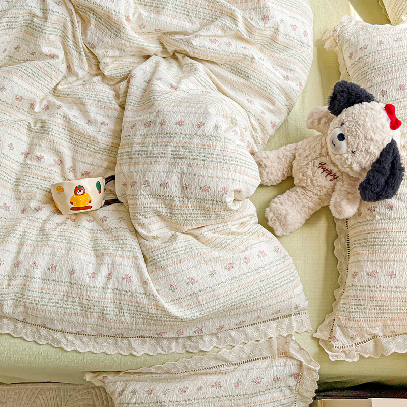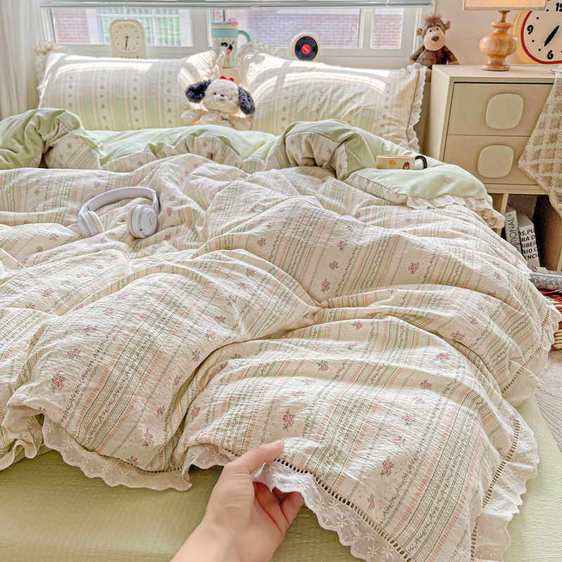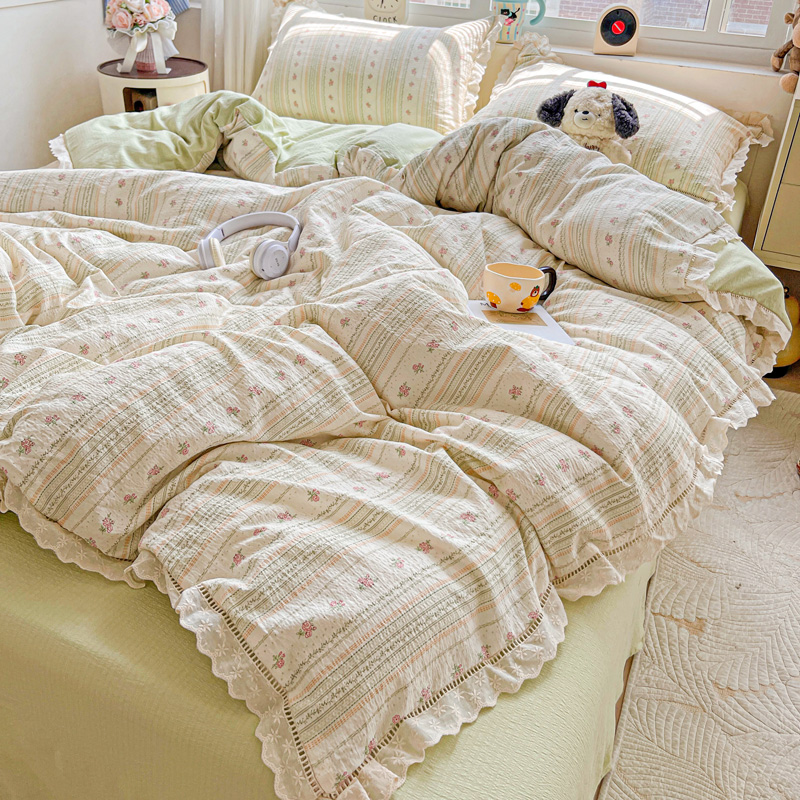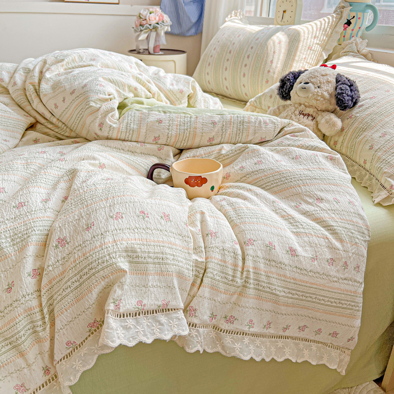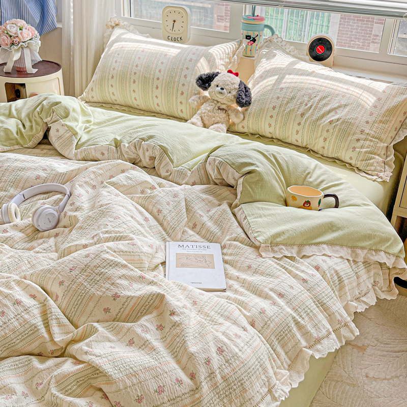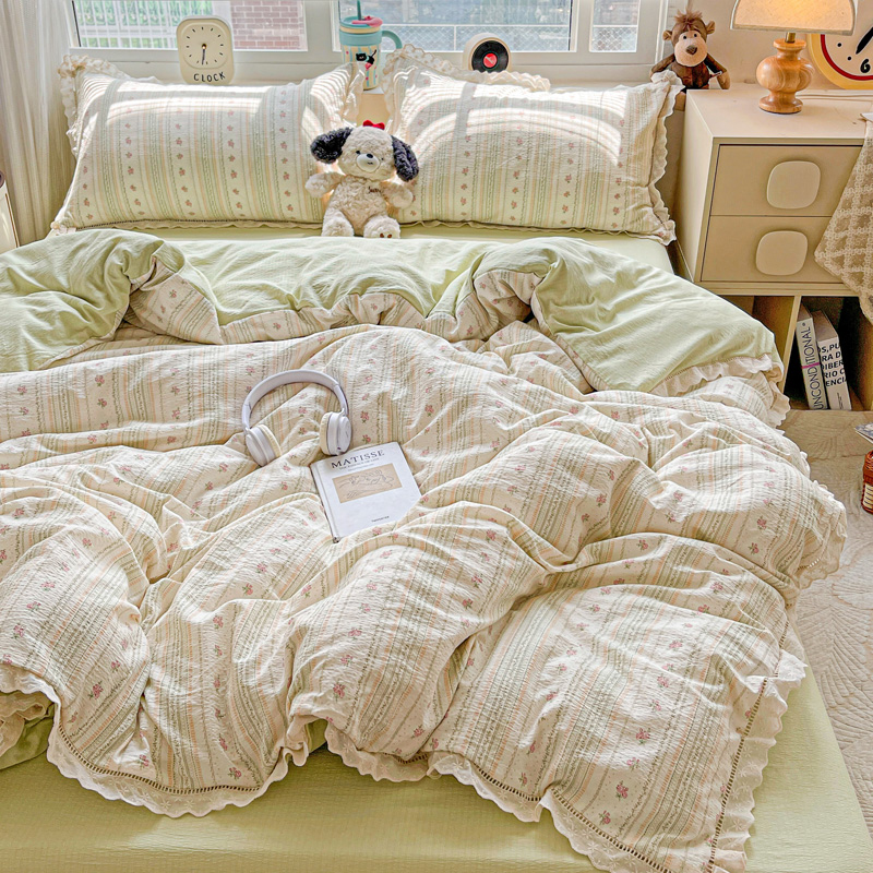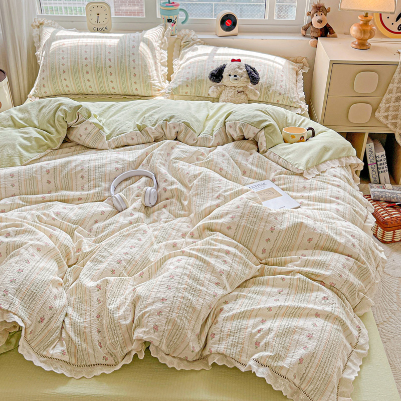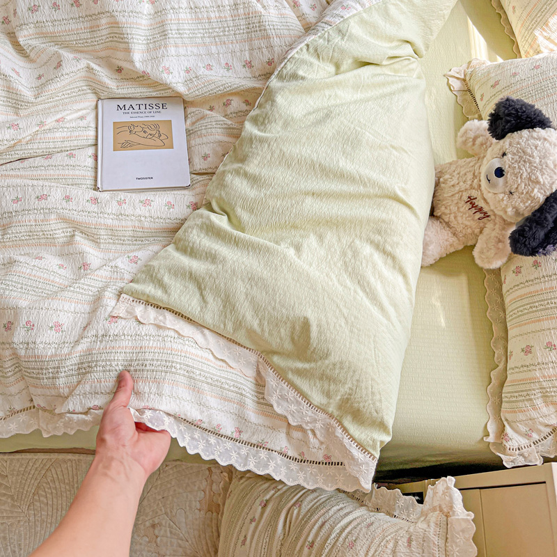 一比一 2026新款云感皱皱双层纱四件套-全棉花边款【控价99元销售】 白茶-绿