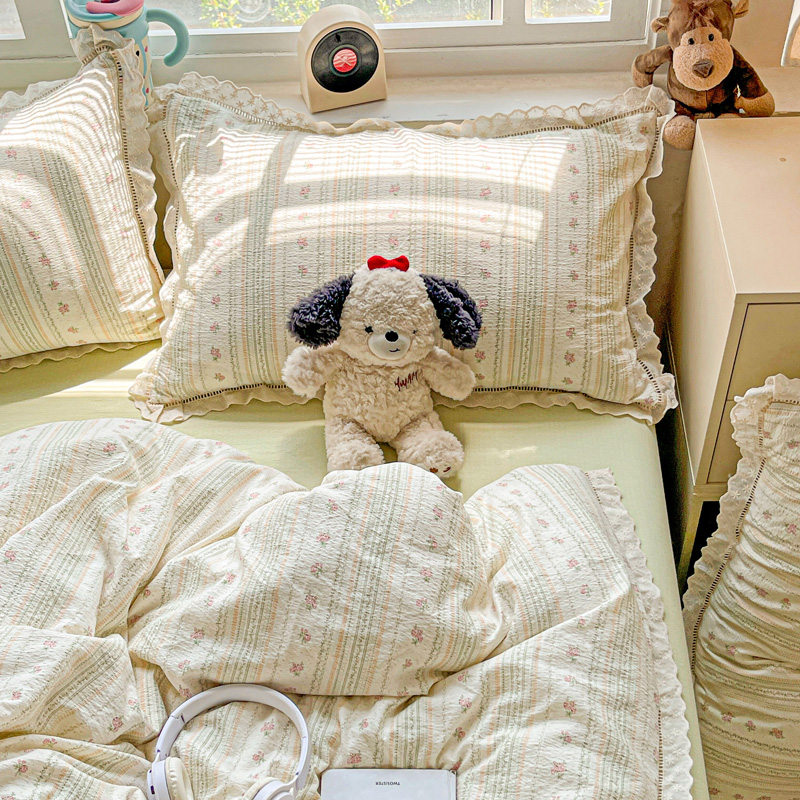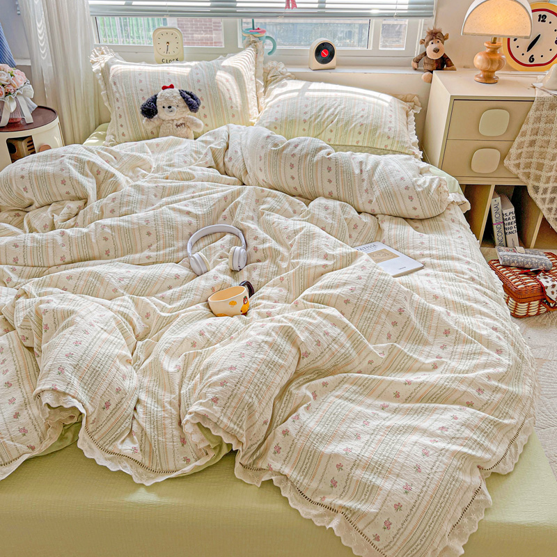 (总)一比一 2026新款云感皱皱双层纱四件套-全棉花边款【控价99元销售】,半夏绿,百福蓝,薄荷微凉,春风里,春晓,豆蔻,蝴蝶梦,可颂,兰黛,山野栀子,素颜,太妃糖,心动,遇见,芝士奶酪,紫爱心,紫苏,花园兔,蜡笔画,小黑兔,白茶-绿,初恋,莱茵河畔,桃花诺