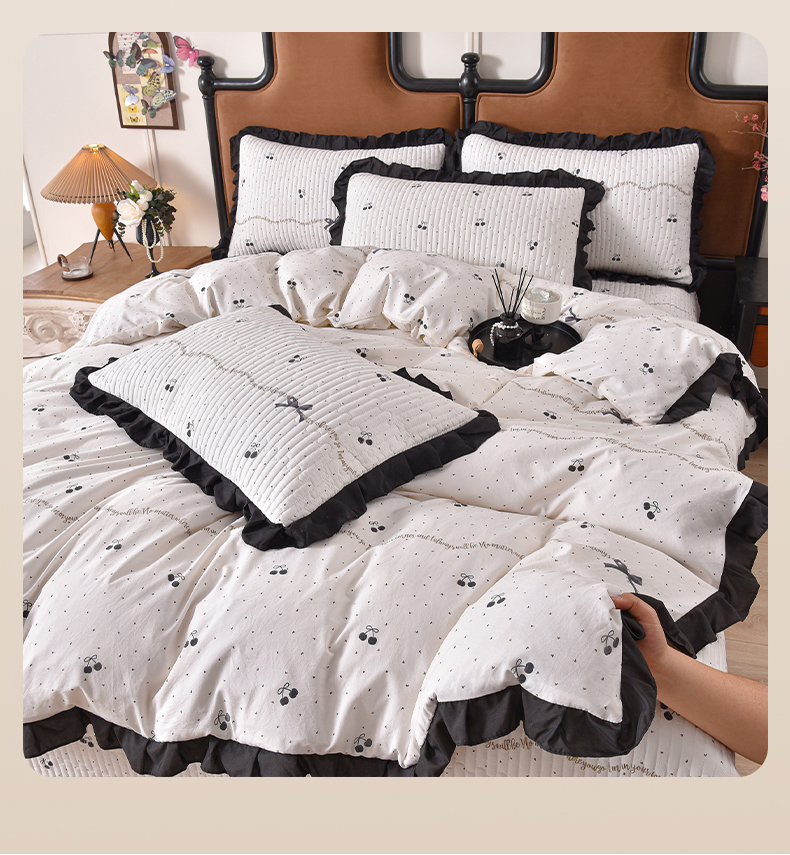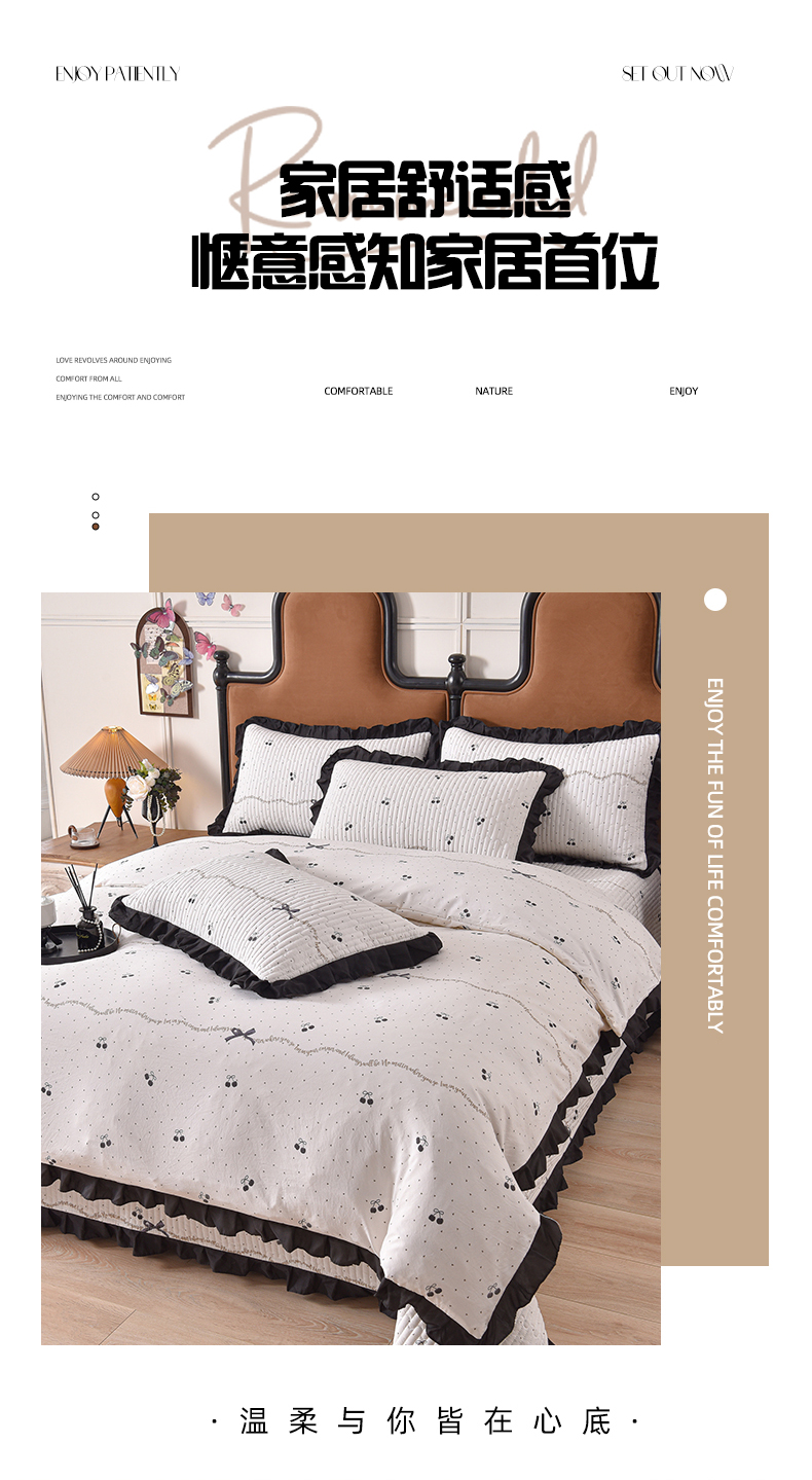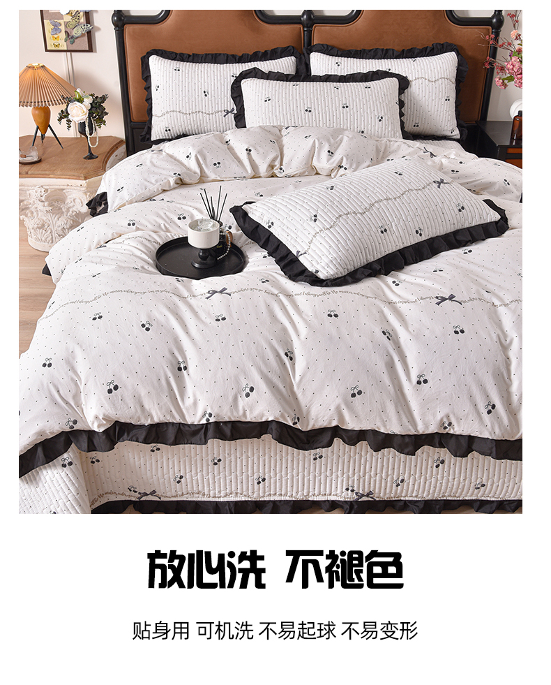 (总)同田家纺 2024新款泡泡棉印花蕾丝工艺四件套,萱花,樱桃,郁金香,竹子熊猫,朵朵花开,黑樱桃,花花小兔,花园,可爱猫,浪漫花季,绿林,莫奈花园,硕果累累,苏菲庄园
