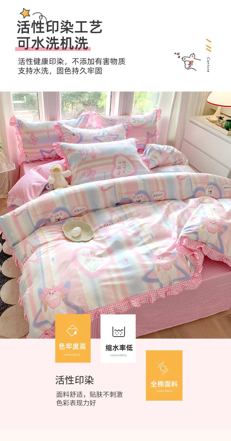 商品名称:玉元坊 2025春夏新款公主风全棉纯棉花边被套床单四件套 奶油小狗
