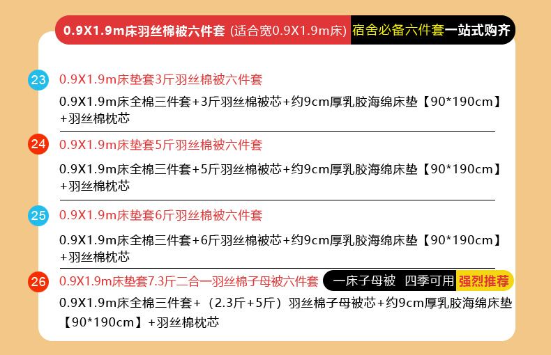 0.9X1.9m床垫套3斤羽丝棉被六件套 | ¥223.00 |