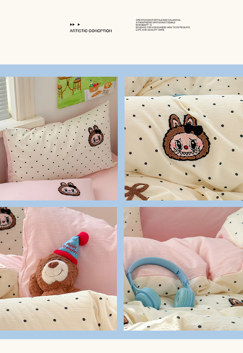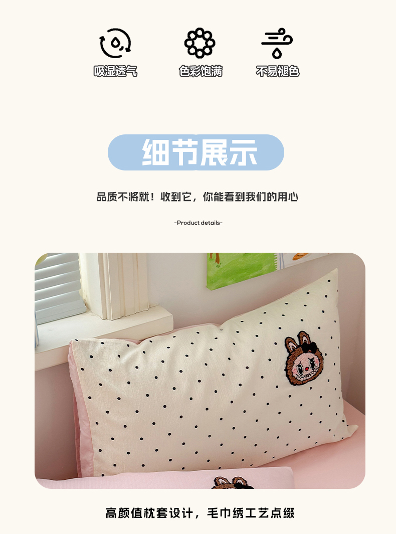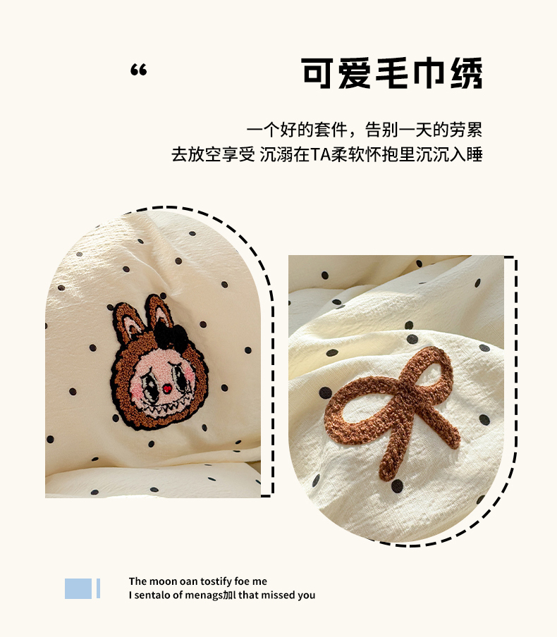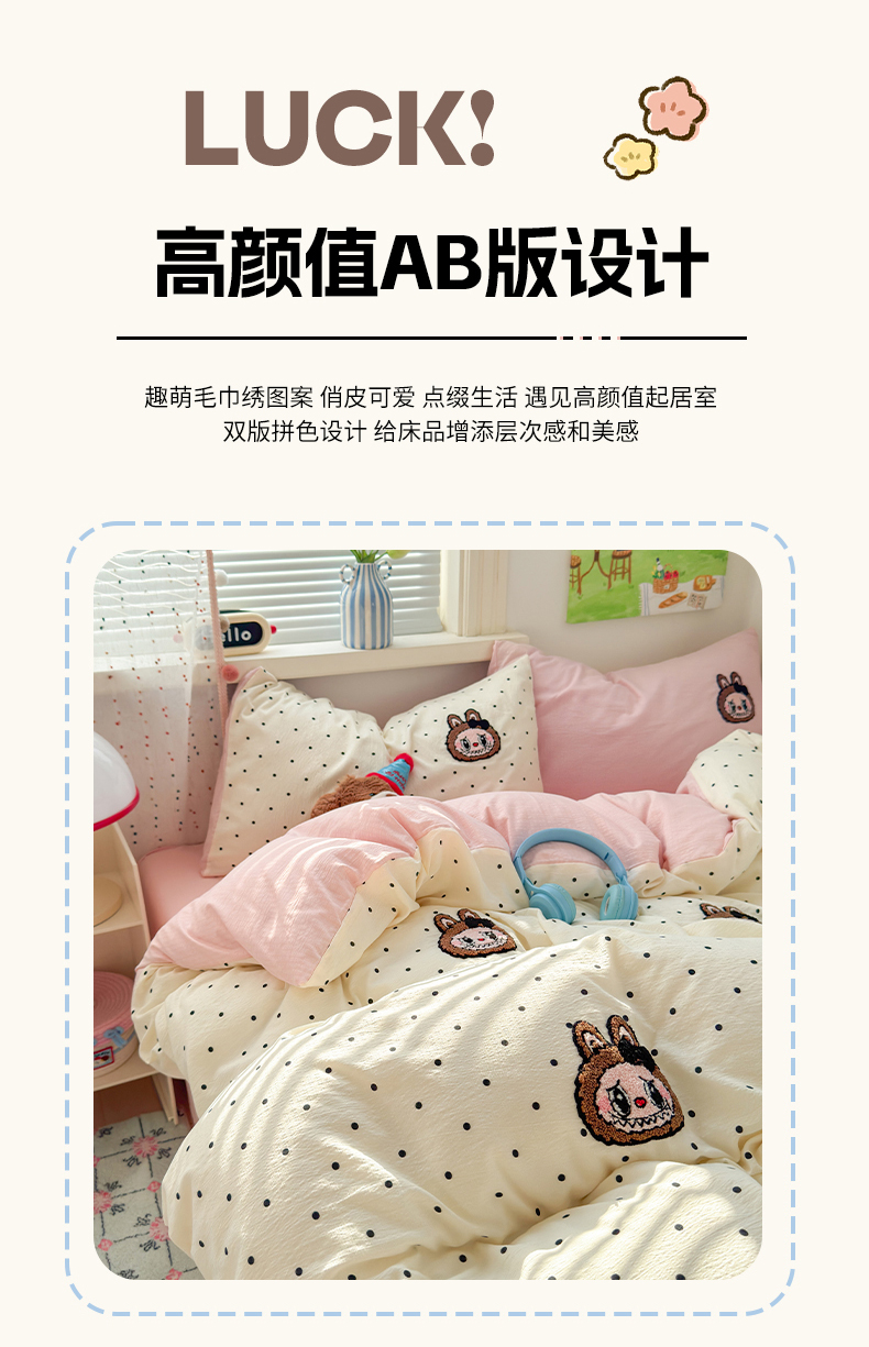 当前位置: 91家纺网 > 商品网购 > 床品套件 > 四件套 > 毛巾绣四件套 > 罗亿家纺 2025新款云感双层纱卡通毛巾绣四件套(拉布布系列场景二) 蝴蝶结小布-粉玉