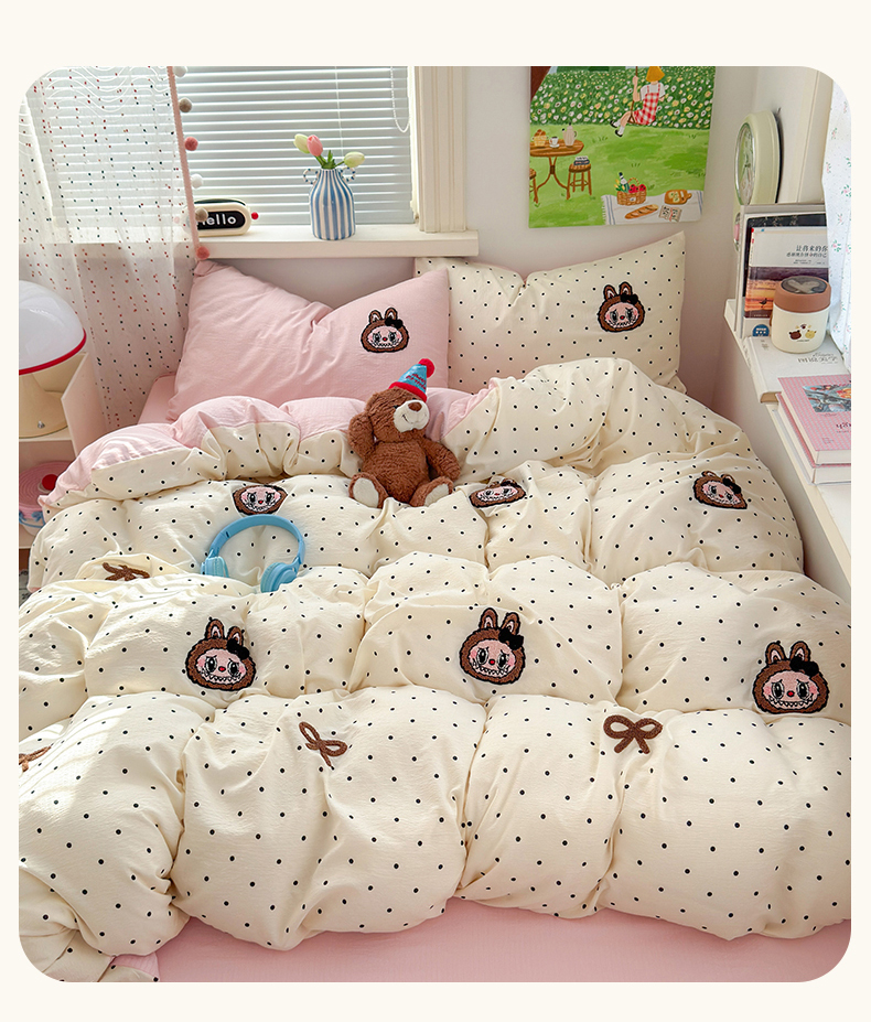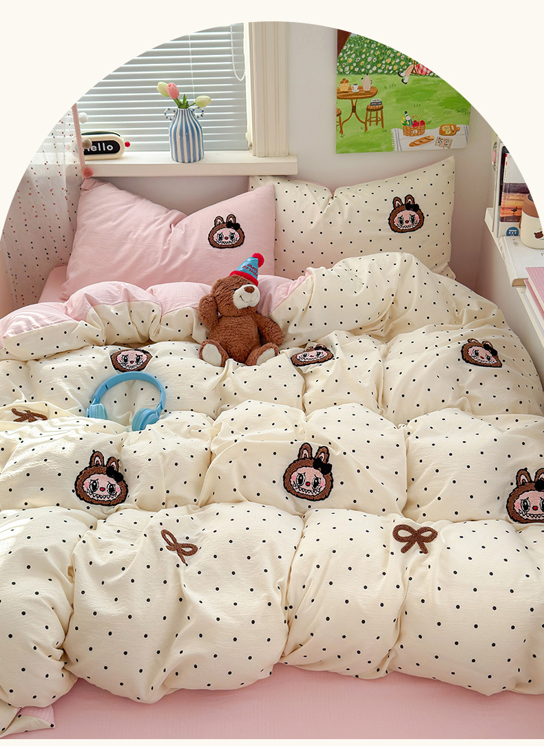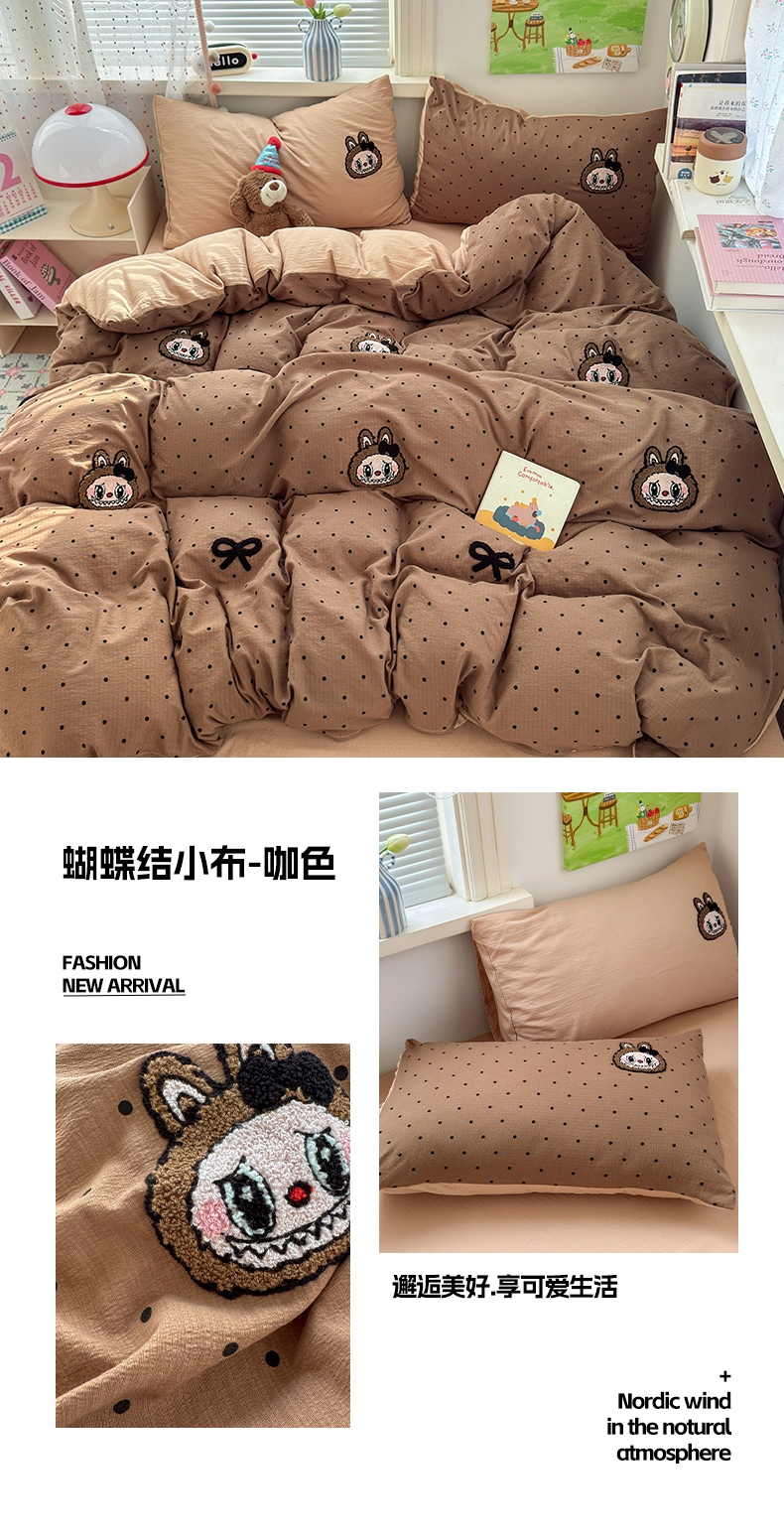 当前位置: 91家纺网 > 商品网购 > 床品套件 > 四件套 > 毛巾绣四件套 > 罗亿家纺 2025新款云感双层纱卡通毛巾绣四件套(拉布布系列场景二) 蝴蝶结小布-粉玉