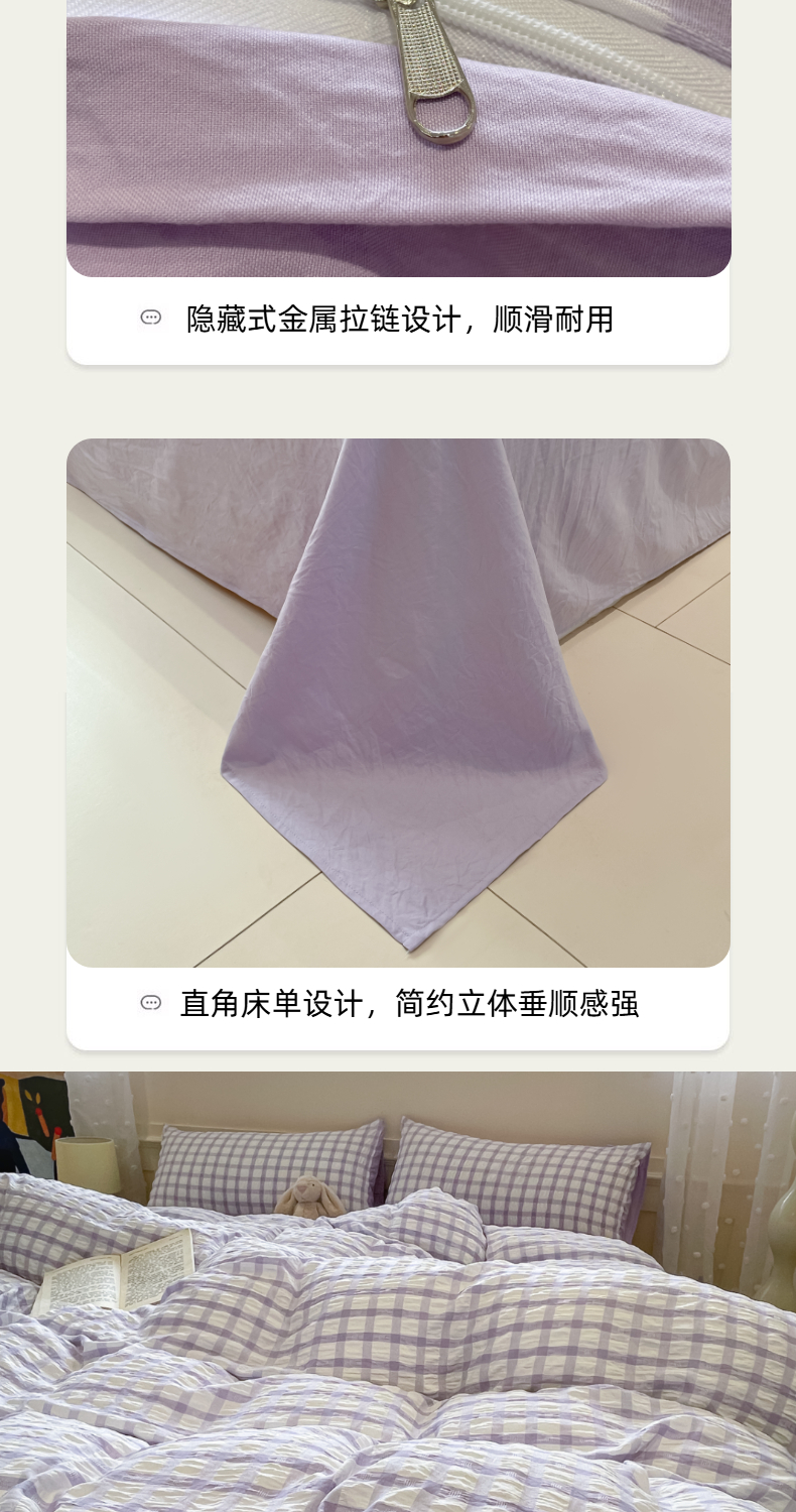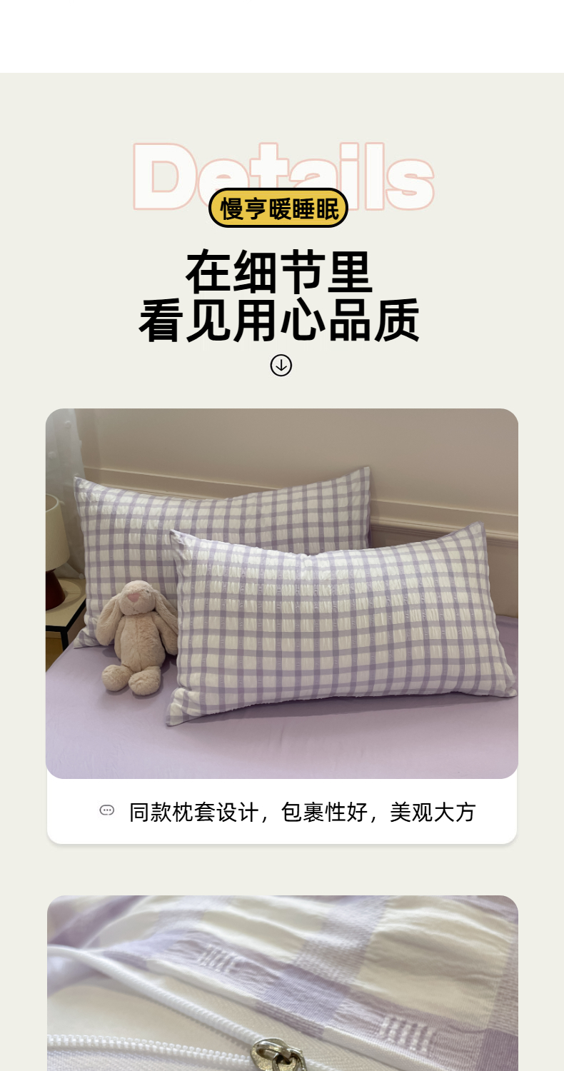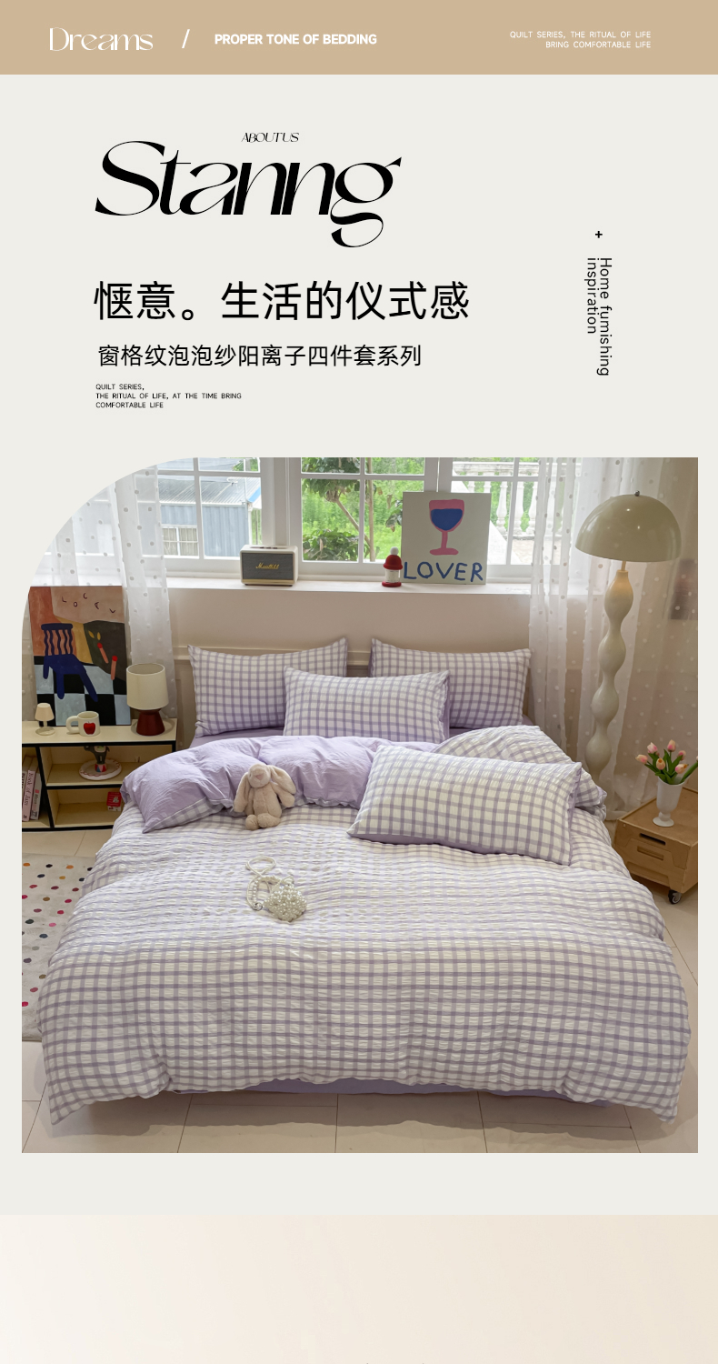 当前位置: 91家纺网 > 商品网购 > 床品套件 > 四件套 > 其它四件套 > 凯洛奇 2025新款窗格纹泡泡纱阳离子四件套 窗格纹泡泡纱-梦幻紫(提供买家秀)