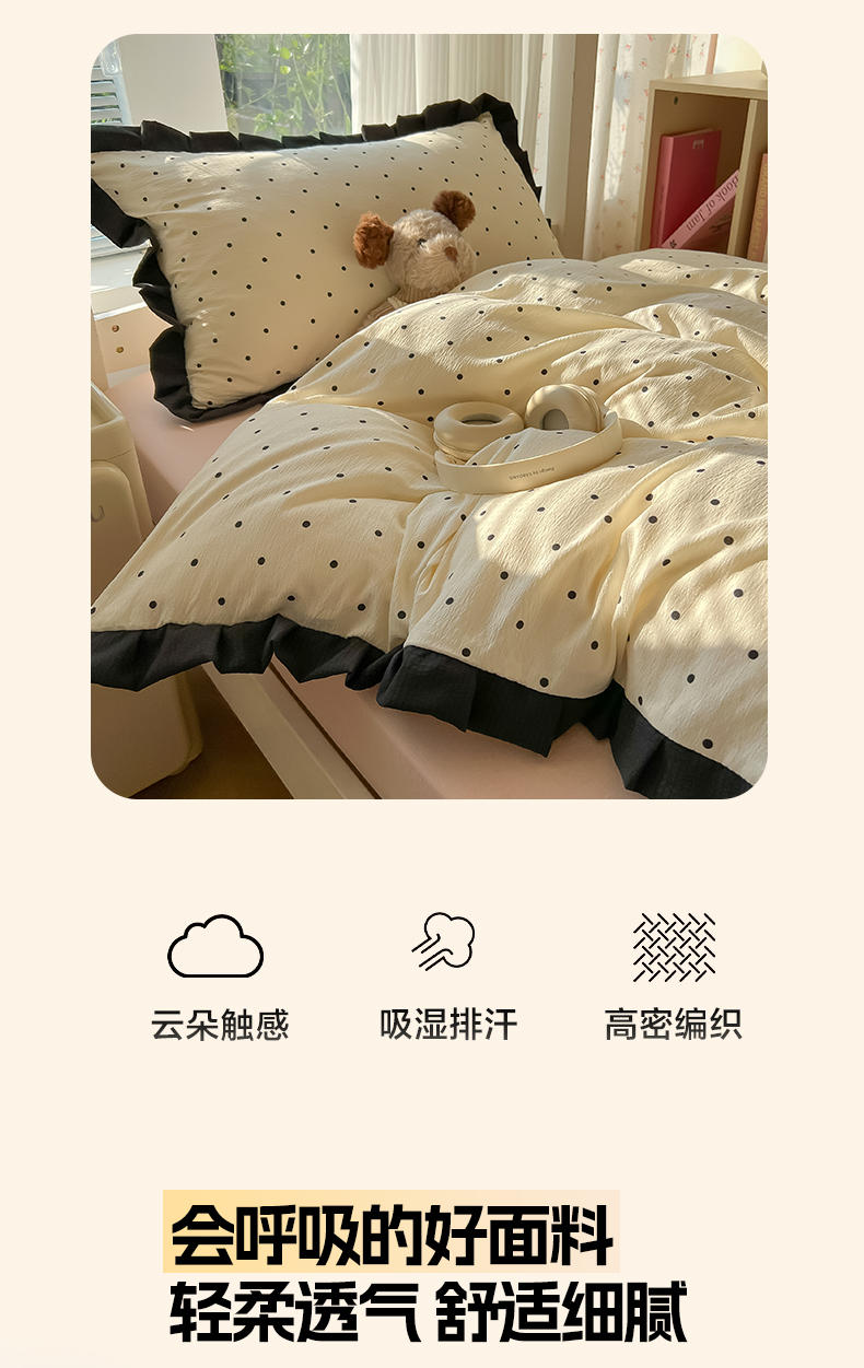 (总)韩巢家纺 2025新款小波点学生宿舍寝室上下铺三件套开学季花边被套四件套
