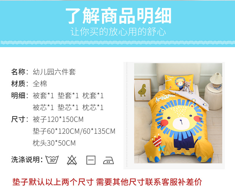 当前位置: 91家纺网 > 商品网购 > 床品套件 > 多件套 > 多件套 > 2025新品全棉大版幼儿园三件套儿童被褥六件套宝宝午睡入园婴儿床床上用品 甜心狮子