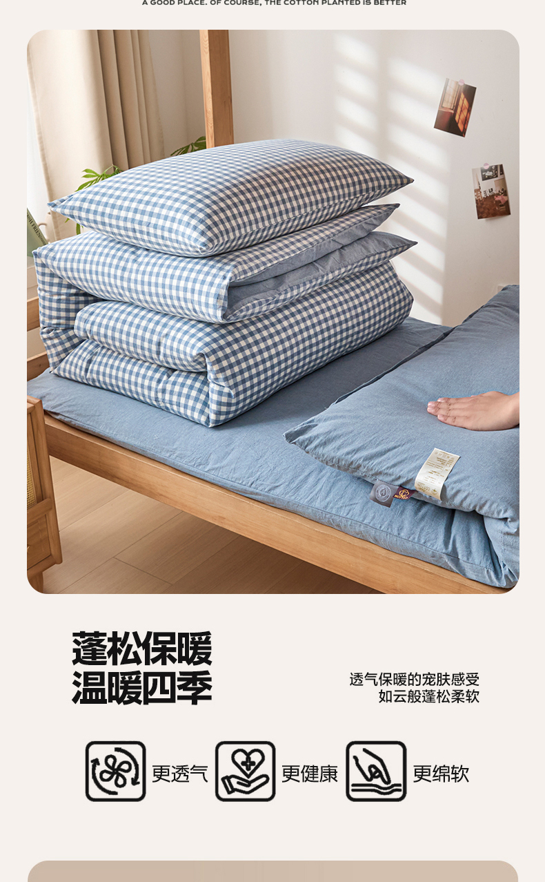 商品名称:爱屋及屋 2025新款水洗棉学生季大礼包学生宿舍六件套棉花被+棉花垫子+枕头+三件套一站式全套 蓝小格