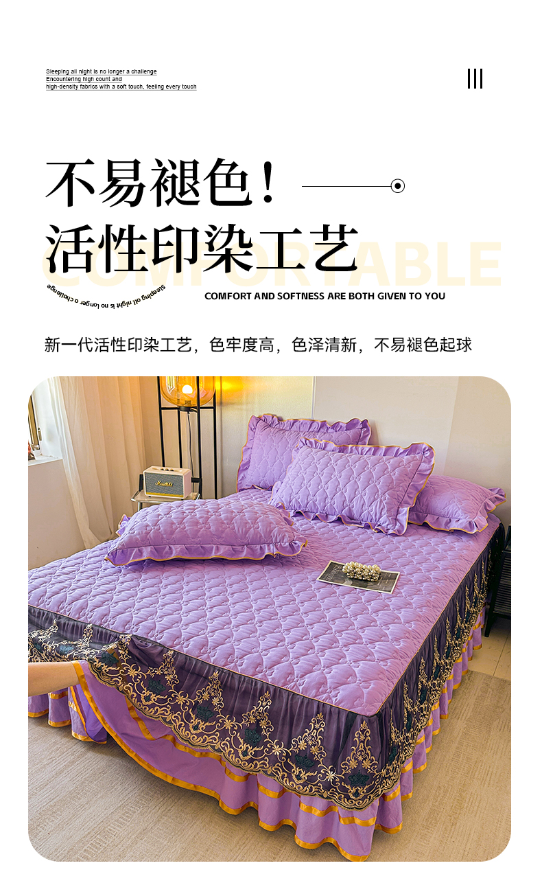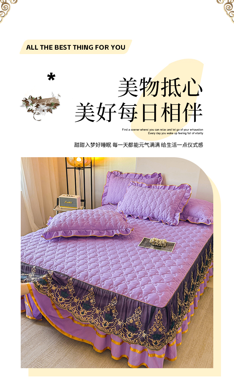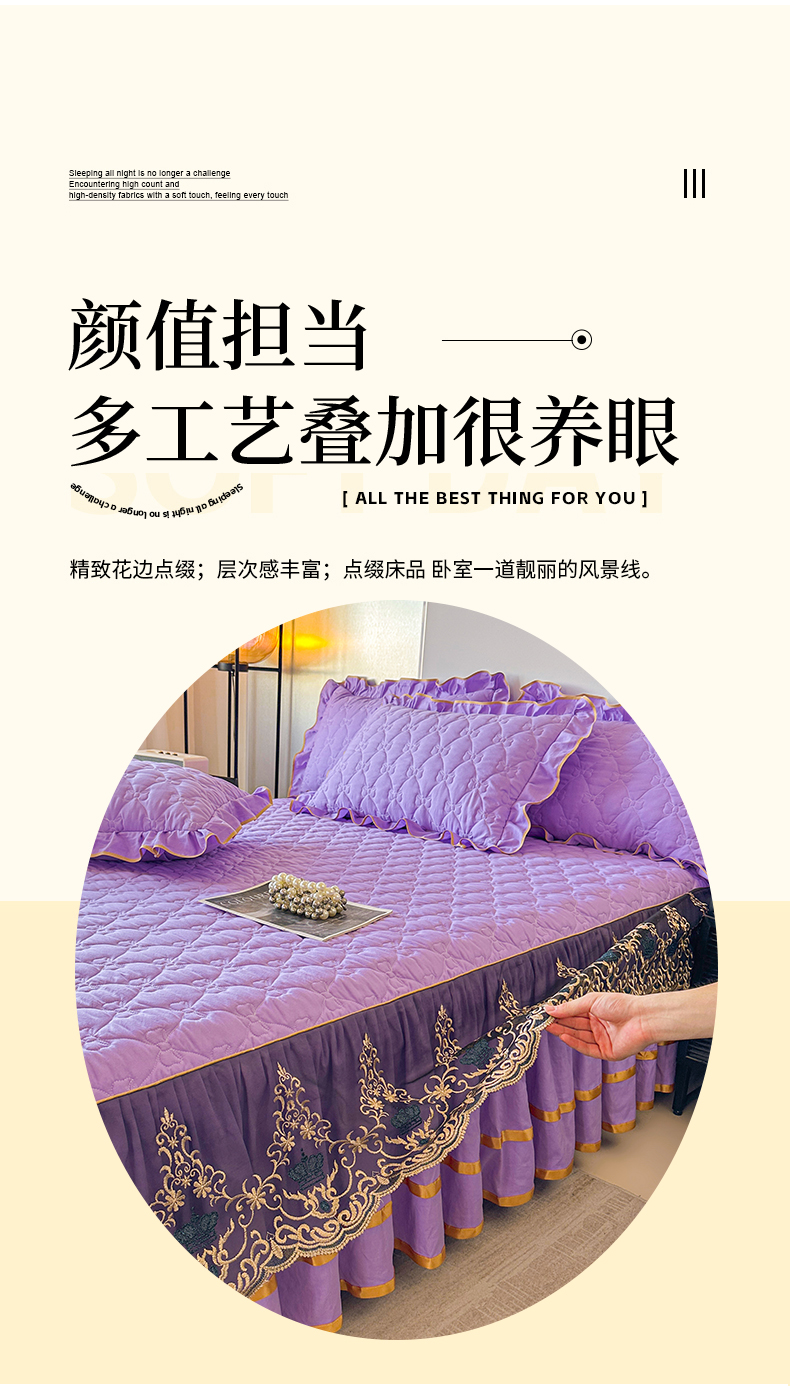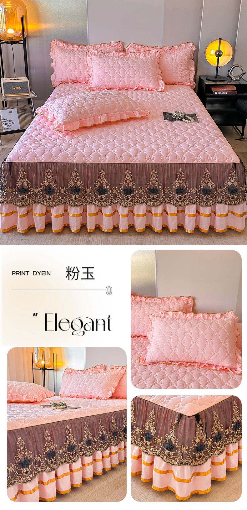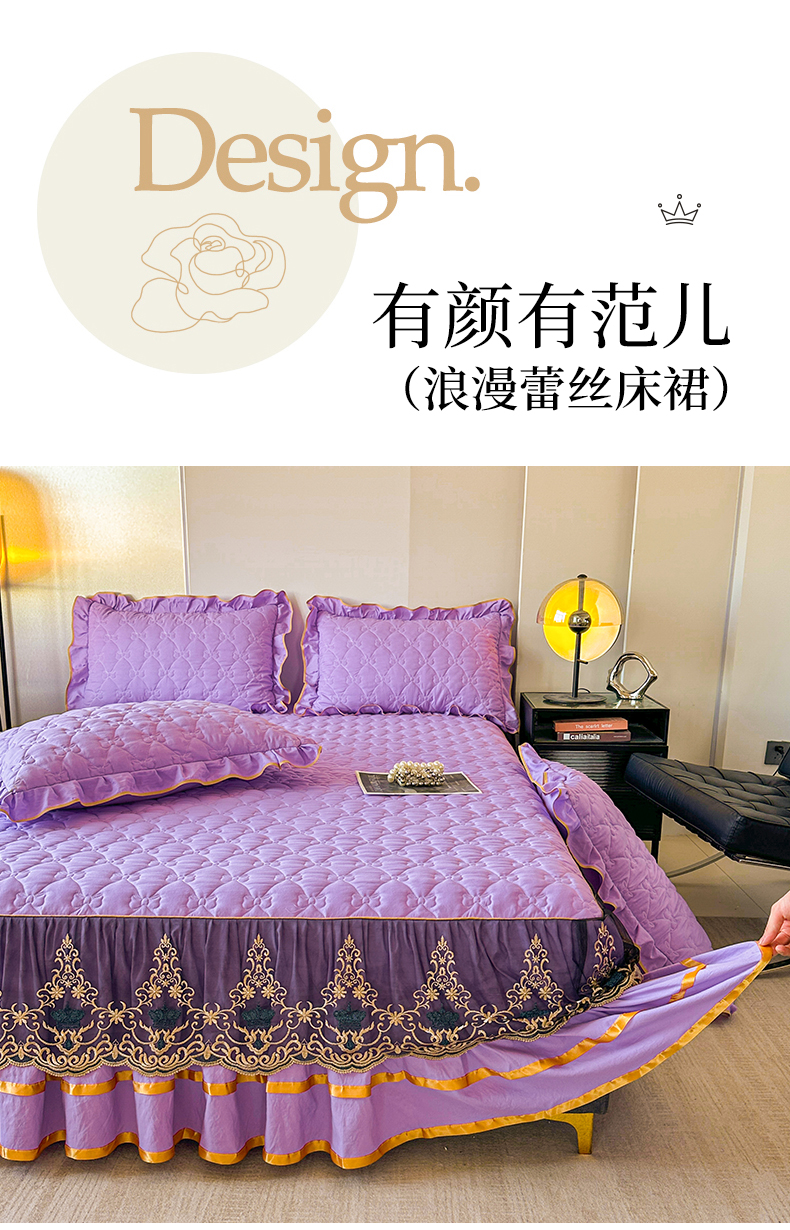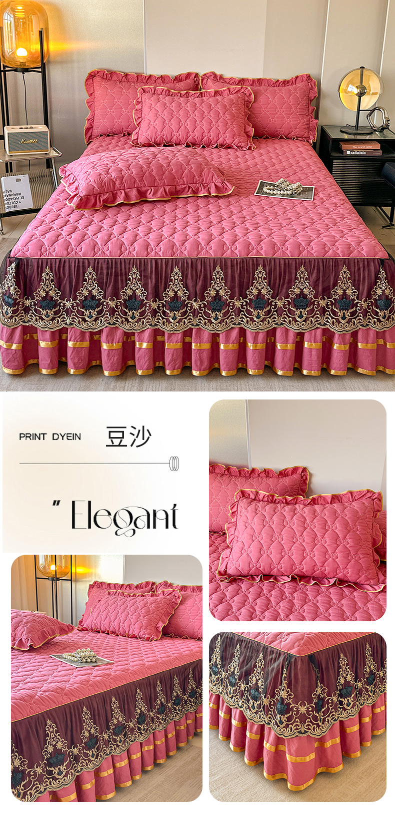 (总)屹成家纺2025新款水晶绒夹棉绗缝蕾丝床裙三件套(塞纳河畔)床裙单件起售价不低于105元,大红,豆沙,翡翠绿,粉玉,橄榄绿,蔚蓝,银灰