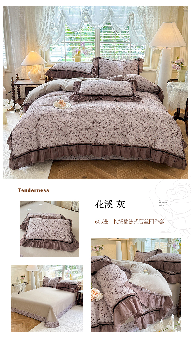 商品名称:巧玲珑 2025新款法式蕾丝印花60支进口长绒棉四件套 花溪-灰