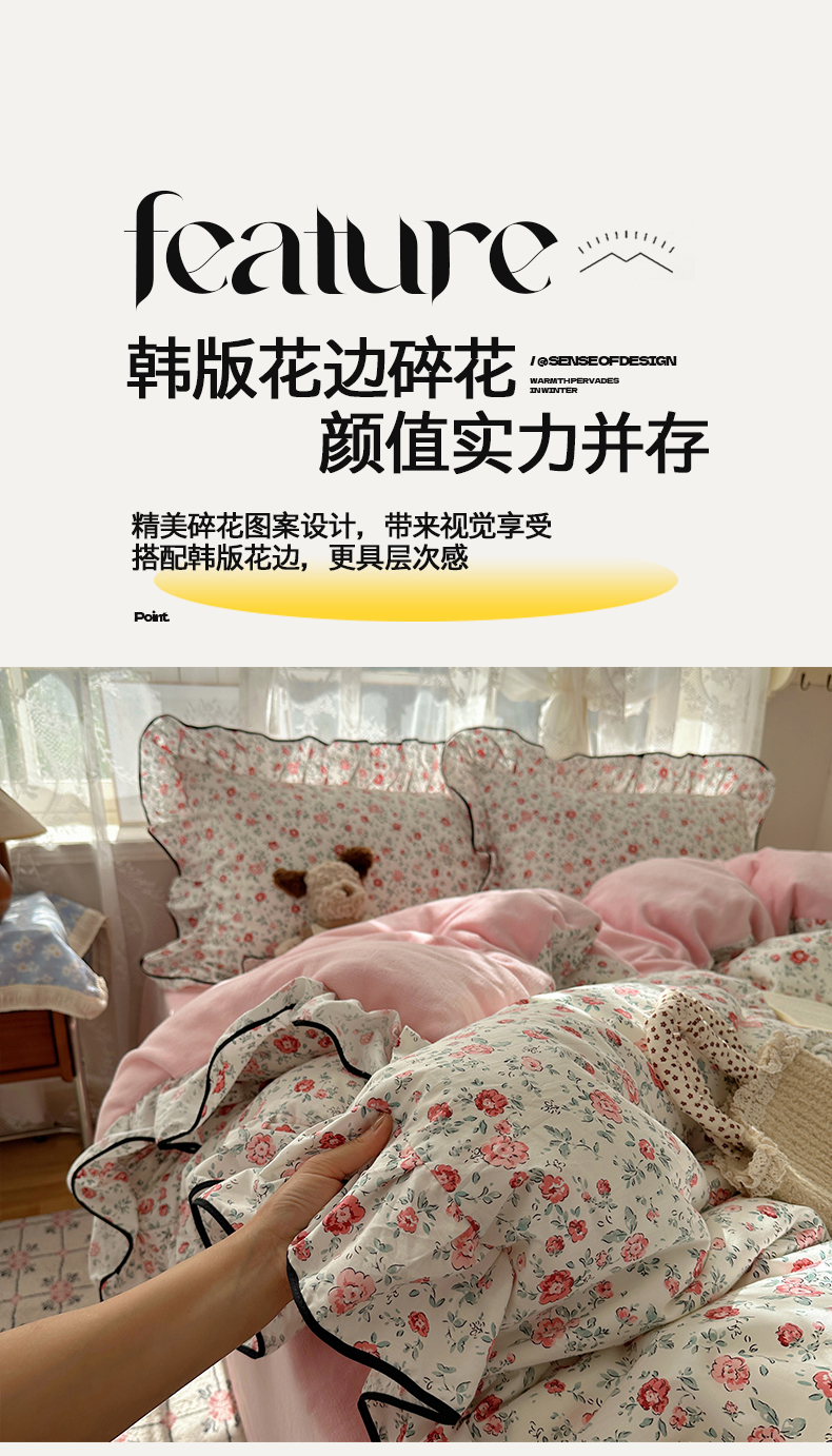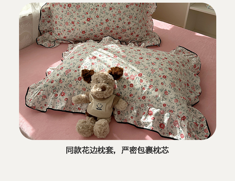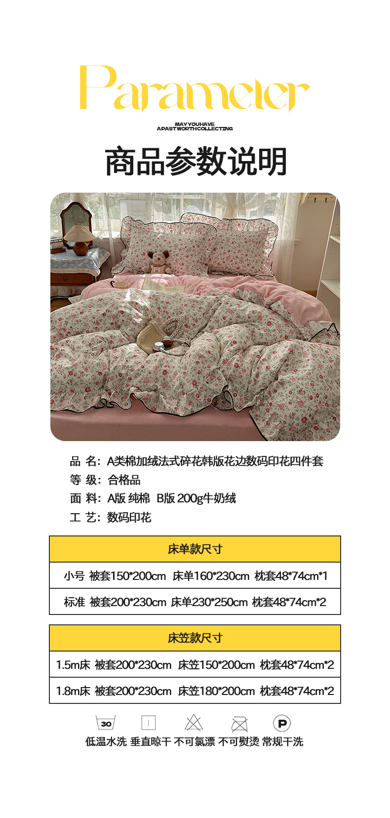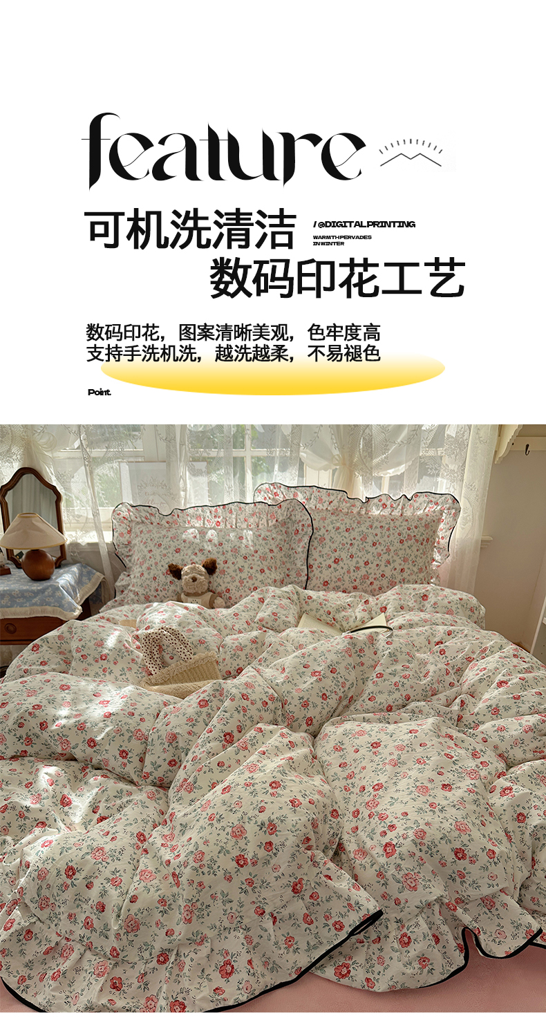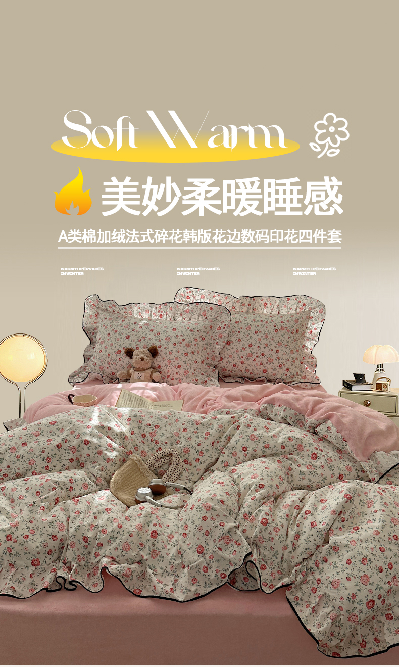 商品名称:桃子家居 2025新款A类纯棉数码印花法式碎花棉加绒韩版花边碎花加厚牛奶绒四件套 棉加绒-花边茉拉