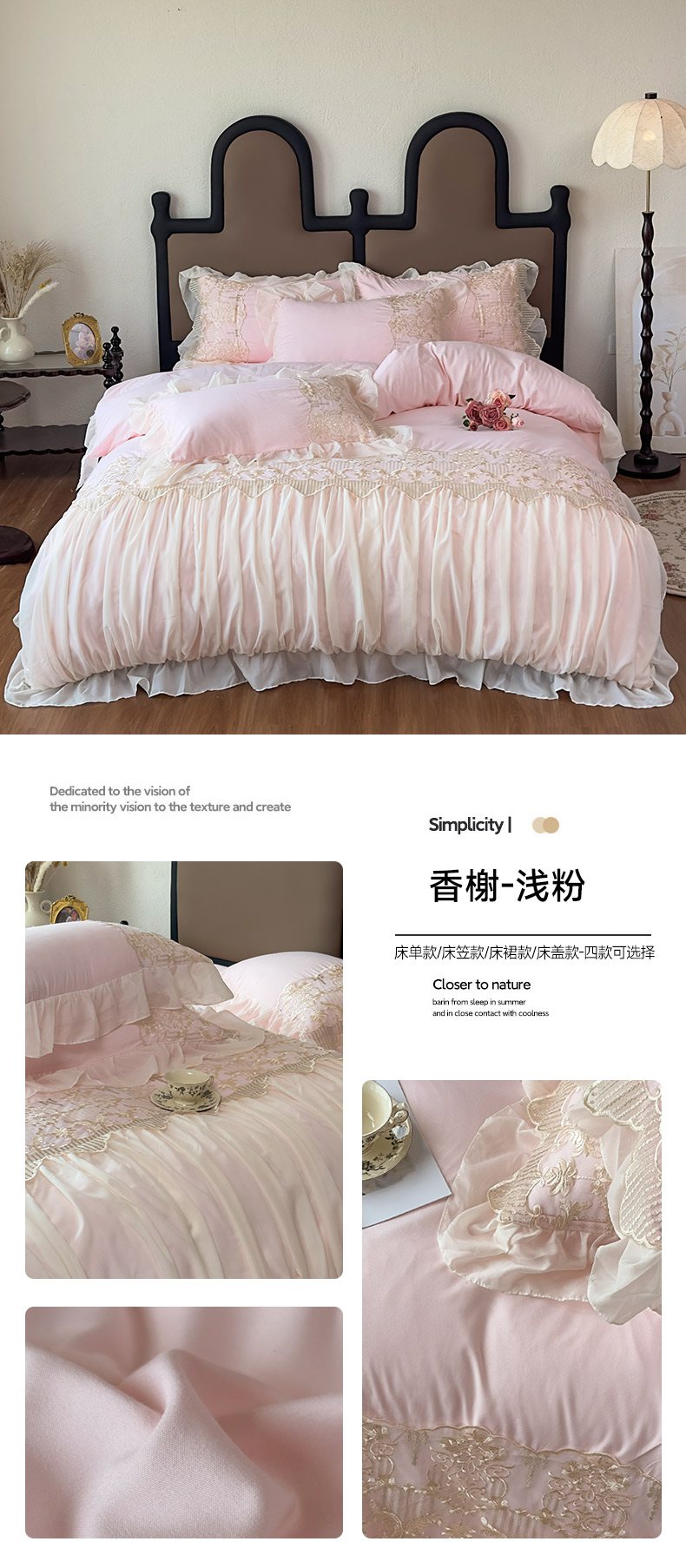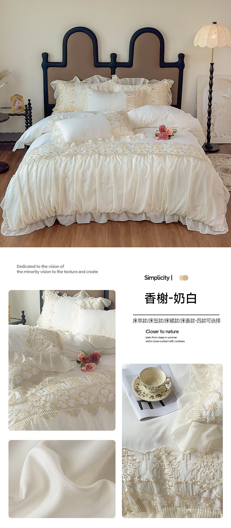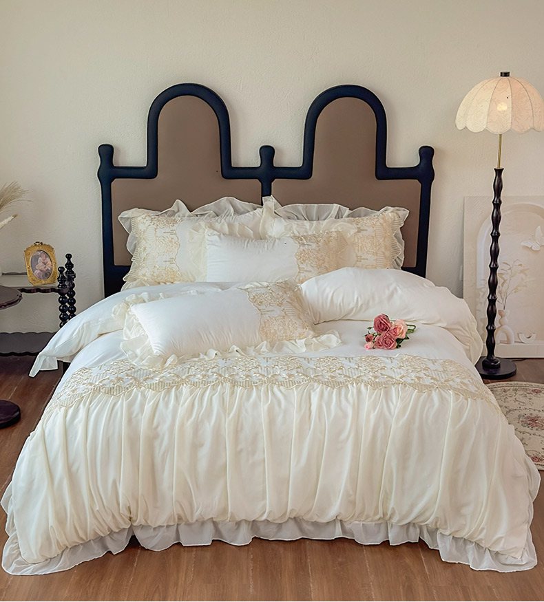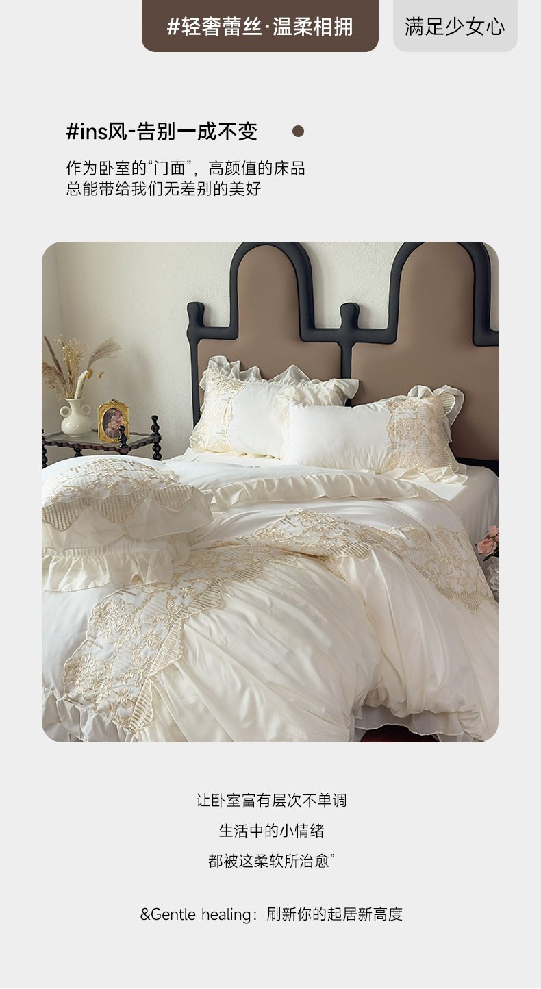 当前位置: 91家纺网 > 商品网购 > 床品套件 > 四件套 > 其它四件套 > 鼎丰家纺 2025新款蕾丝刺绣雪纺花边四件套 香榭-米色