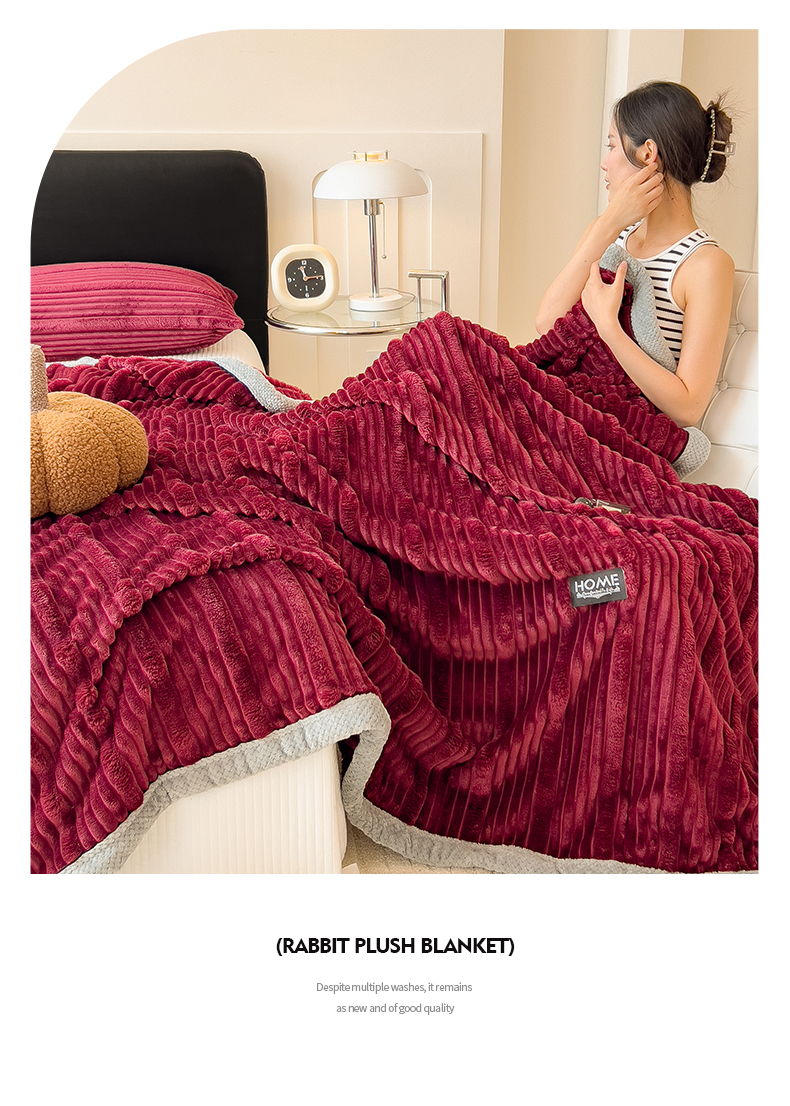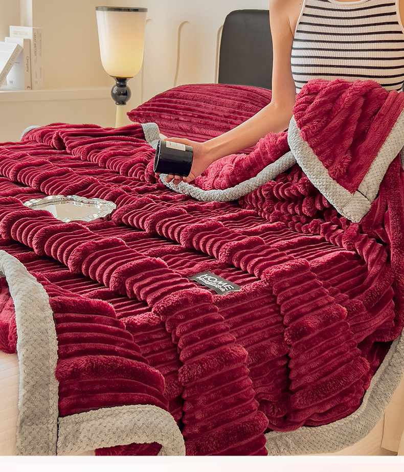 商品名称:欧邦 2025新款子母条灰边毛毯毯子多功能盖毯 子母条-酒红灰边