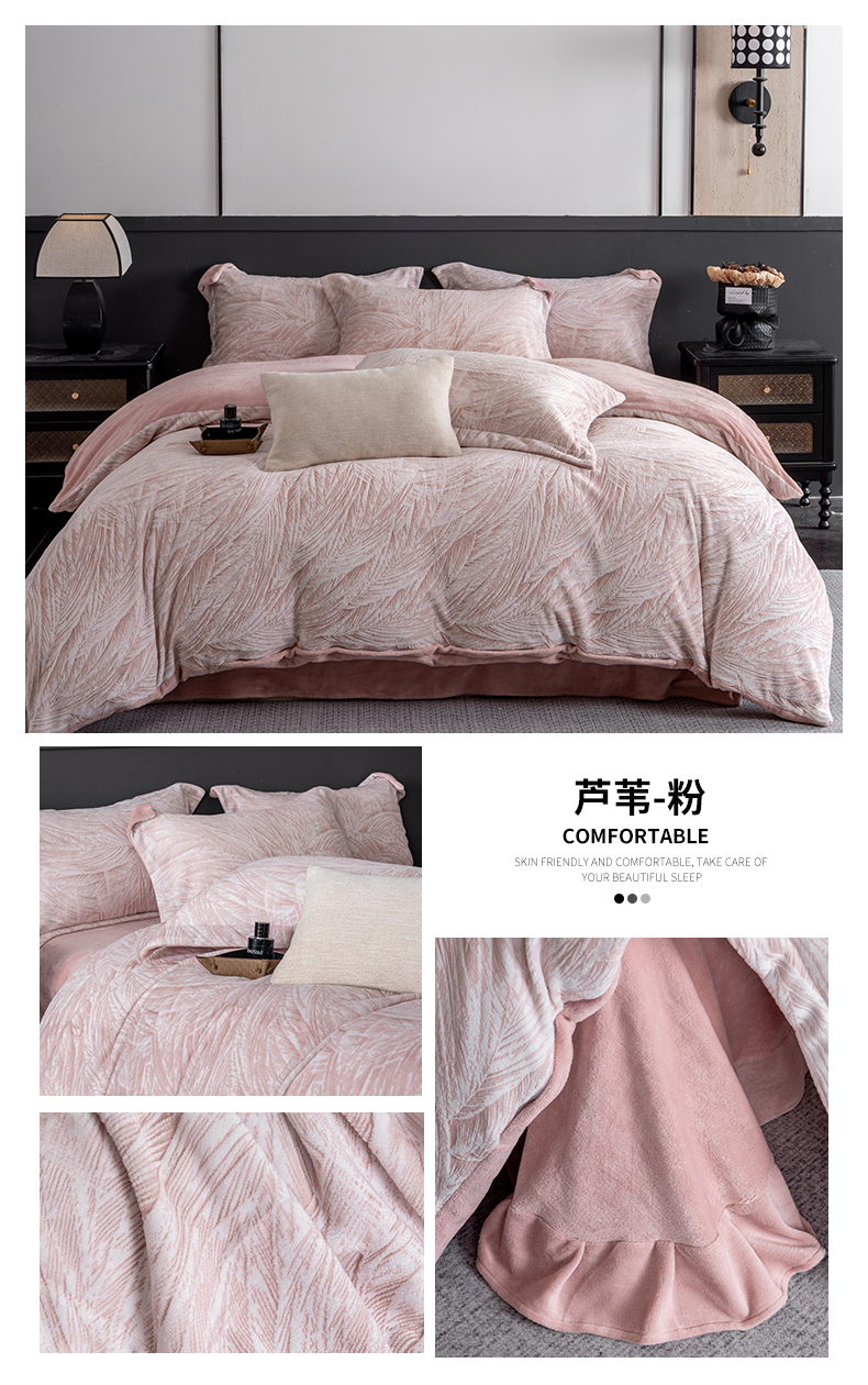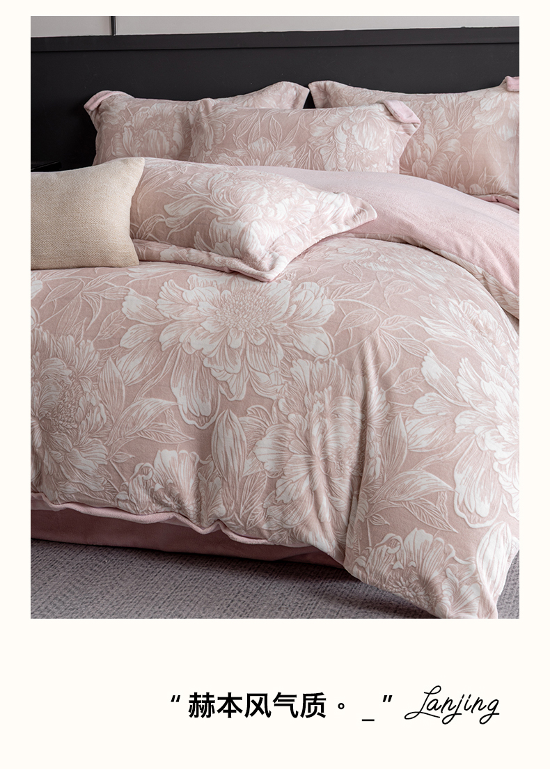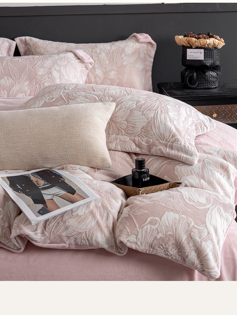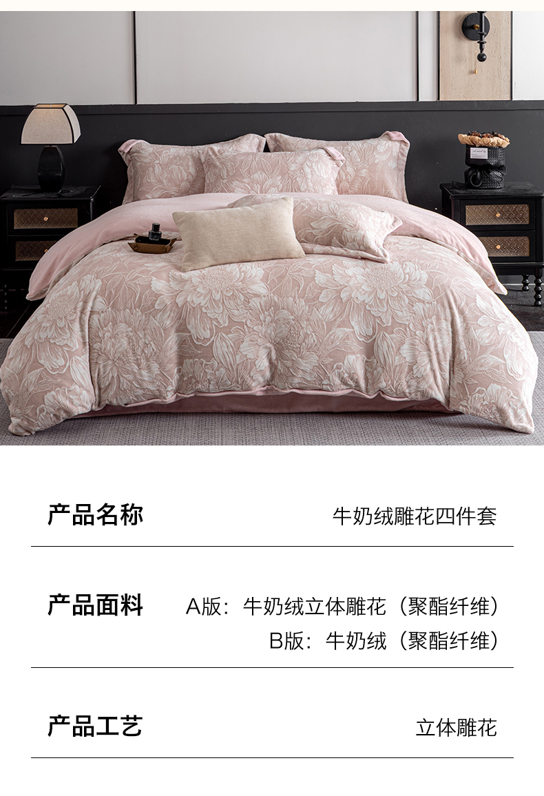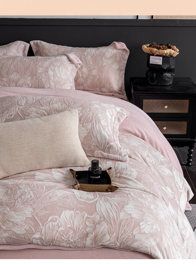 商品名称:罗优家纺 2025新款牛奶绒雕花绒四件套 芳华绮丽-粉