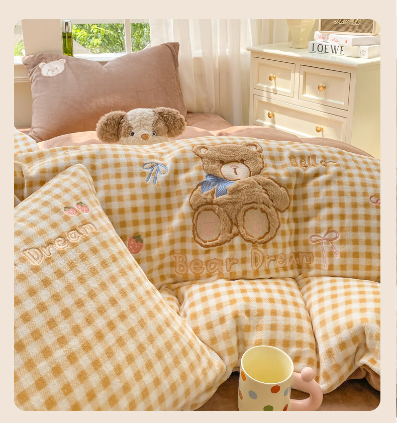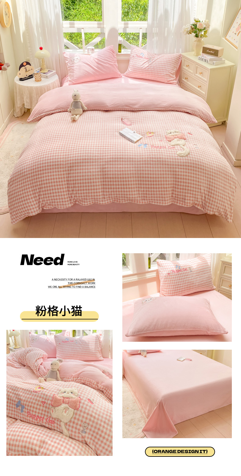 (总)雨帆家纺 2025新款可爱卡通牛奶绒贴布绣四件套,粉格小猫,黄格+咖小熊,蓝格西高地,奶粉小猫,奶咖小熊,奶油蓝西高地