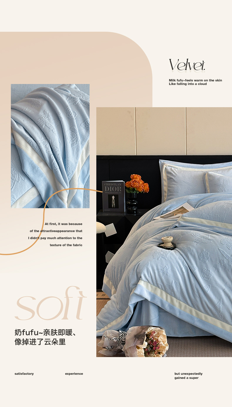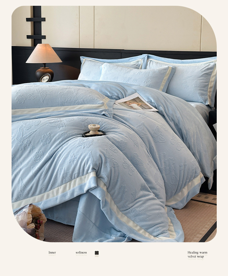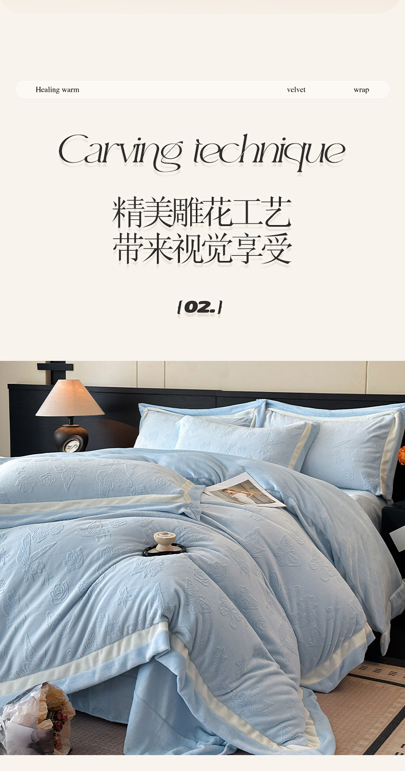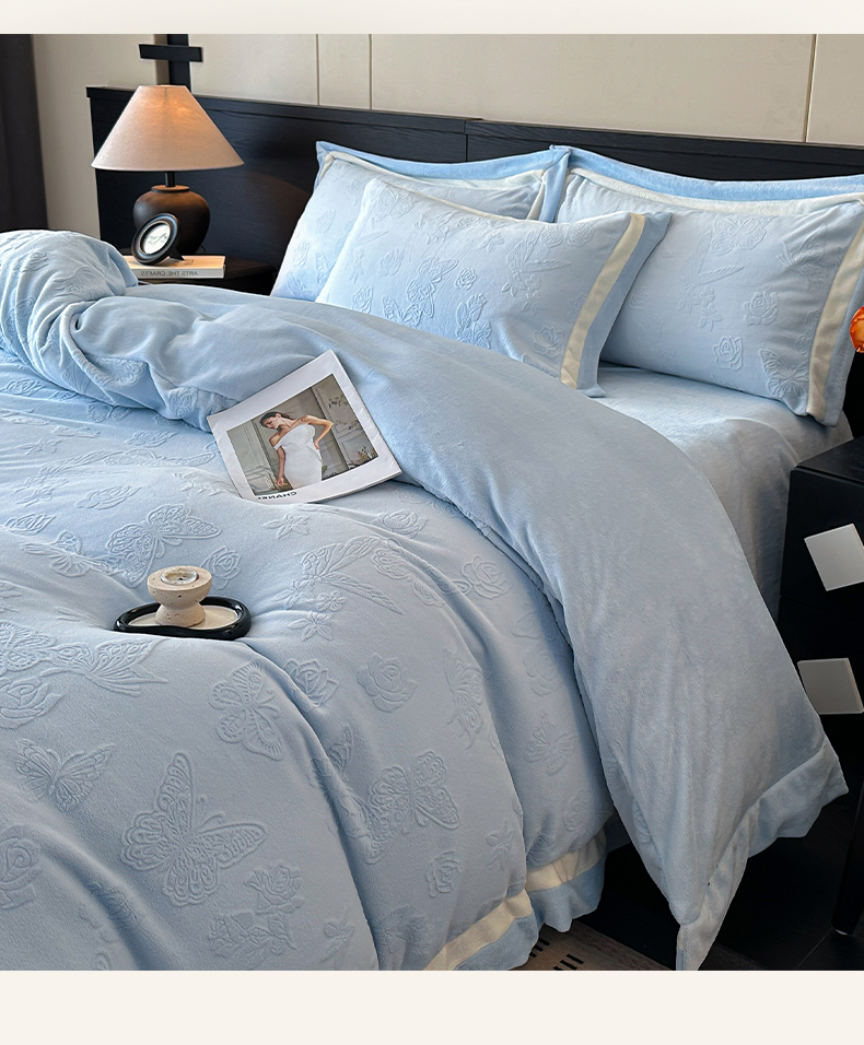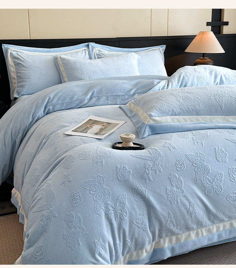 绘萱家居 2025新品热款高密消光双拼边雕花牛奶绒四件套拼角纯色 漫花蝶舞-兰