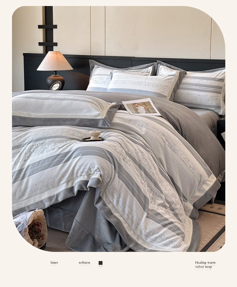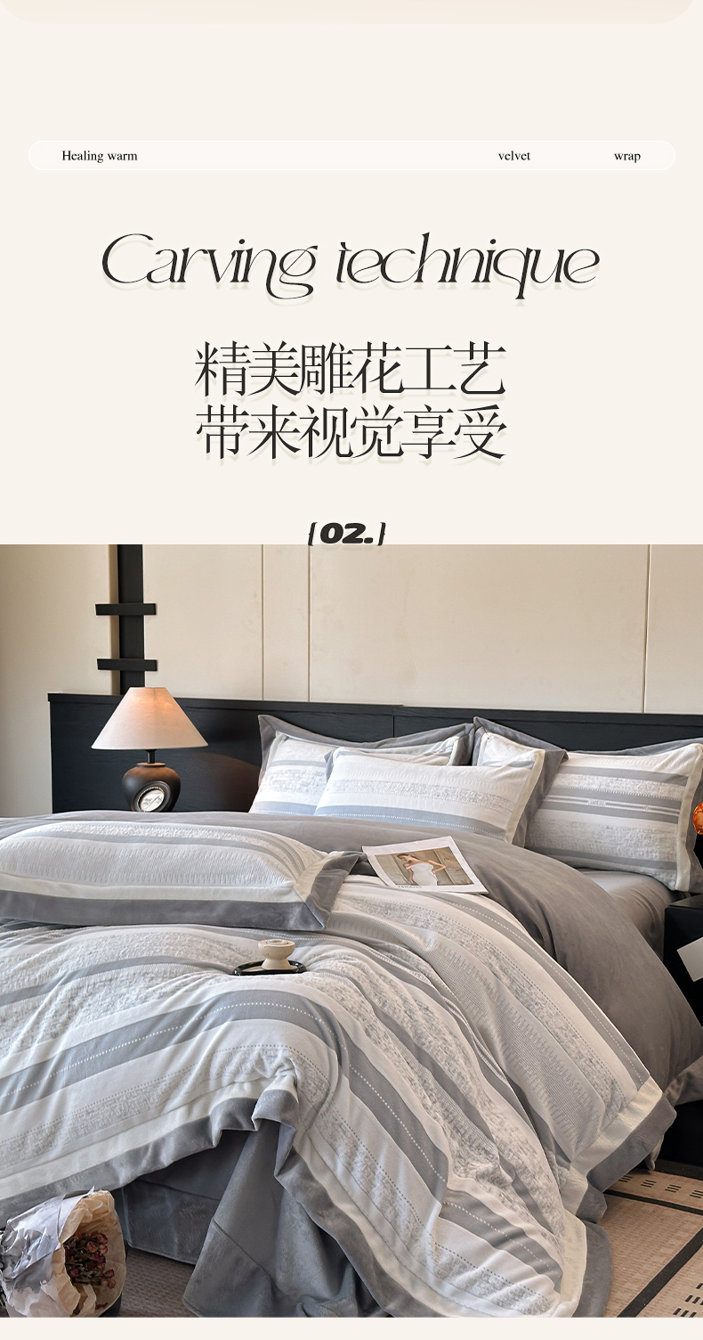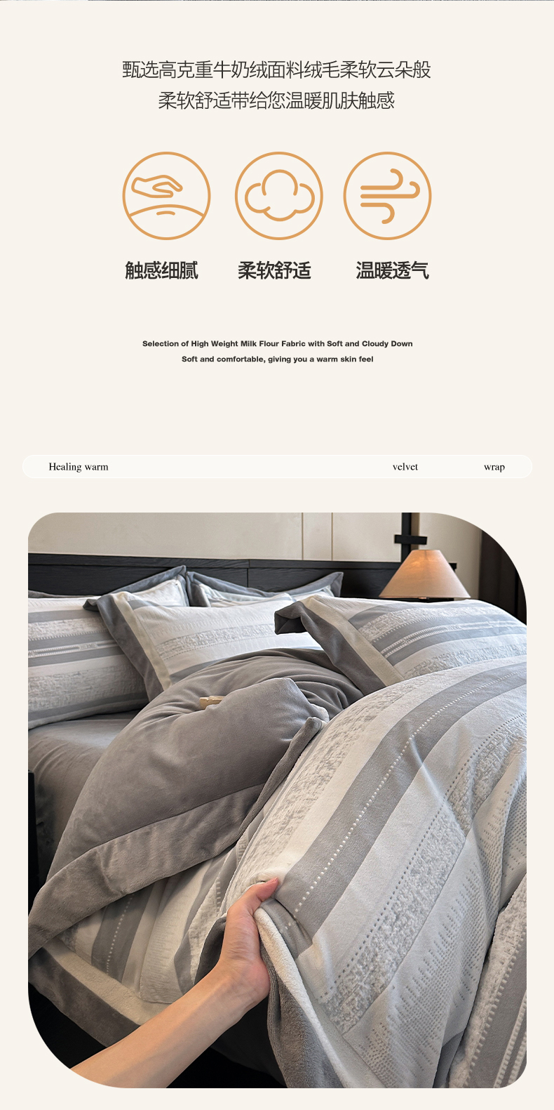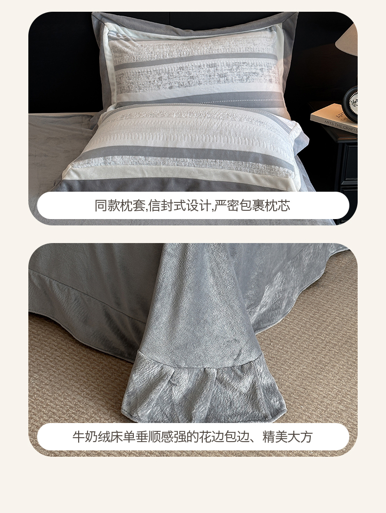 绘萱家居 2025新品热款高密消光双拼边雕花牛奶绒四件套拼角纯色 维多利亚-灰
