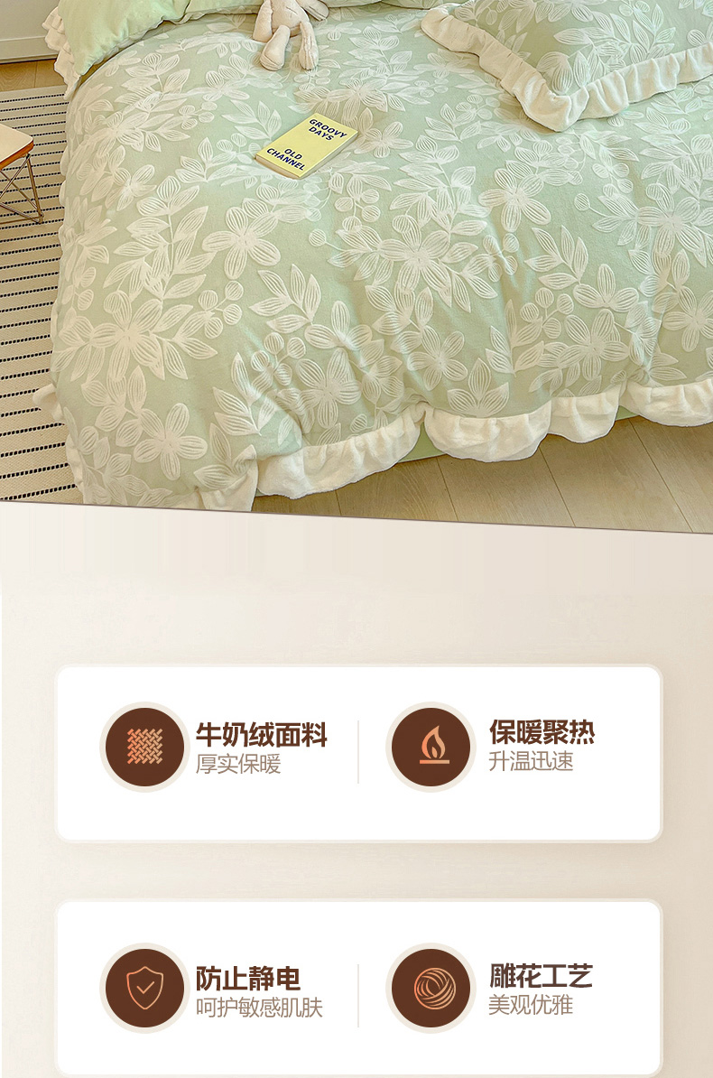 (总)琪格格纺织 2025新款全消光小清新花边款雕花牛奶绒四件套,雕花绒花边-爱在秋冬浅绿,雕花花边-秋色宜人酒红,雕花花边绒- 雏菊 粉玉,雕花绒花边- 阿芙朵 粉,雕花绒花边 安妮花苑 粉,雕花绒花边 安妮花苑 黄,雕花绒花边 安妮花苑 绿,雕花绒花边 迪娅妮 粉,雕花绒花边 迪娅妮 浅绿,雕花绒花边 花丛小鹿 绿,雕花绒花边 摩尔庄园 粉玉,雕花绒花边 摩尔庄园 奶昔白,雕花绒花边 玉珠帘 奶昔白,雕花绒花边 枝枝叶叶 海棠绿,雕花绒花边 枝枝叶叶 黄,雕花绒花边 枝枝叶叶 浅绿,雕花绒花边-阿芙朵绿,雕花绒花边-爱在秋冬樱花粉