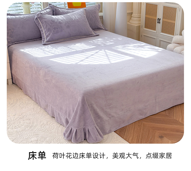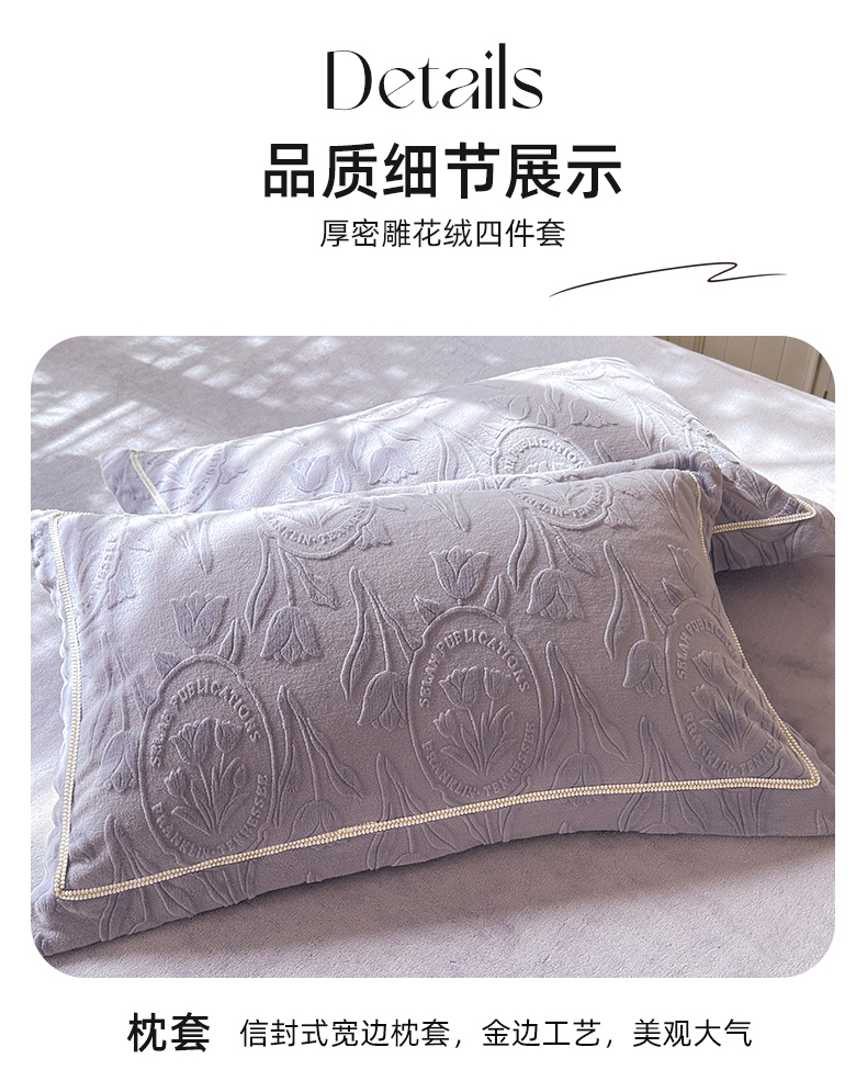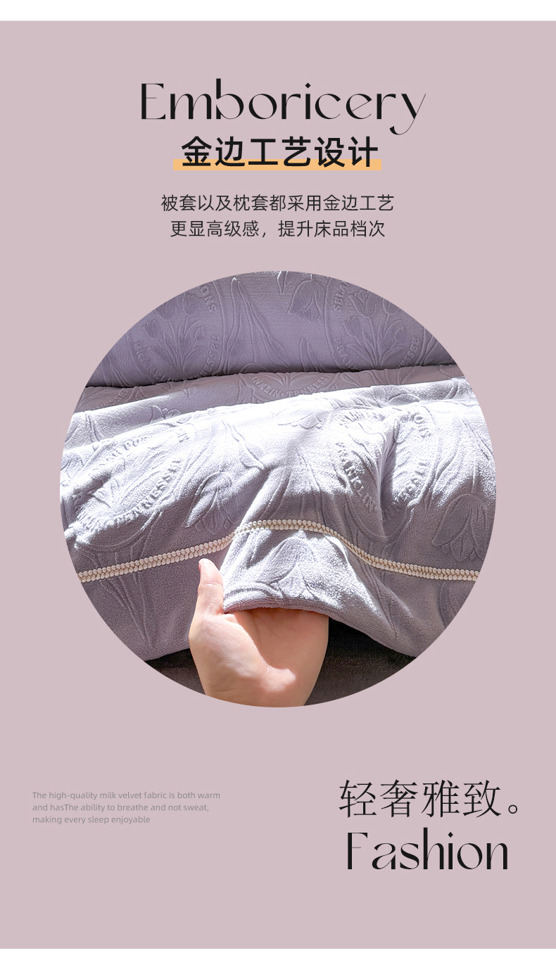 商品名称:艾唯希家纺 2025新款全消光雕花绒织带款四件套牛奶绒-雕花织带系列 郁金香-紫
