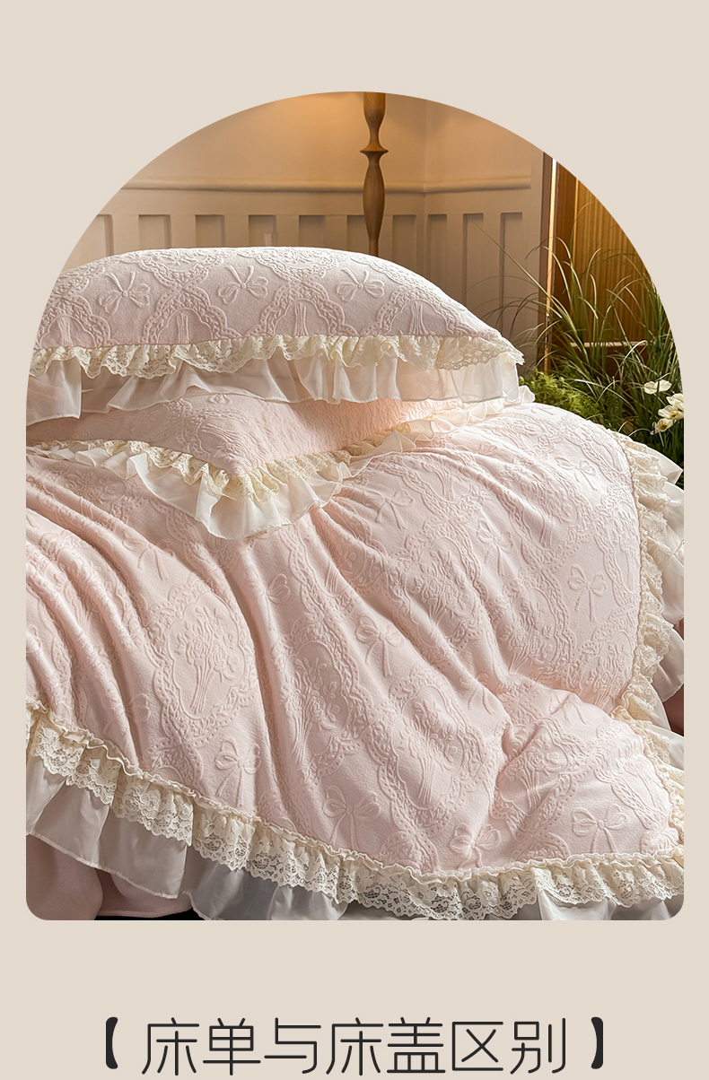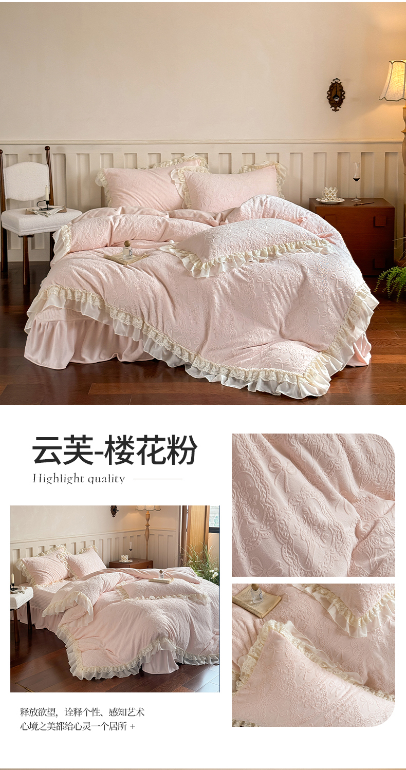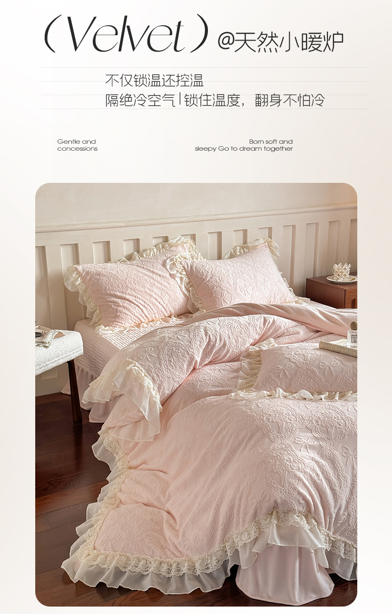 商品名称:满座家居 2025新款爆款全消光牛奶绒雕花四件套蕾丝花边仙女款床盖四件套-云芙云芙-楼花粉