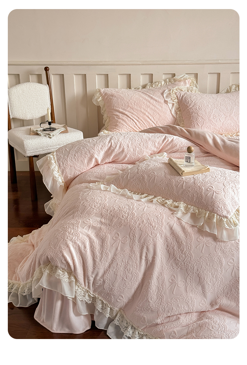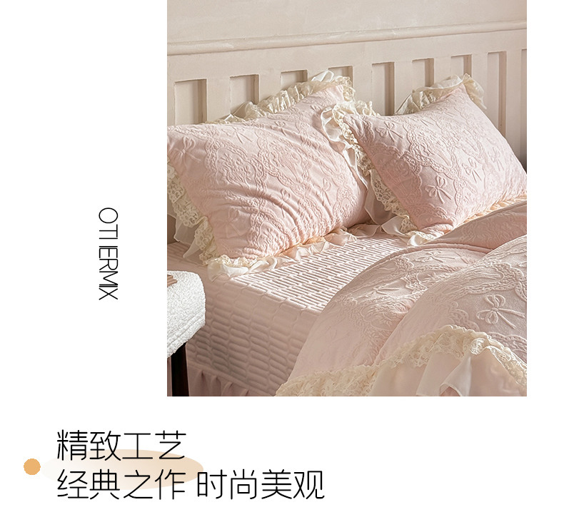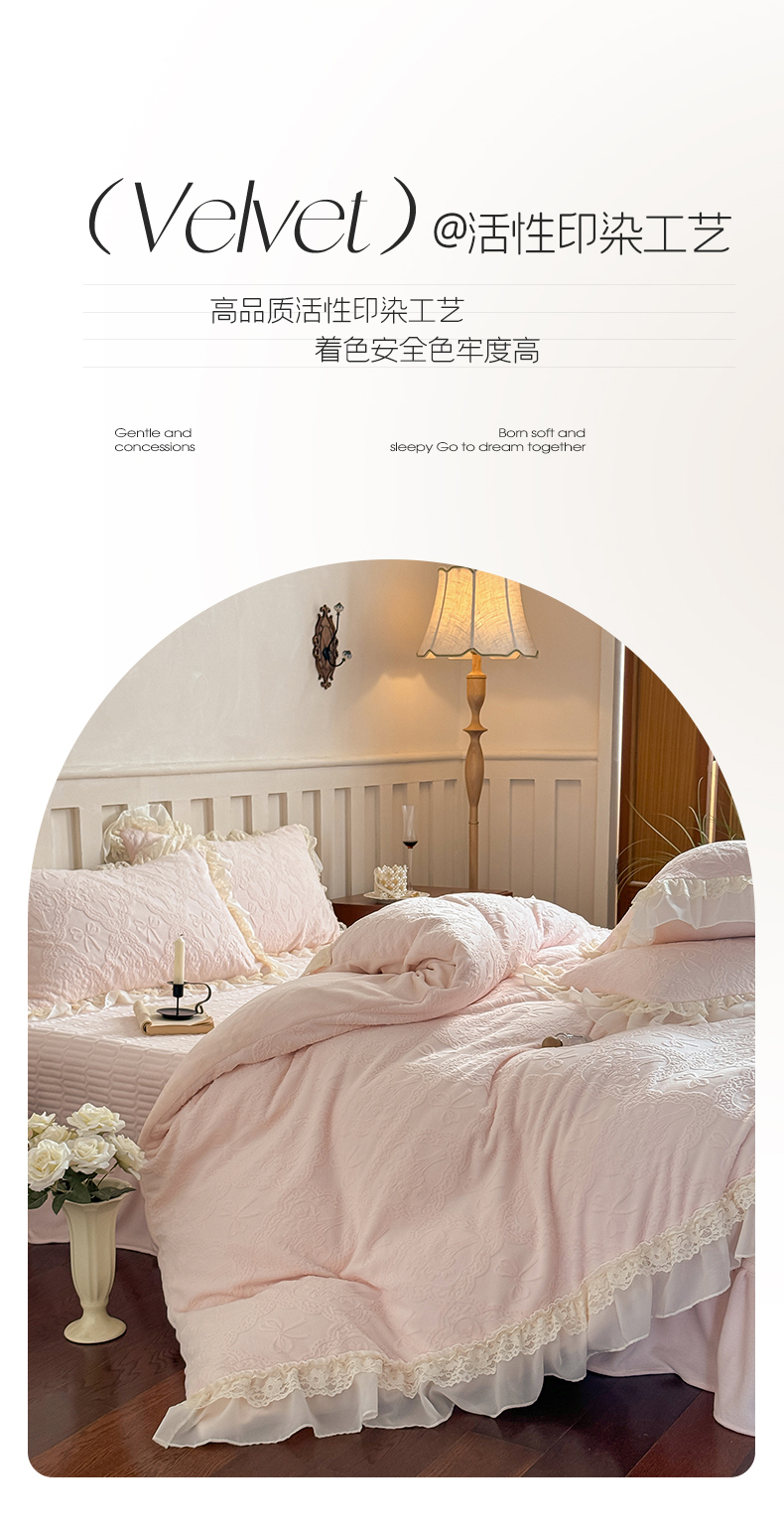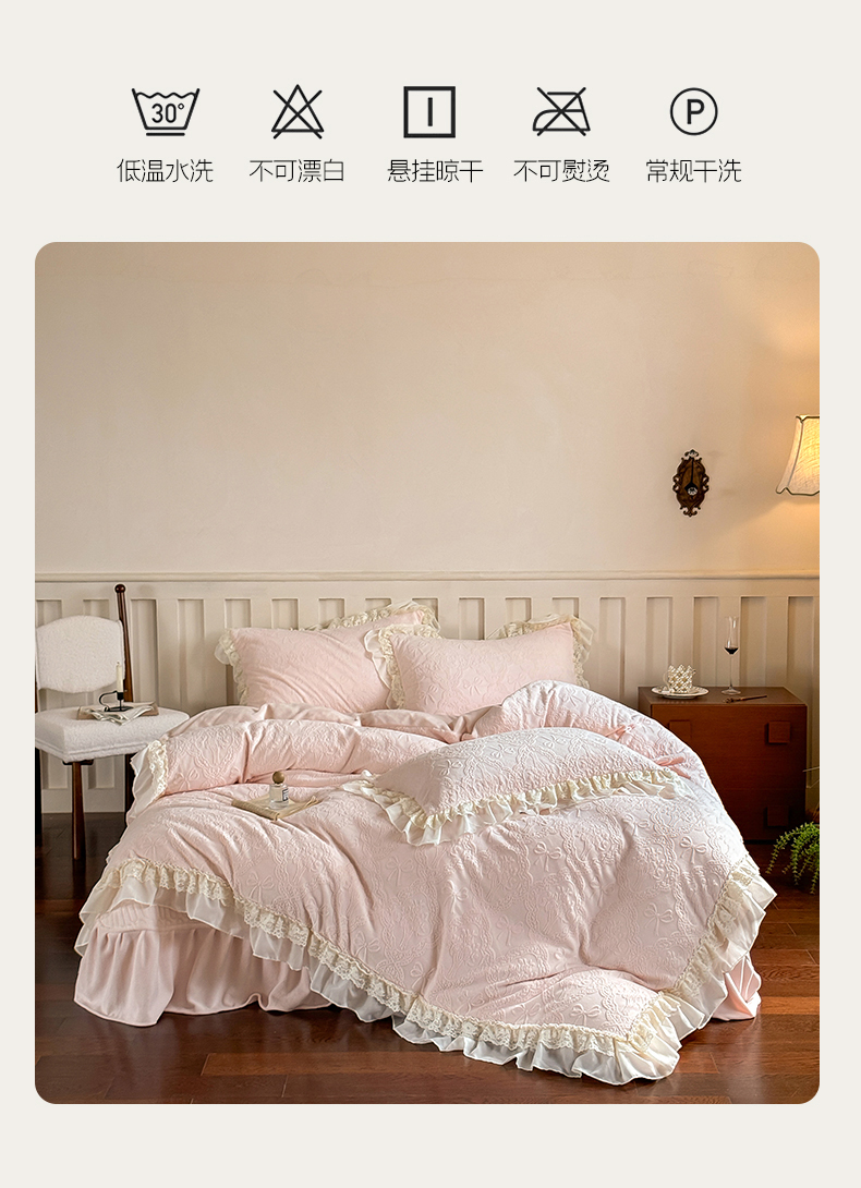 商品名称:满座家居 2025新款爆款全消光牛奶绒雕花四件套蕾丝花边仙女款床盖四件套-云芙云芙-楼花粉