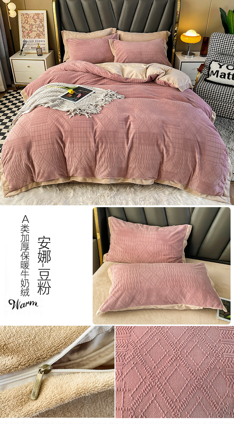(总)2024秋冬新款全消光拼角雕花绒牛奶绒四件套,安娜-豆粉,安娜-抹绿,安娜-奶油橙,典雅-豆粉,典雅-高级灰,典雅-抹绿,典雅-奶油橙,慕丝-豆沙,慕丝-玫瑰粉,慕丝-奶油橙