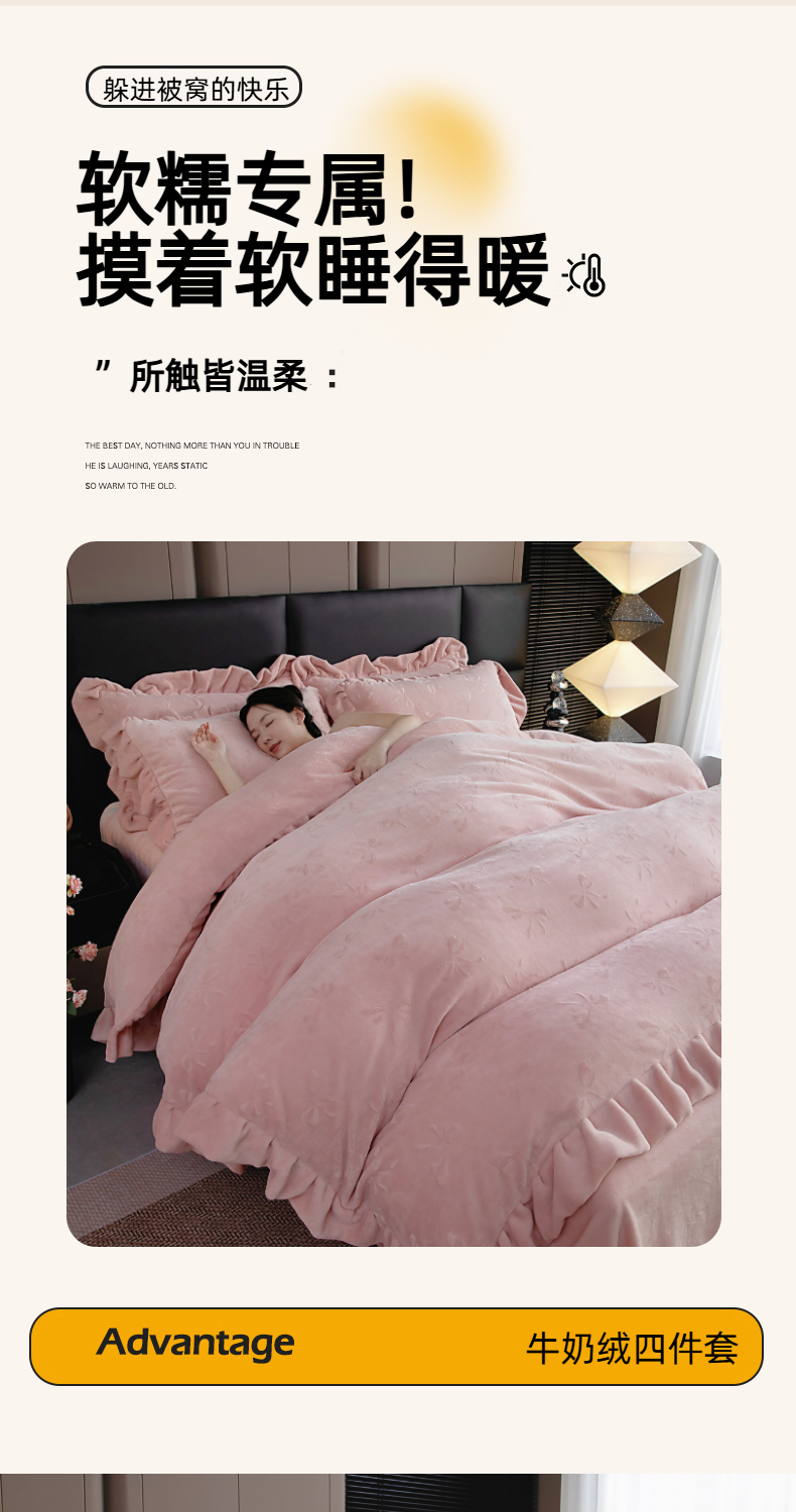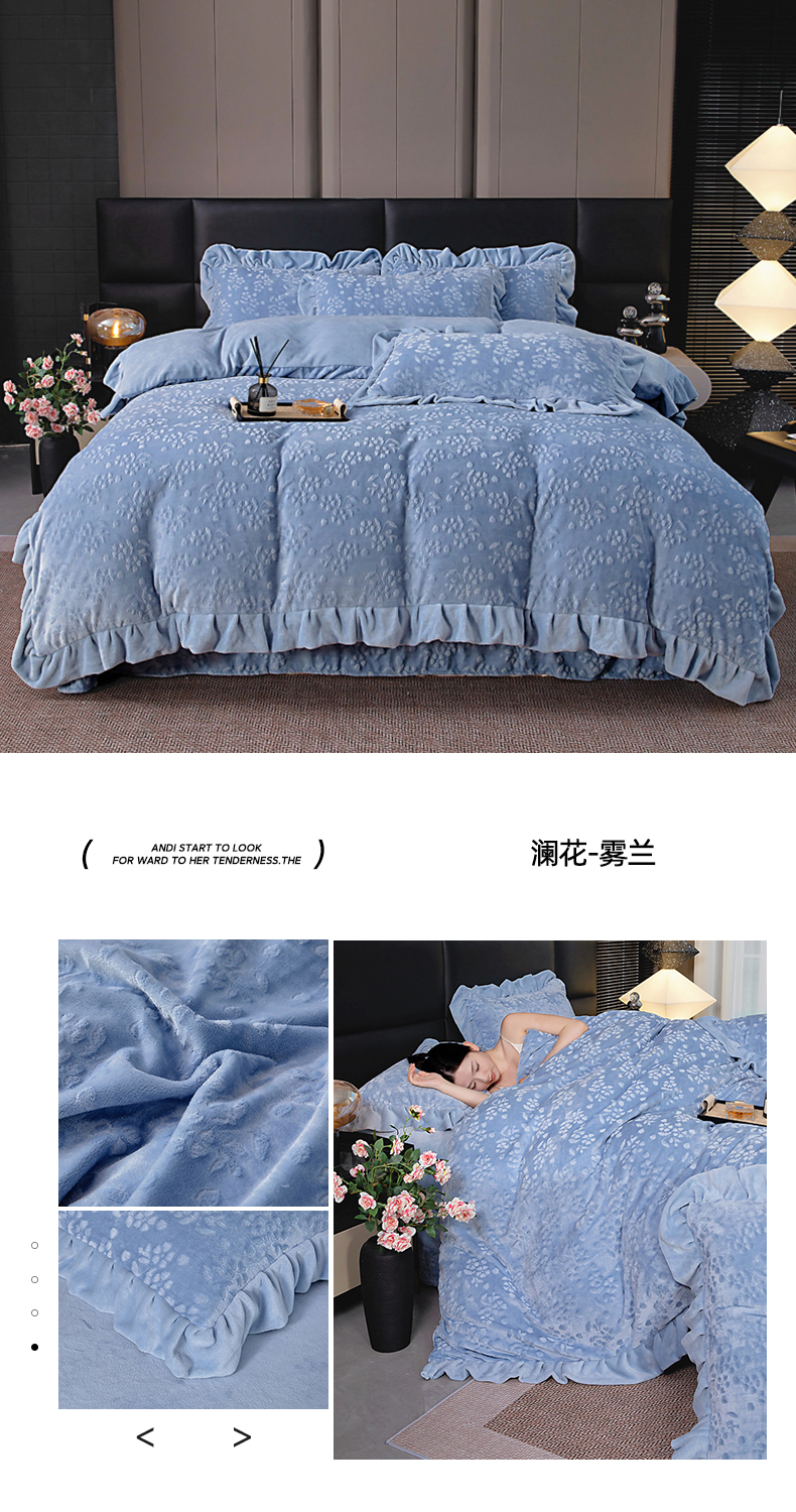 (总)找底底家纺 2025新款花边9-10斤牛奶绒床盖款四件套,花妖,梨花落,小樱桃,紫蔻