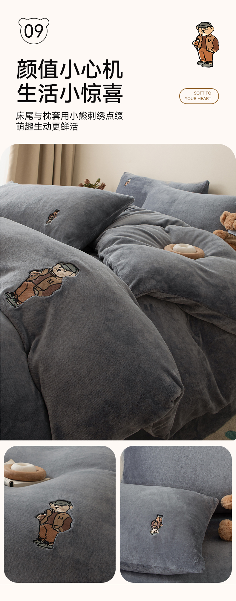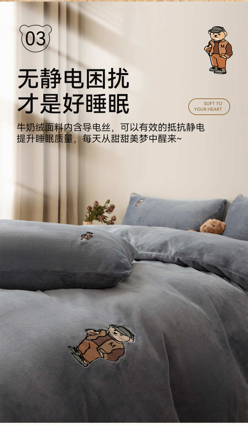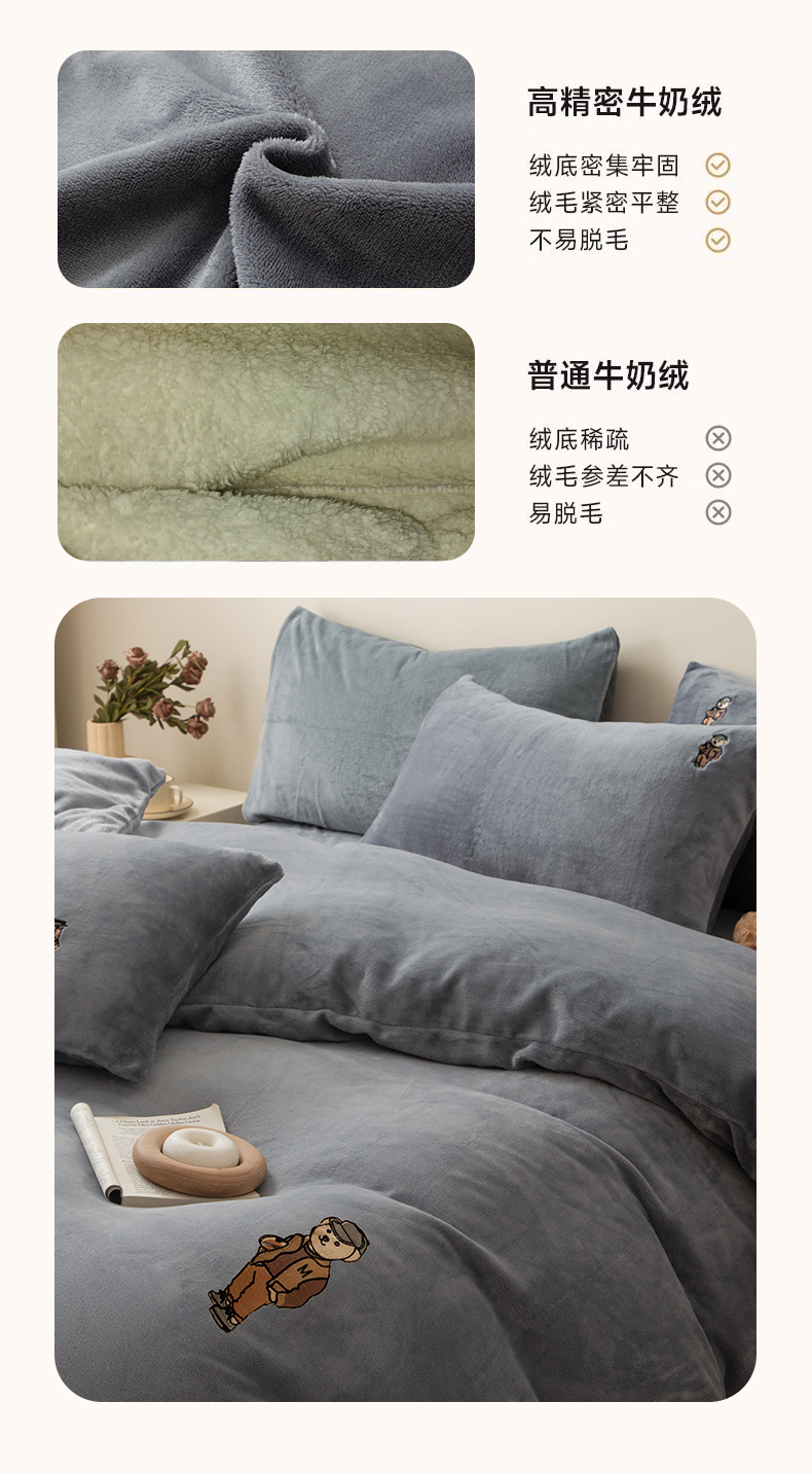 恋绒家纺 2025新款小熊牛奶绒四件套卡通被套宿舍学生三件套 小熊先生-高级灰