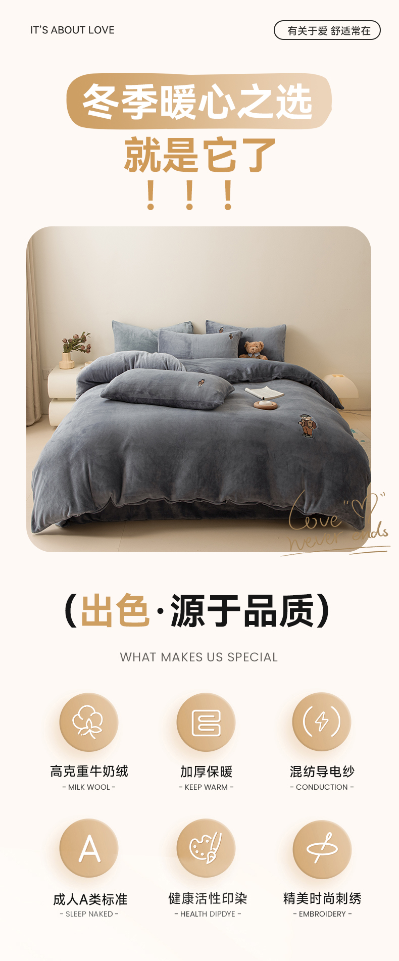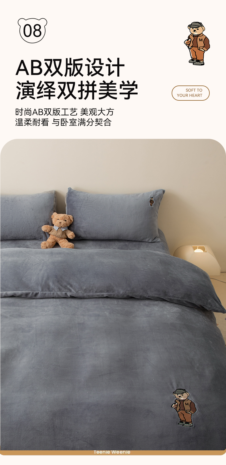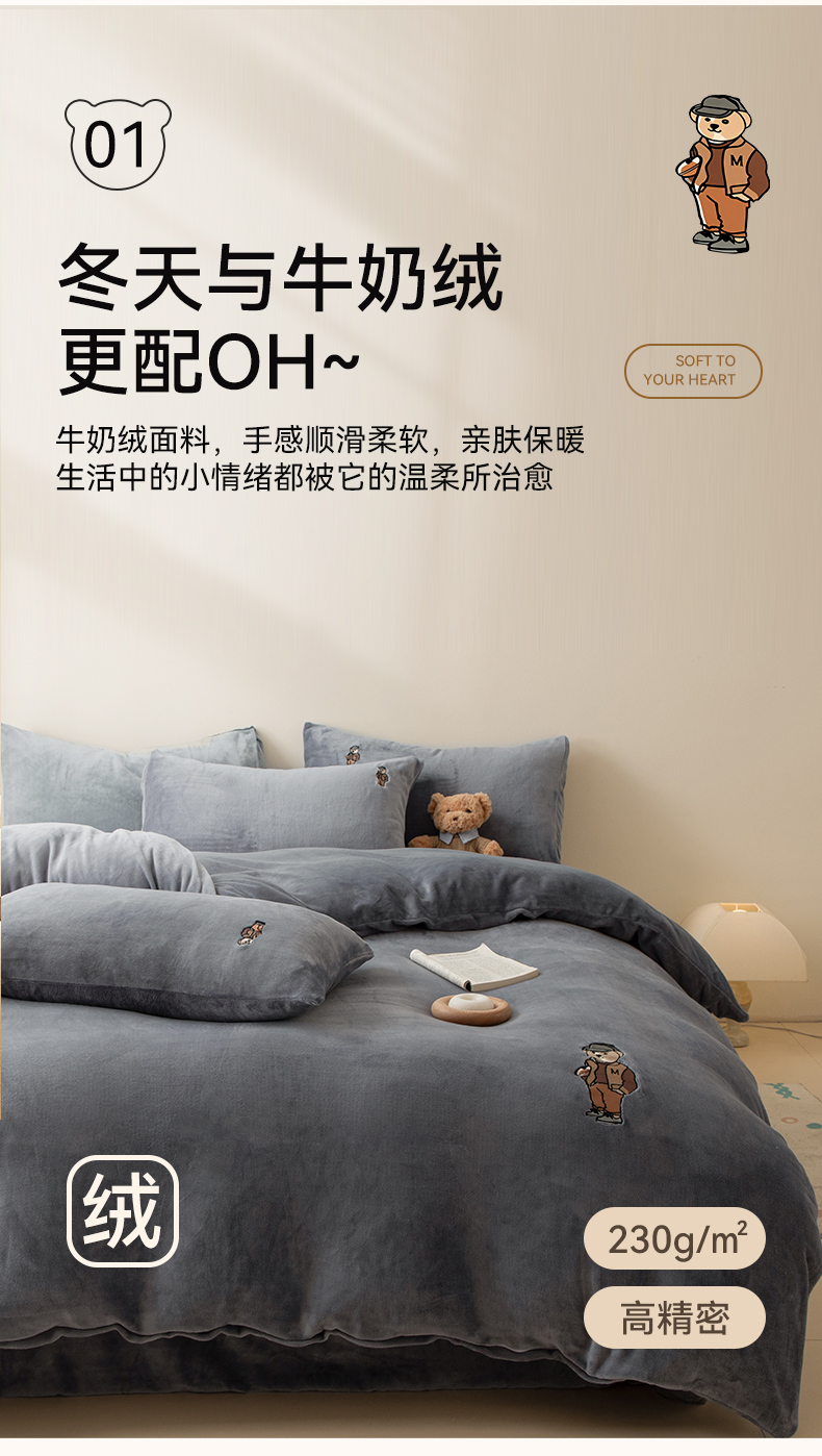恋绒家纺 2025新款小熊牛奶绒四件套卡通被套宿舍学生三件套 小熊先生-高级灰