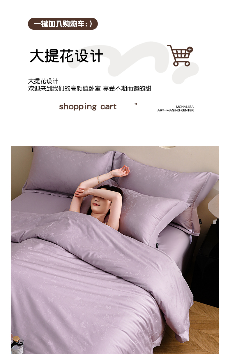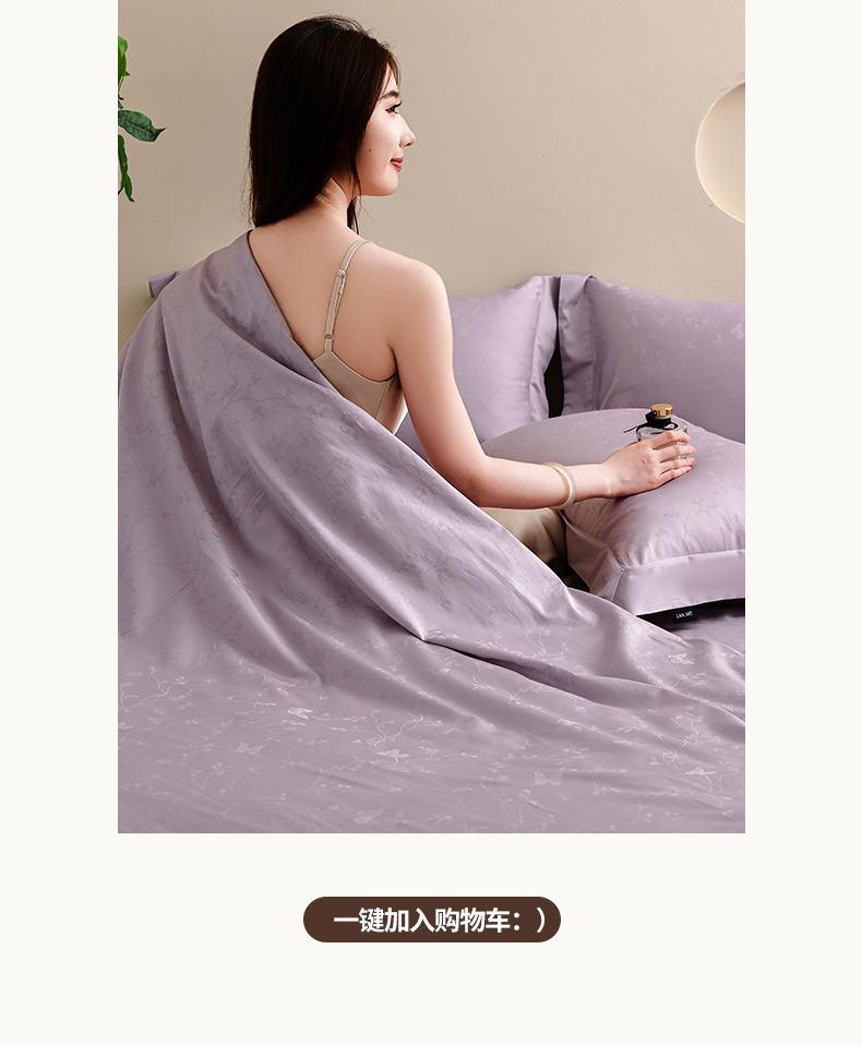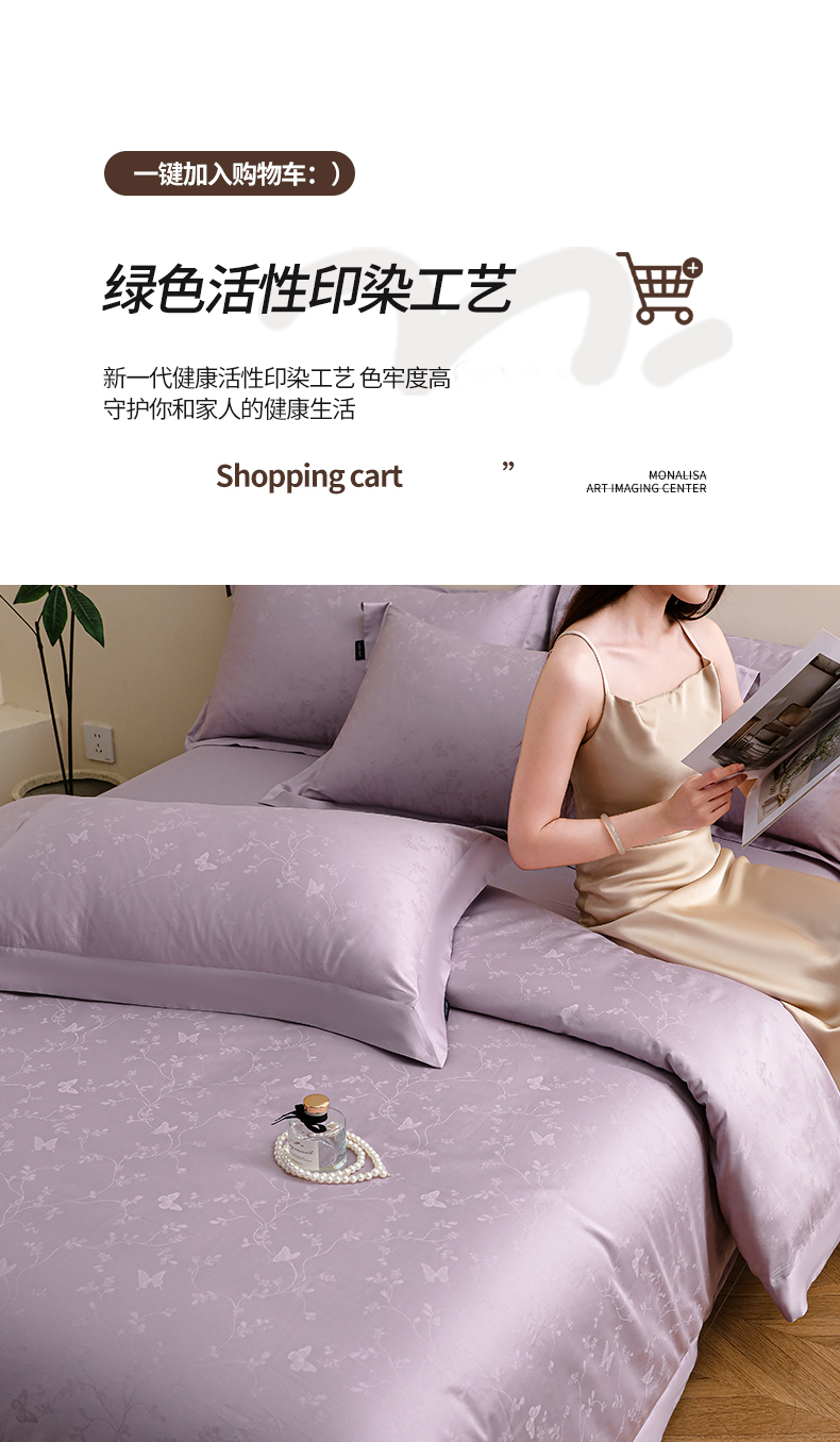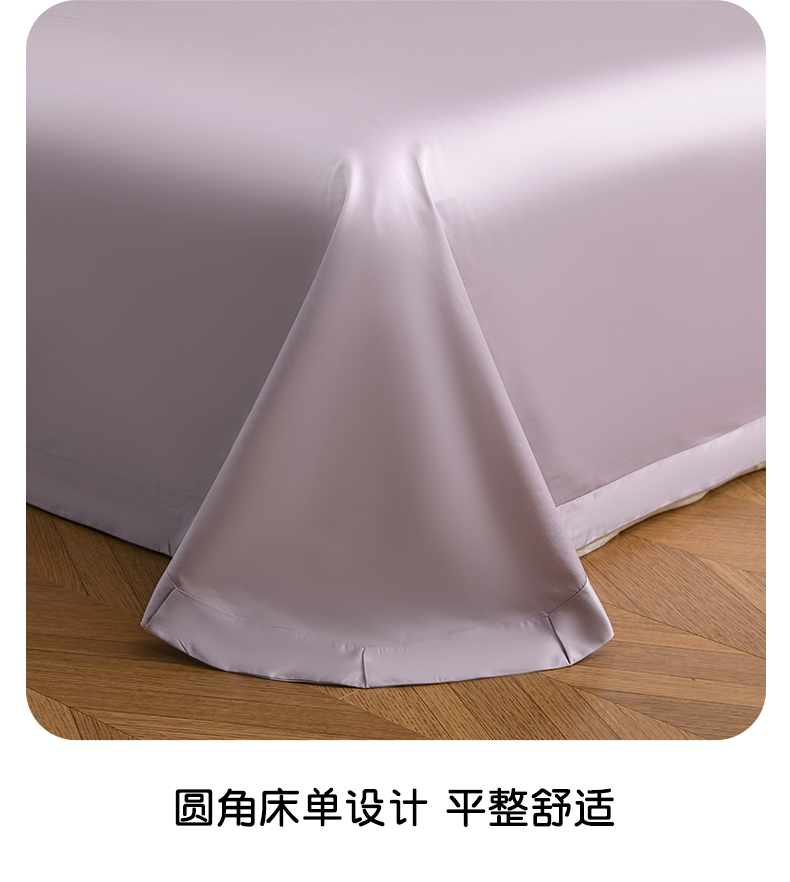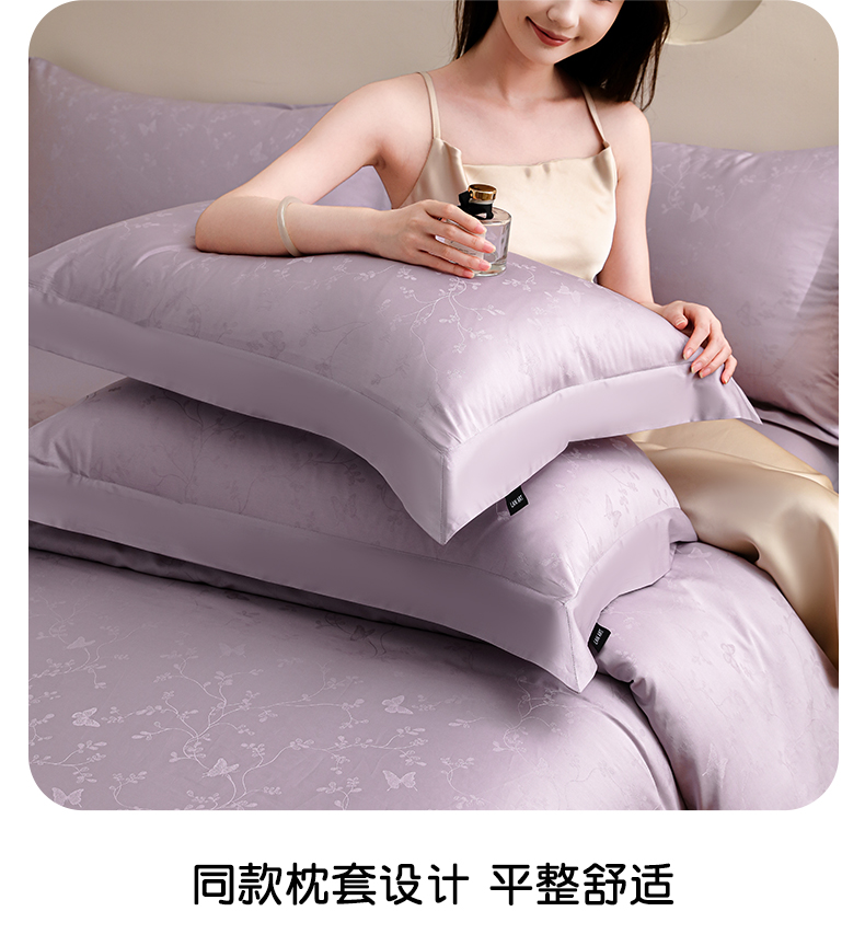 商品名称:洺兰家居 2025新款60支全棉新疆棉大提花拼角款四件套长绒棉贴边床单床笠床上用品套件专版(控价标准245加大260床笠255) 梦蝶-浅紫