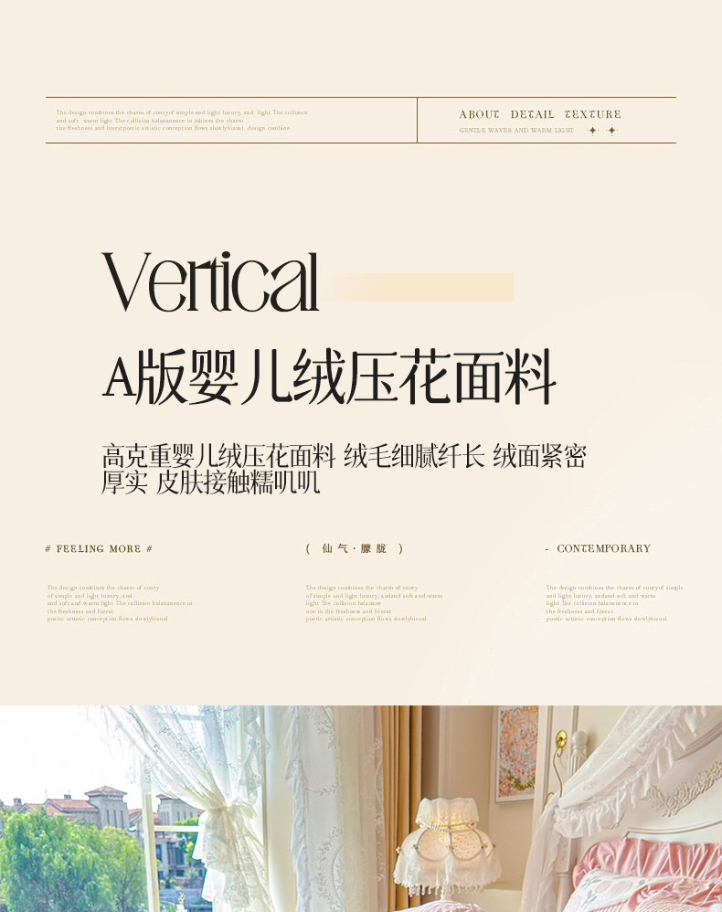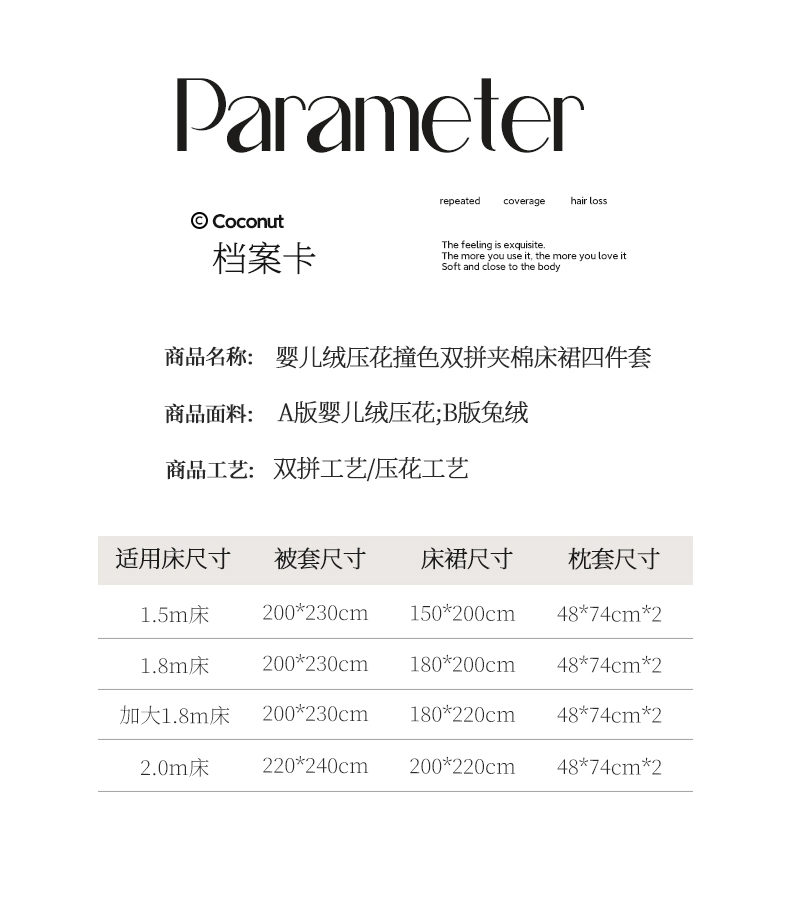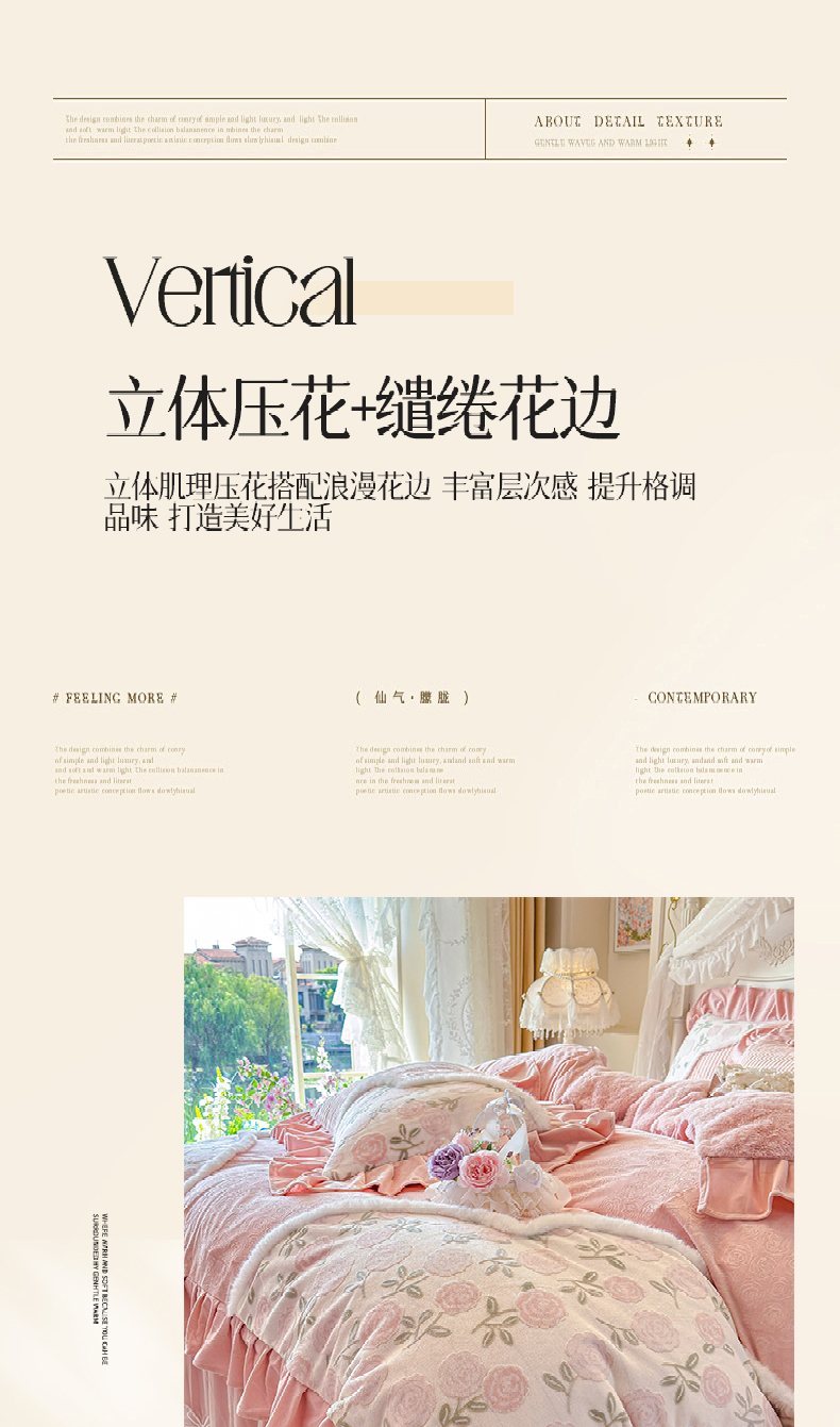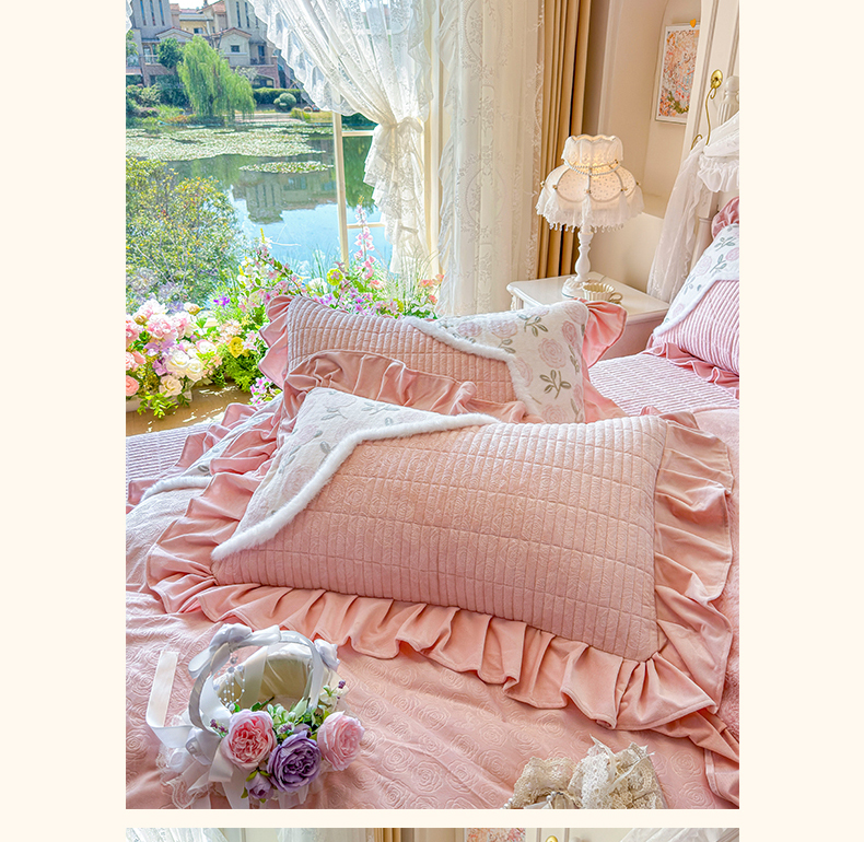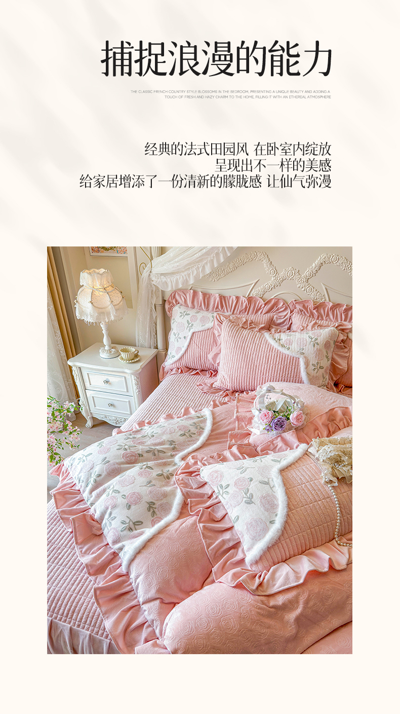 商品名称:宜凡家纺 2025新款婴儿绒压花撞色双拼夹棉床裙四件套 床裙款-花曦