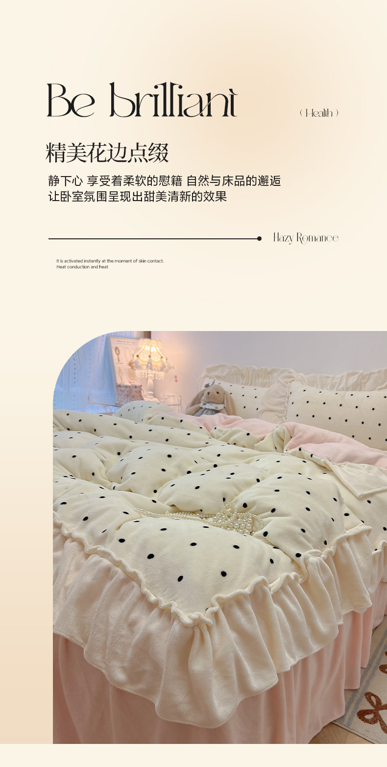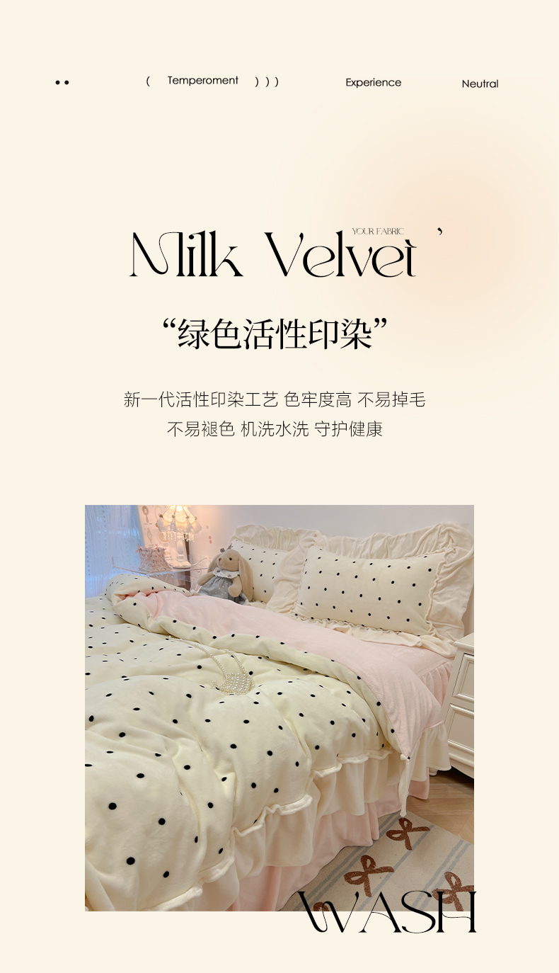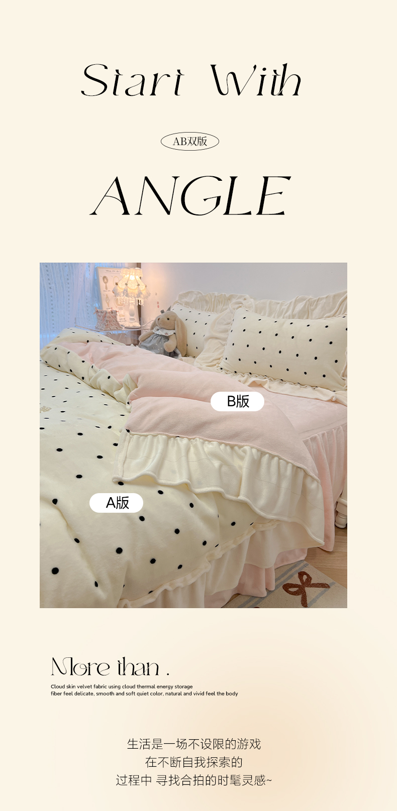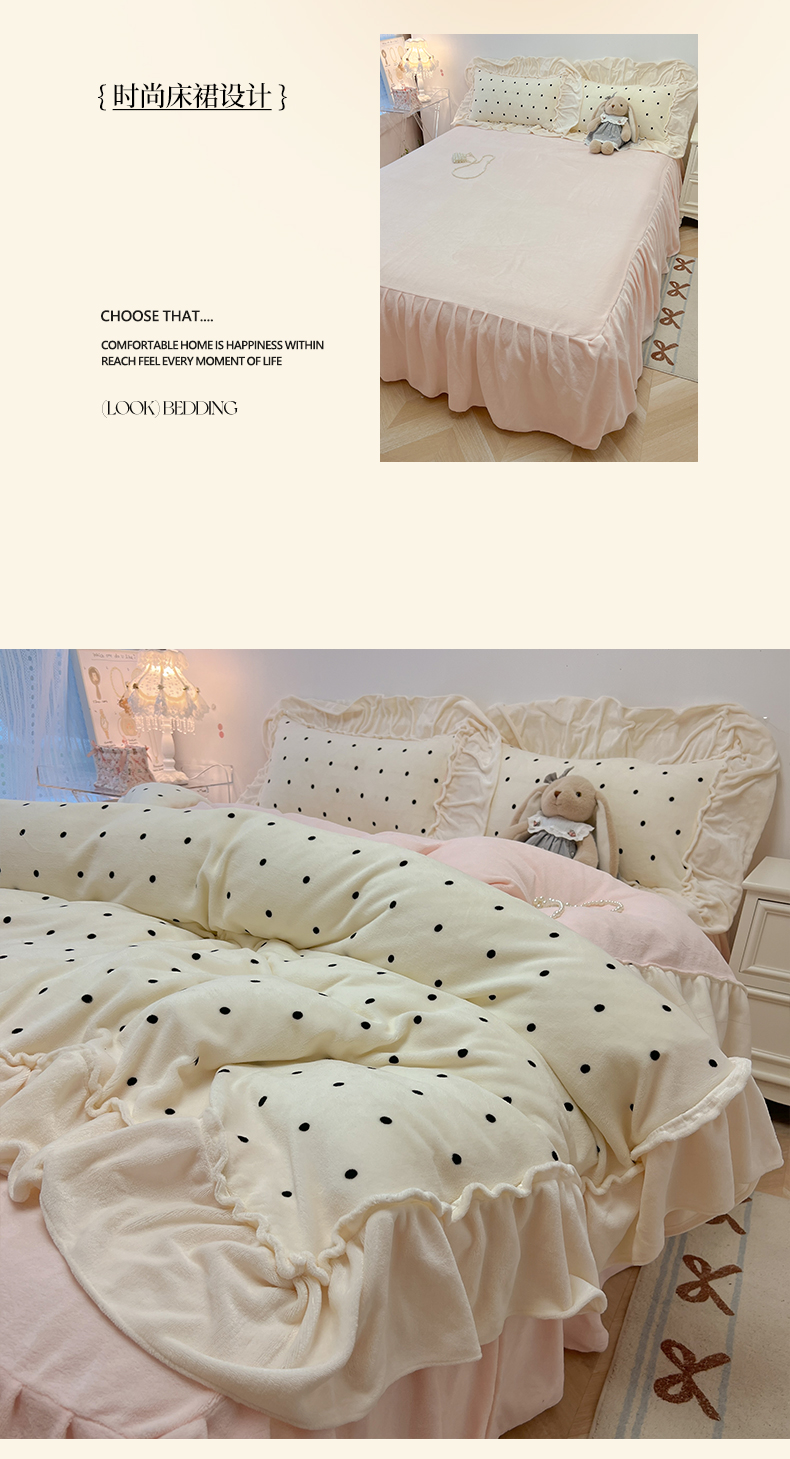 商品名称:(总)盼季家纺 2025新款日系奶油风牛奶绒花边床上用品四件套珊瑚绒牛奶绒床单被套床裙