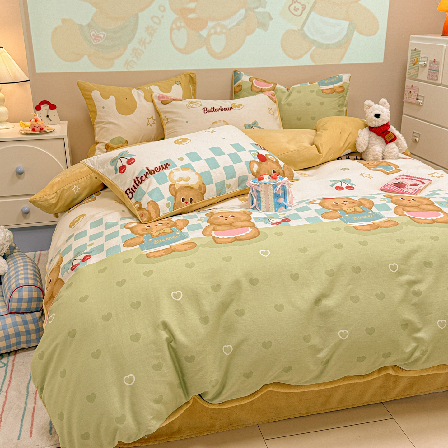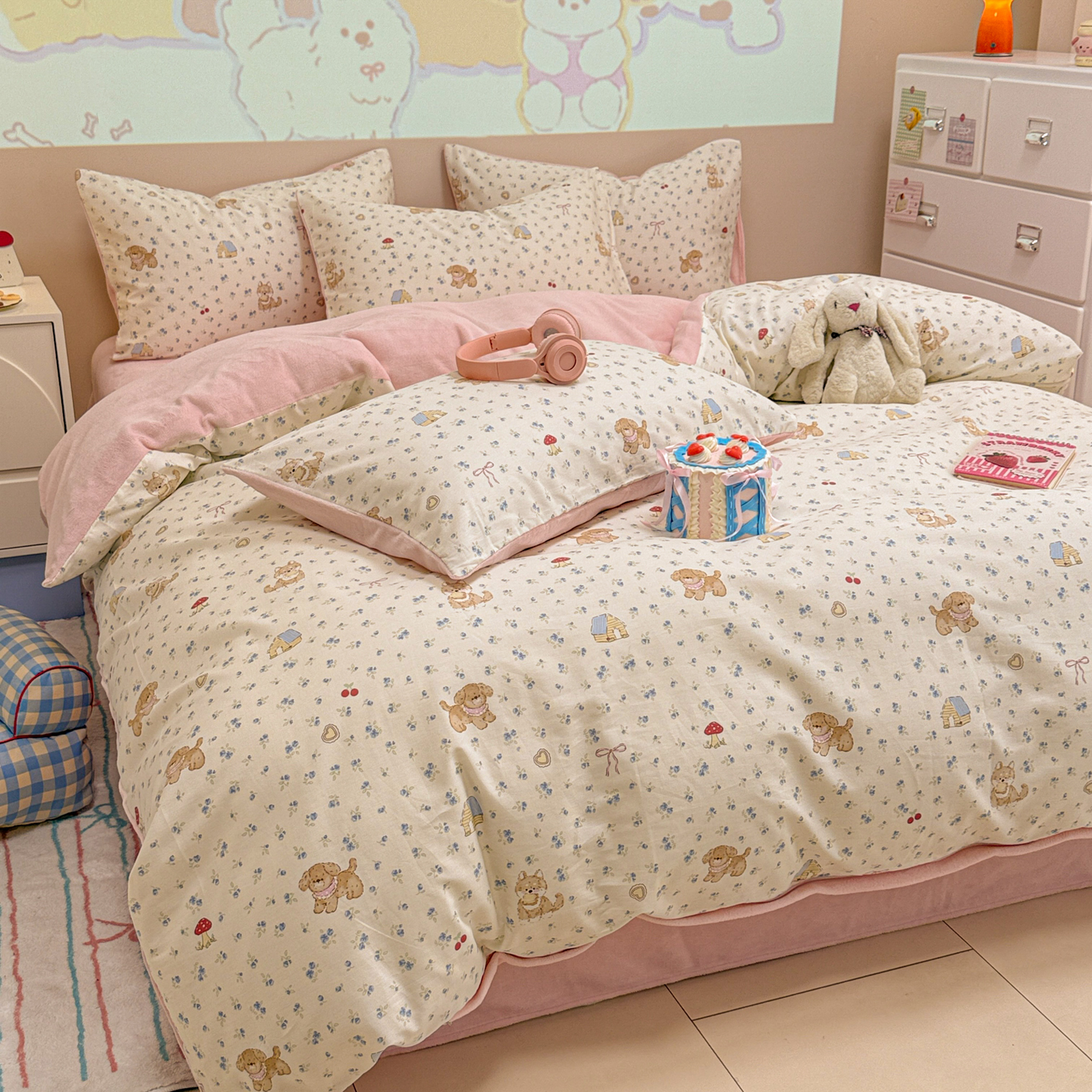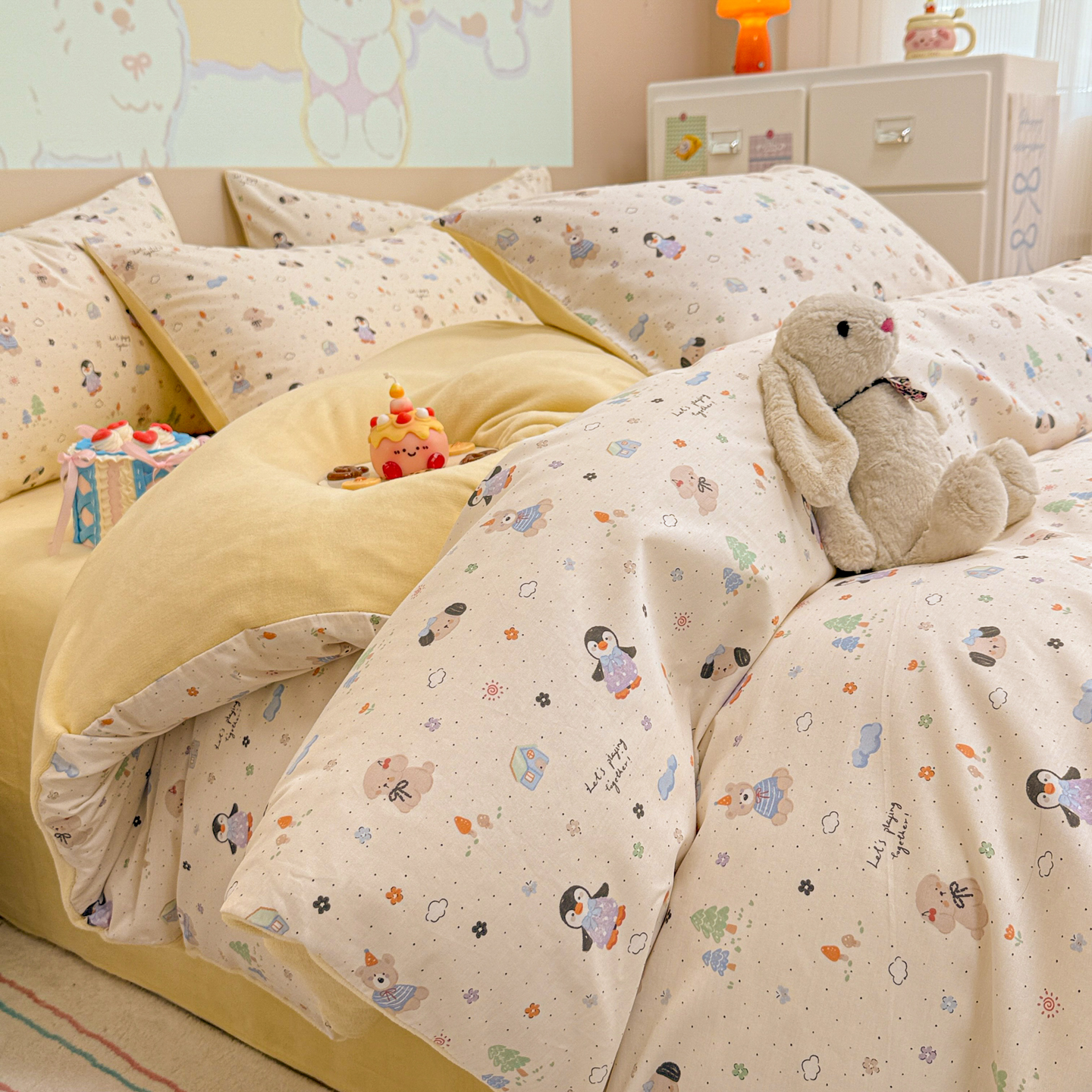 (总)呗旺鹿 2026新款全棉纯棉40支13070卡通印花四件套-场景二,萌星,鼻涕狗,果子象,机灵猫,可爱星人,幸福小熊