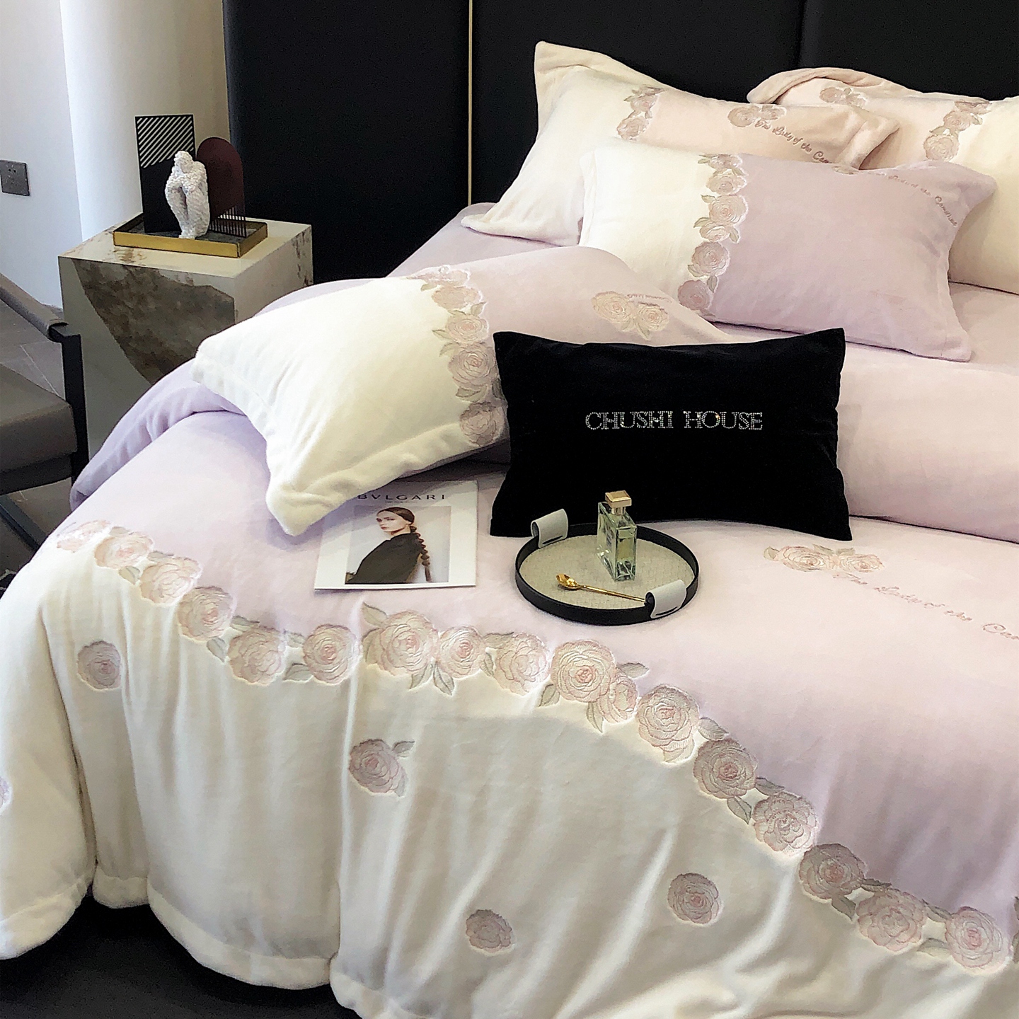(总)初拾 2025新款230g牛奶绒“高级感“绣花四件套—曼岛邂逅,曼岛邂逅-奶油粉,曼岛邂逅-气质灰,曼岛邂逅-香槟
