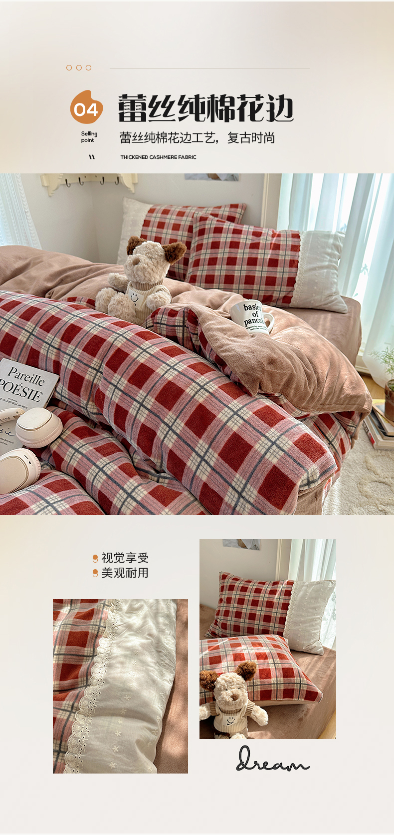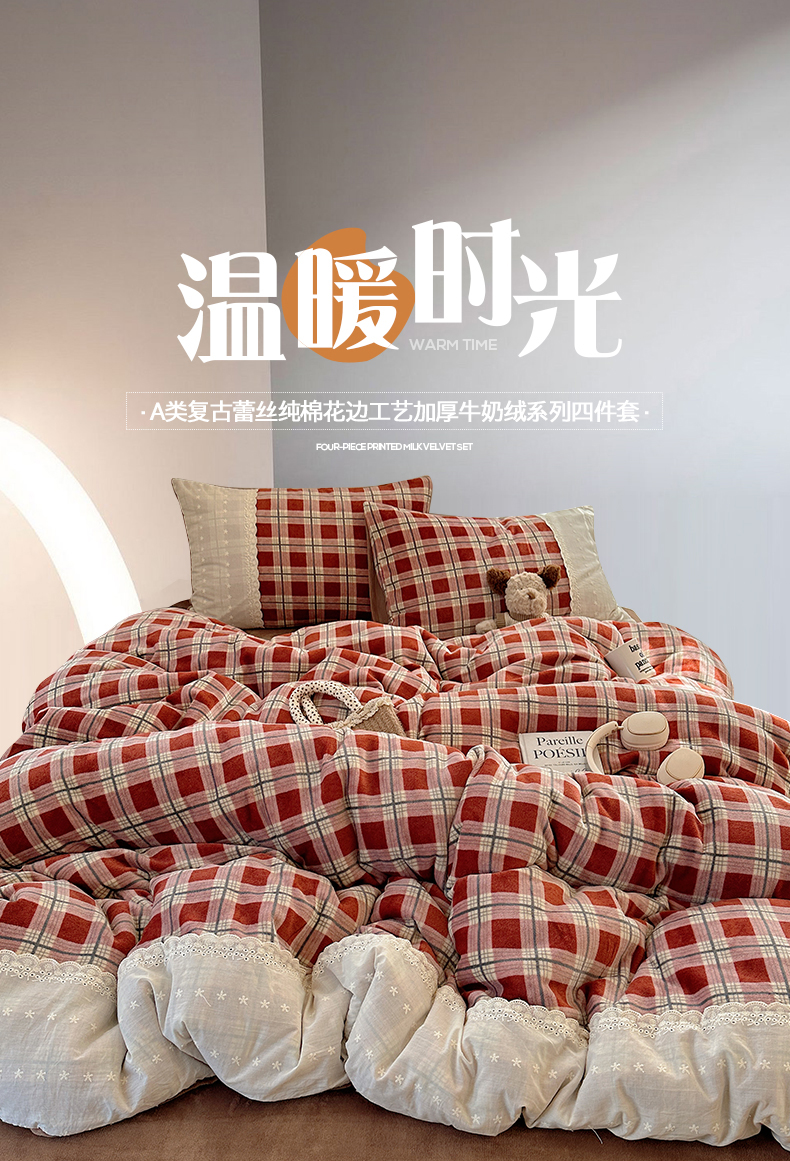 商品名称:(总)桃子家居 2025新款A类蕾丝纯棉花边工艺花卉复古碎花加厚花边牛奶绒系列四件套