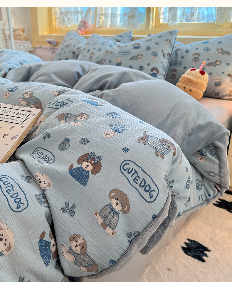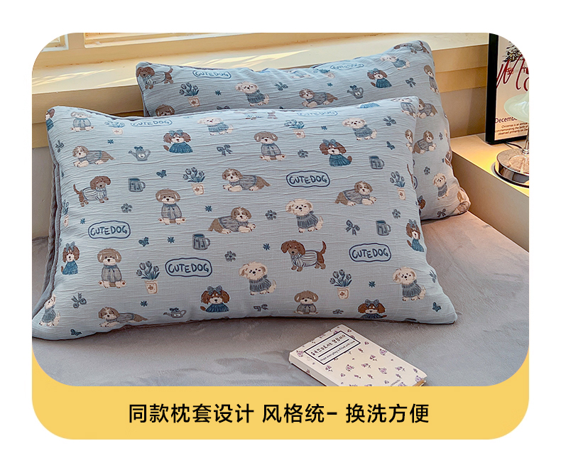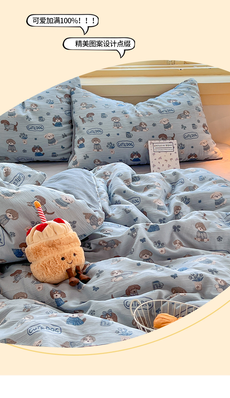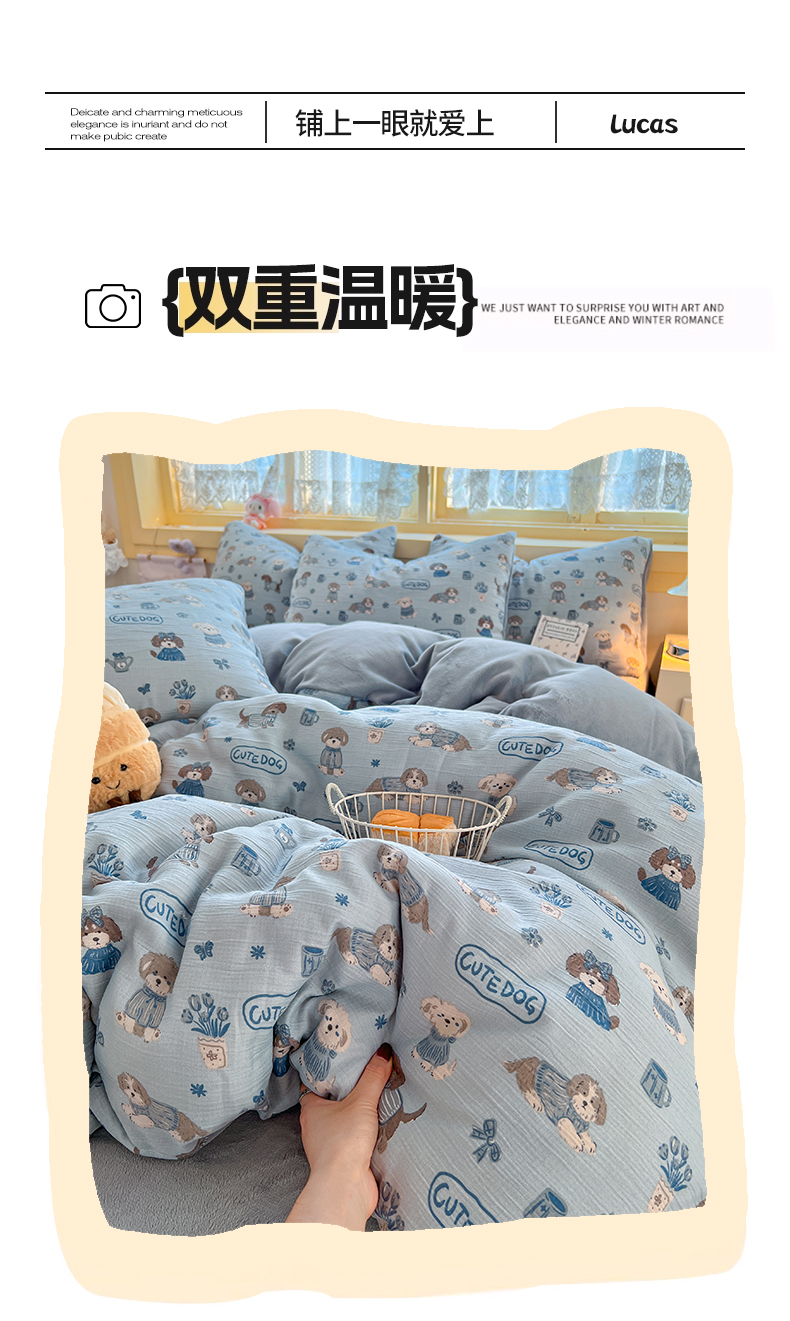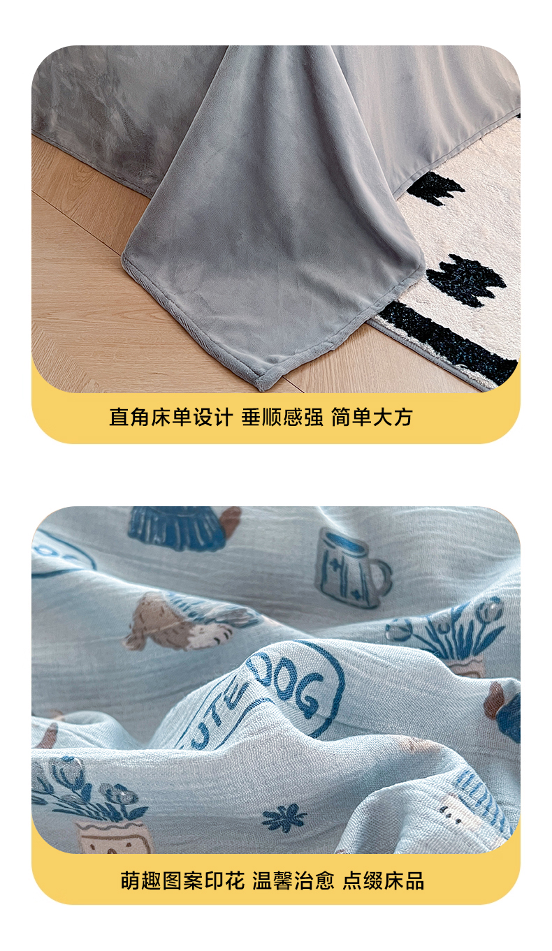 (总)玉海棠家纺 2025新款云感提花双层纱印花系列四件套-场景一,布丁狗,格格西高地,蓝色爱心,米奇,诺言兔兔,晴天,芝士奶酪,春风里