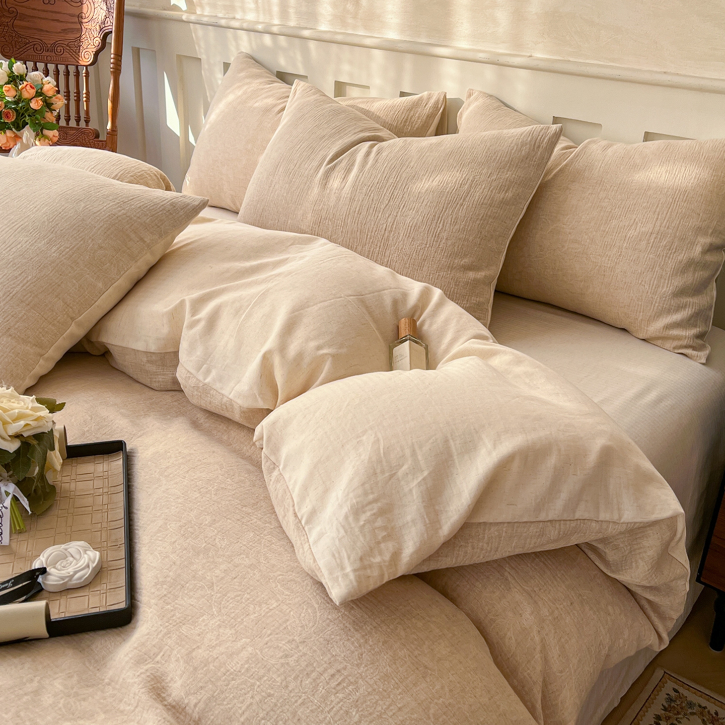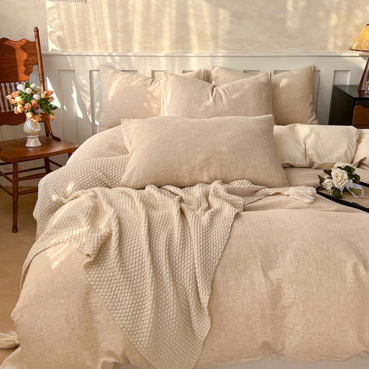 当前位置: 91家纺网 > 商品网购 > 床品套件 > 四件套 > 全棉普通四件套 > 金丝鸟家纺 2026春夏新款全棉纯棉棉麻提花四件套 花期如梦