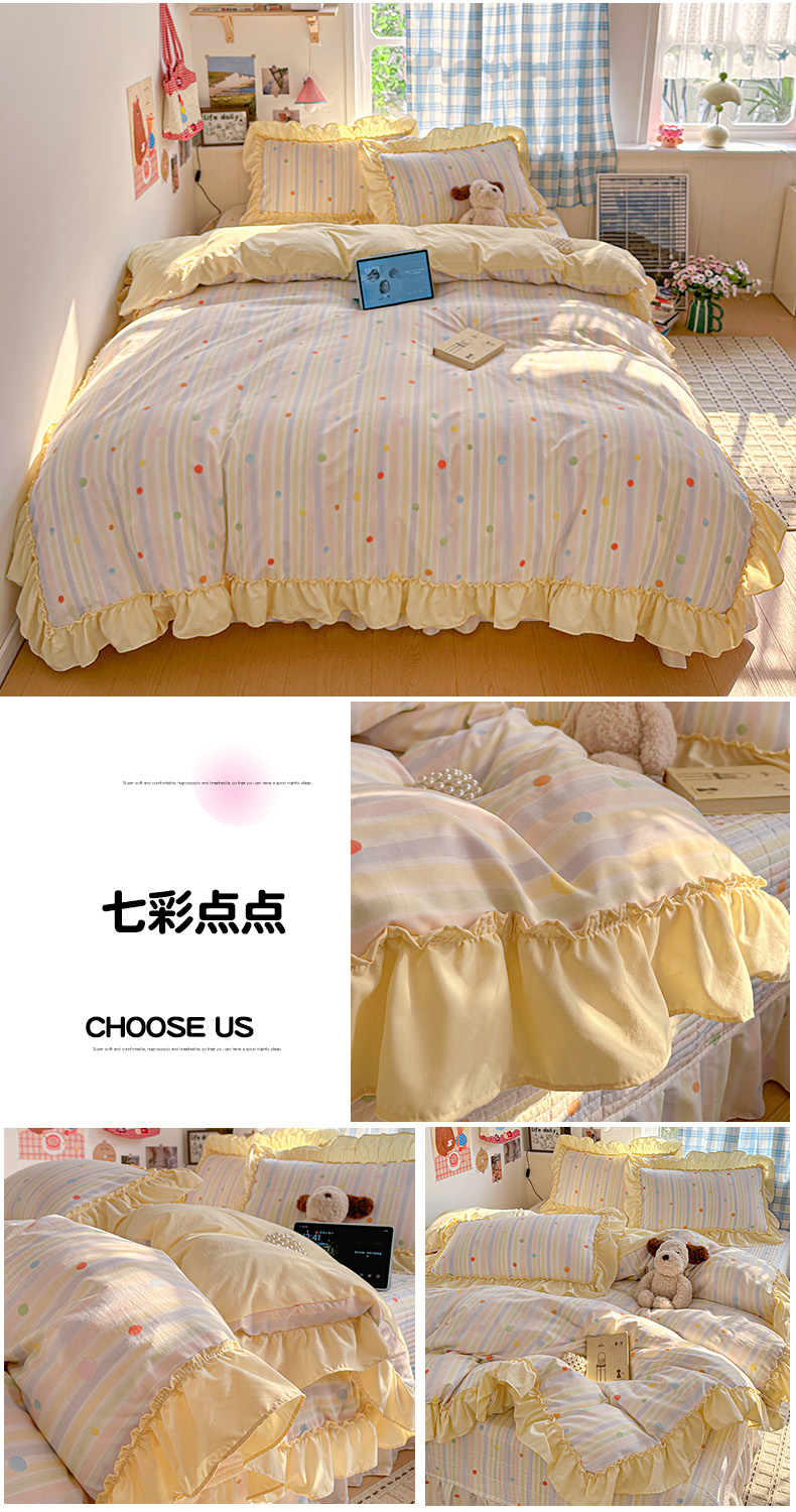 当前位置: 91家纺网 > 商品网购 > 床品套件 > 四件套 > 其它四件套 > 富米莱(原臻工厂) 2026春夏新款仿棉A类韩系大花边床盖床裙四件套 七彩点点