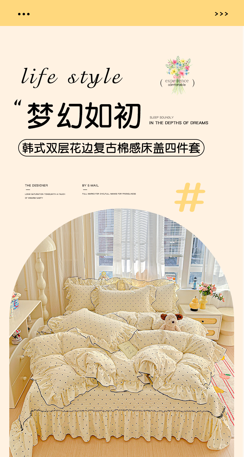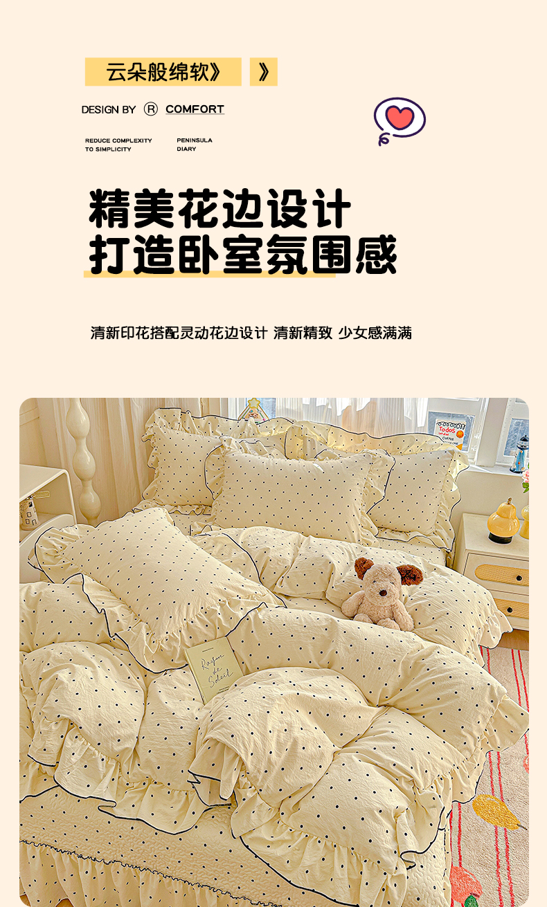 当前位置: 91家纺网 > 商品网购 > 床品套件 > 四件套 > 其它四件套 > 家维家纺 2026新款(常年不断货)韩式双层花边复古棉感床盖四件套 波点
