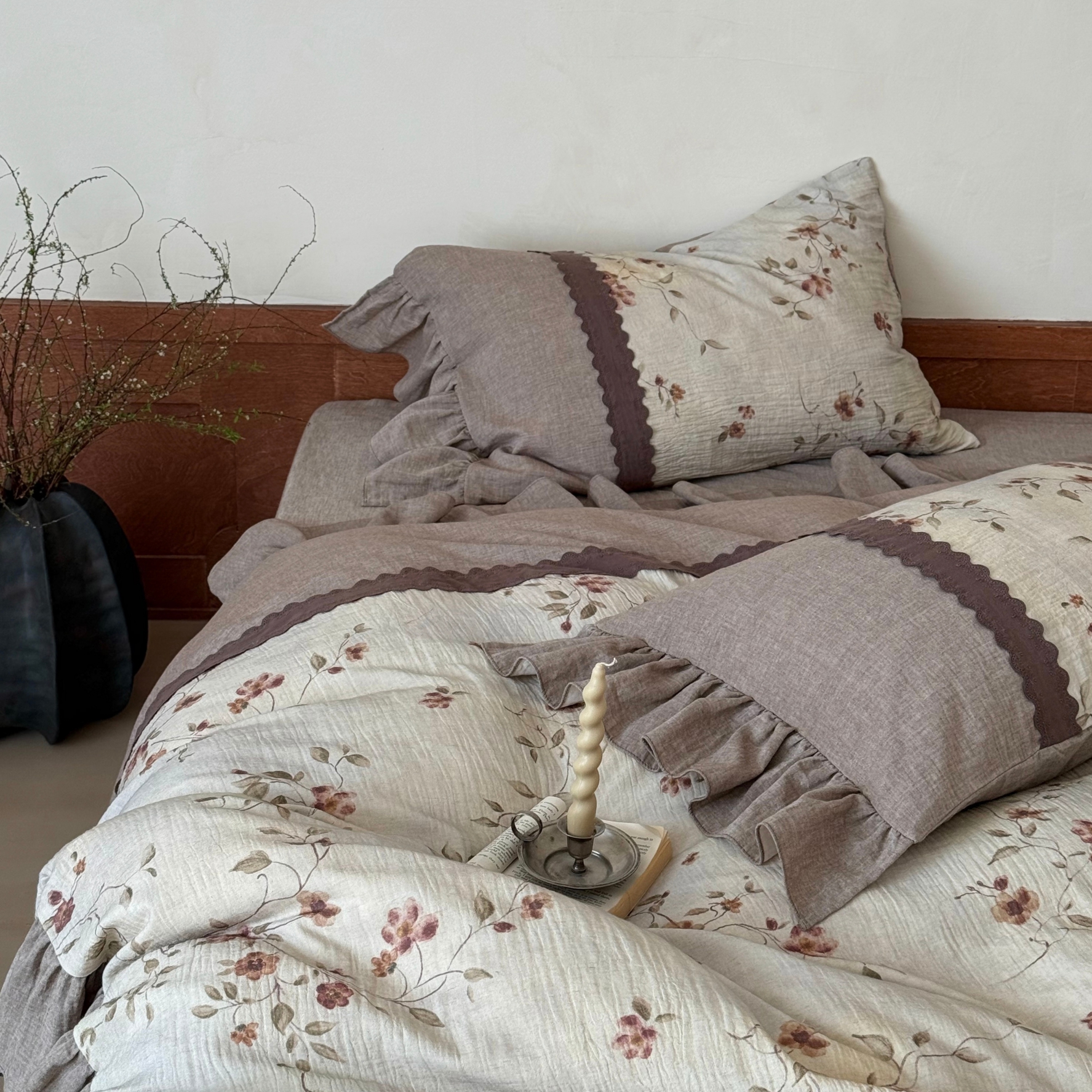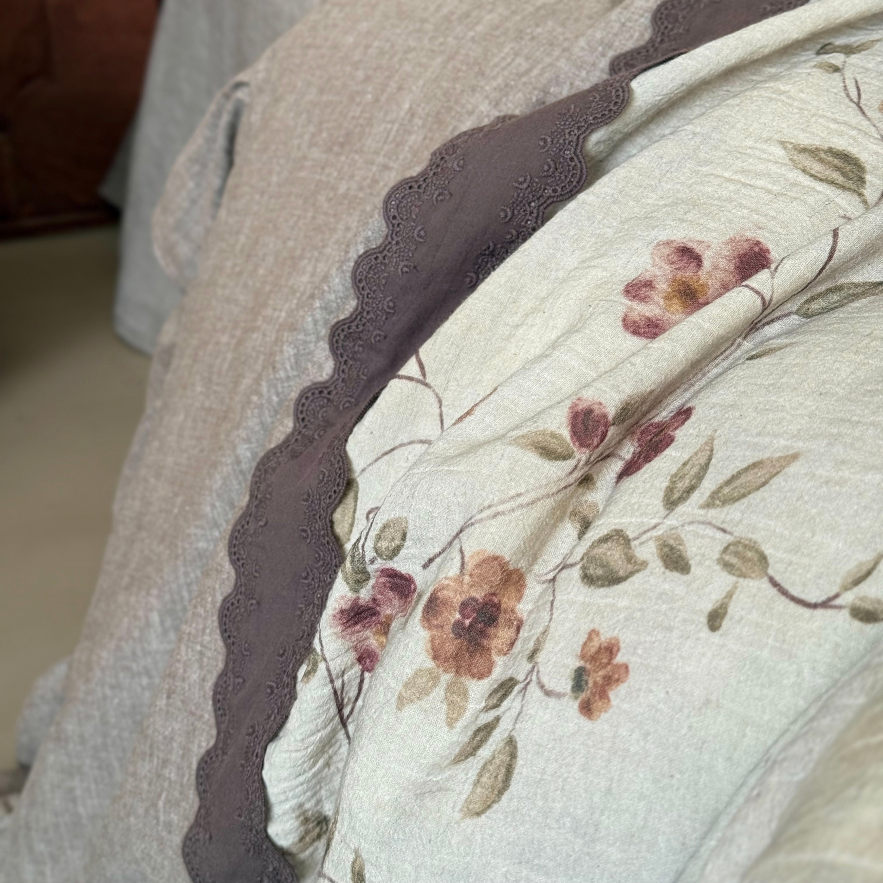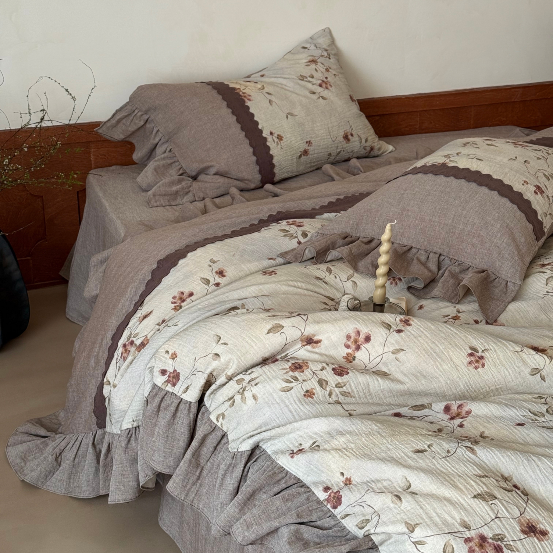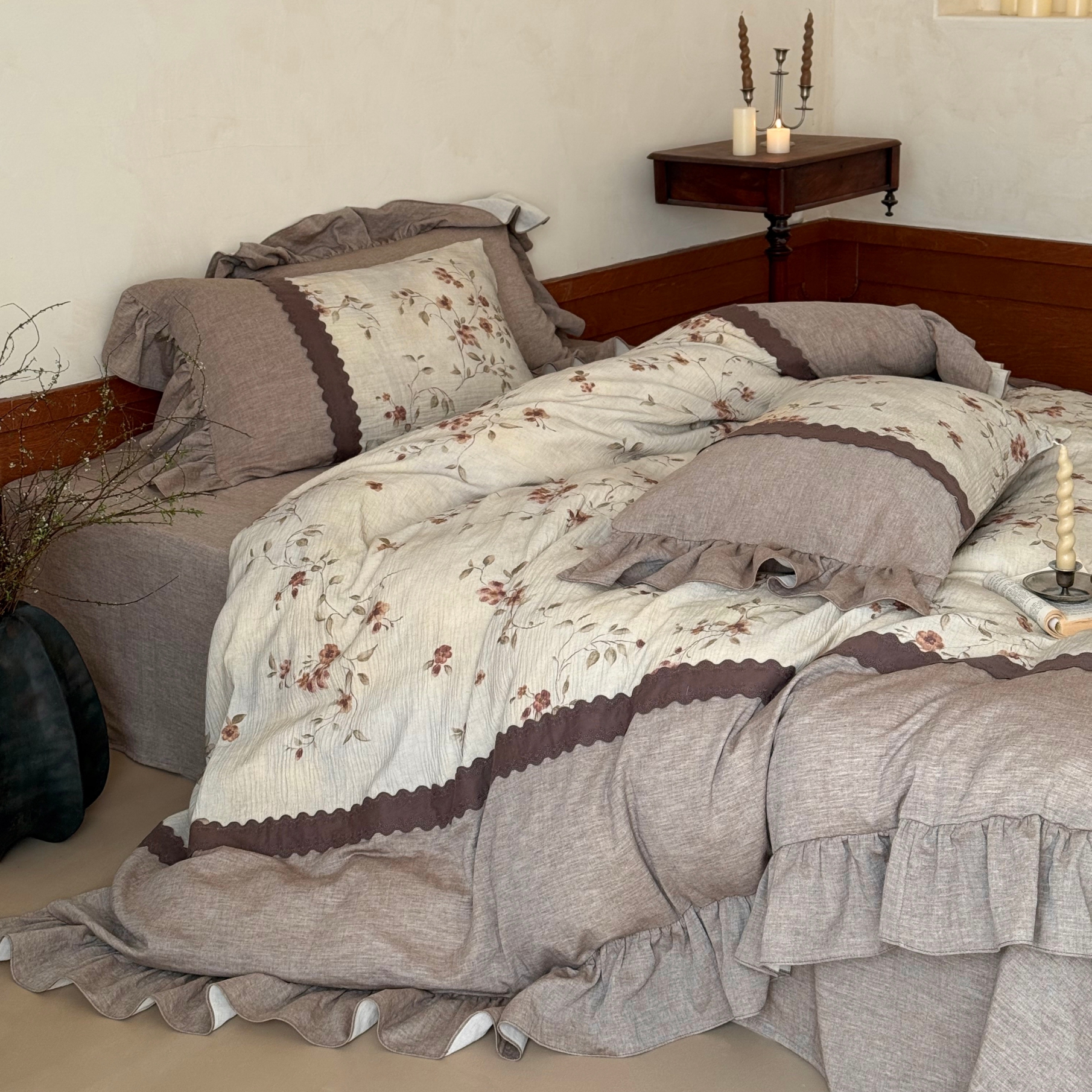 (总)佳汐蓝家纺 2026春夏新款棉麻皱皱双层纱四件套-栀子茉莉 控价:卷后不低于398,栀子茉莉-绿色床单,栀子茉莉-麻色床单