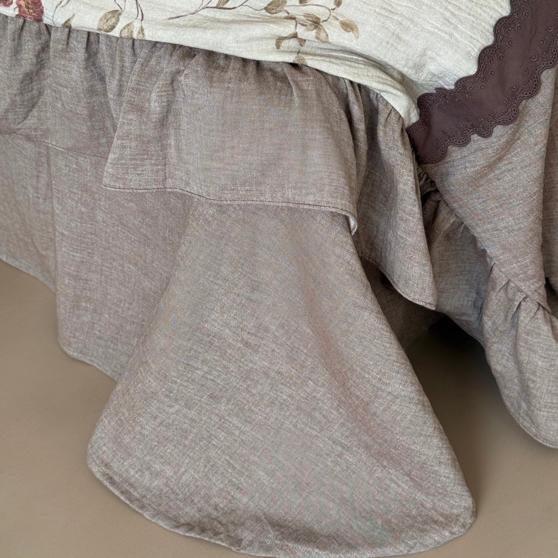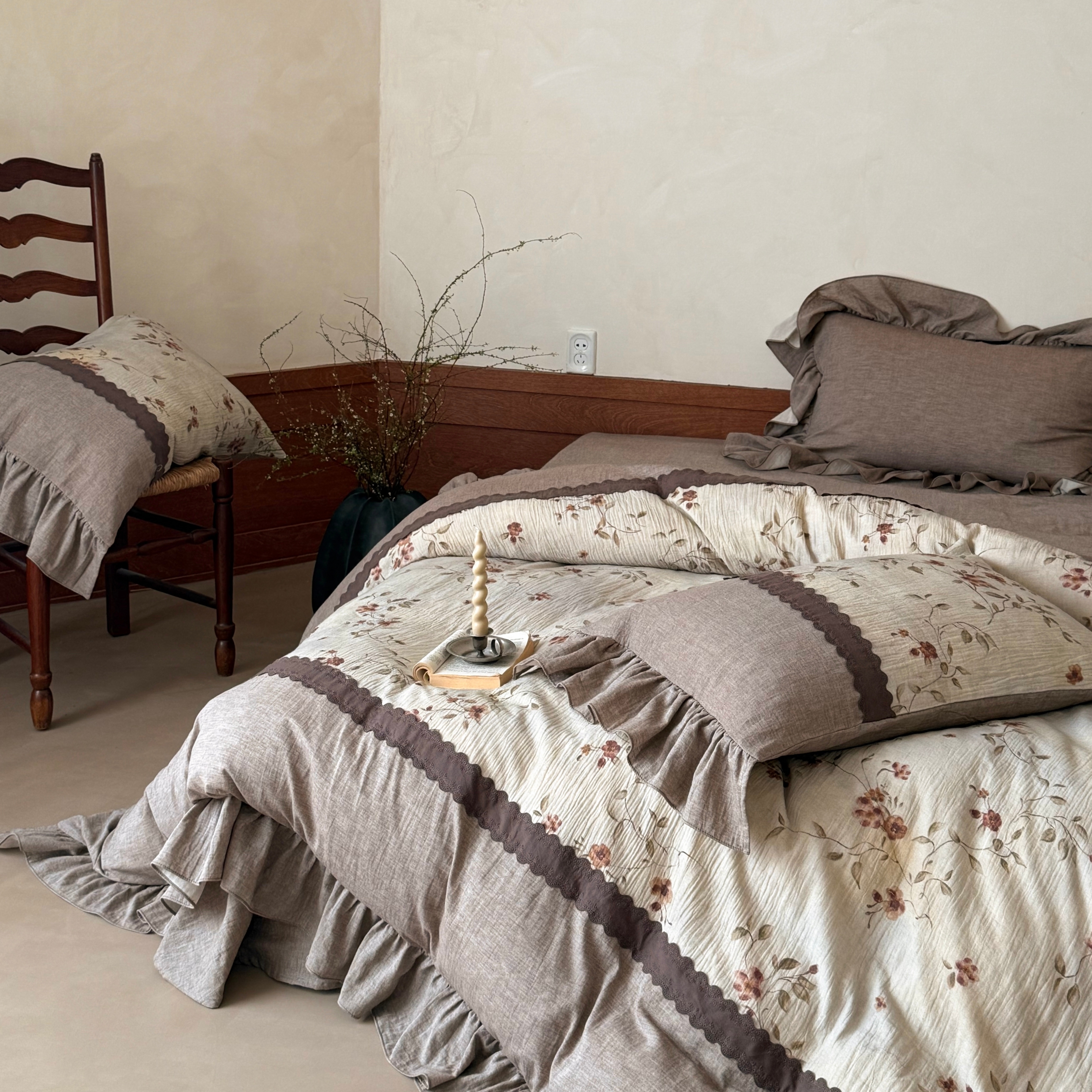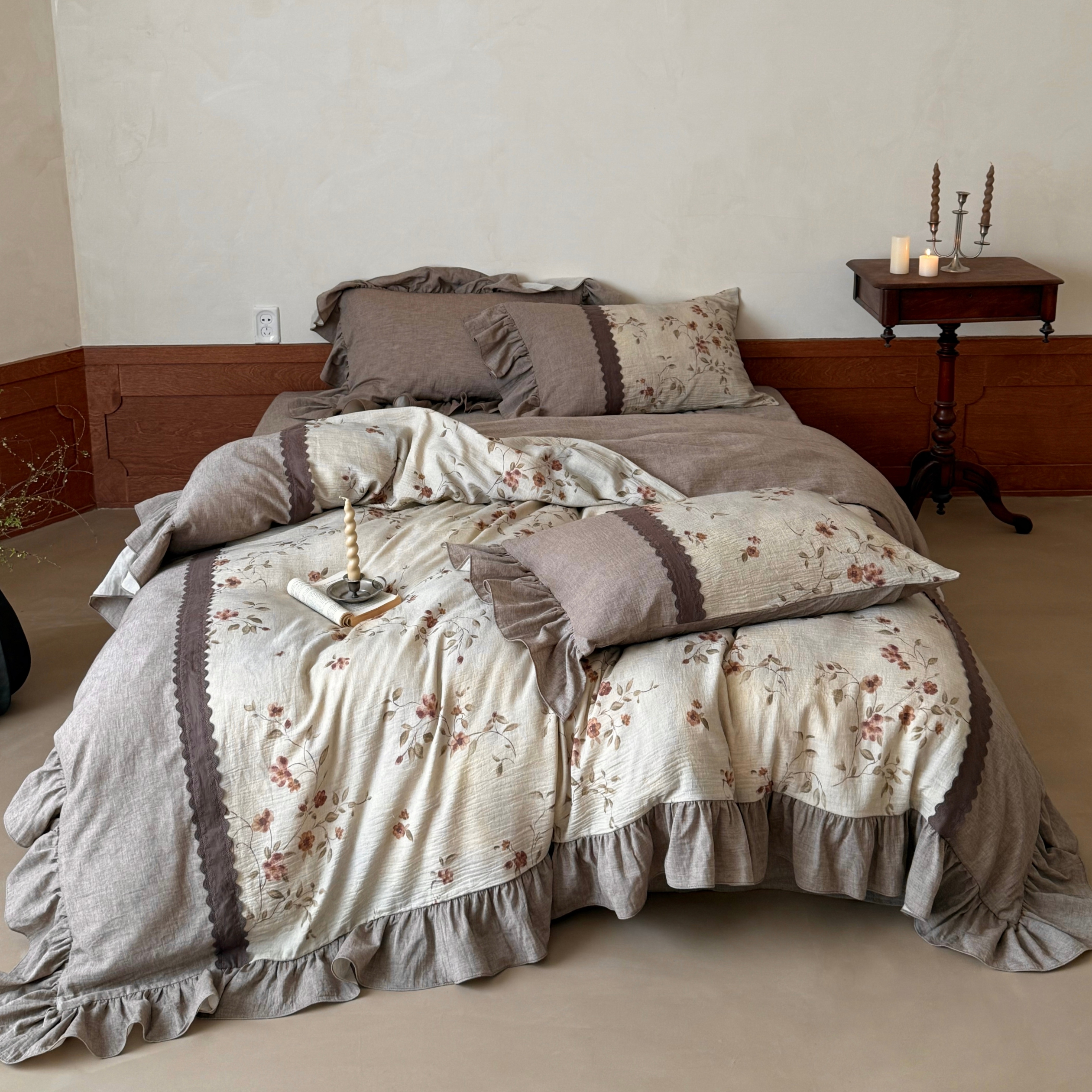 (总)佳汐蓝 2025春夏新品双层皱皱纱刺绣+织带+荷叶边四件套--白茶花,奶白,曲奇