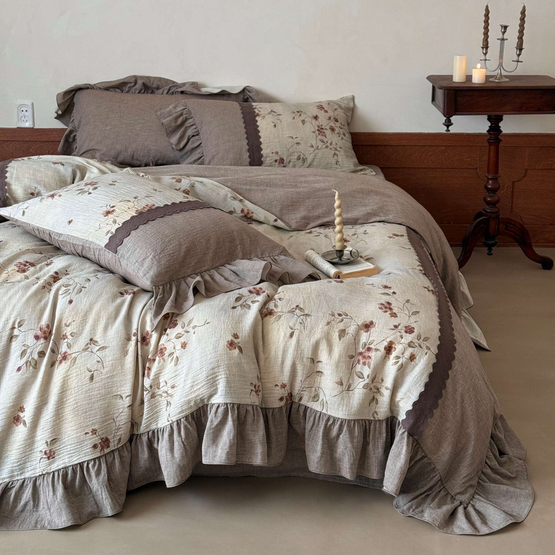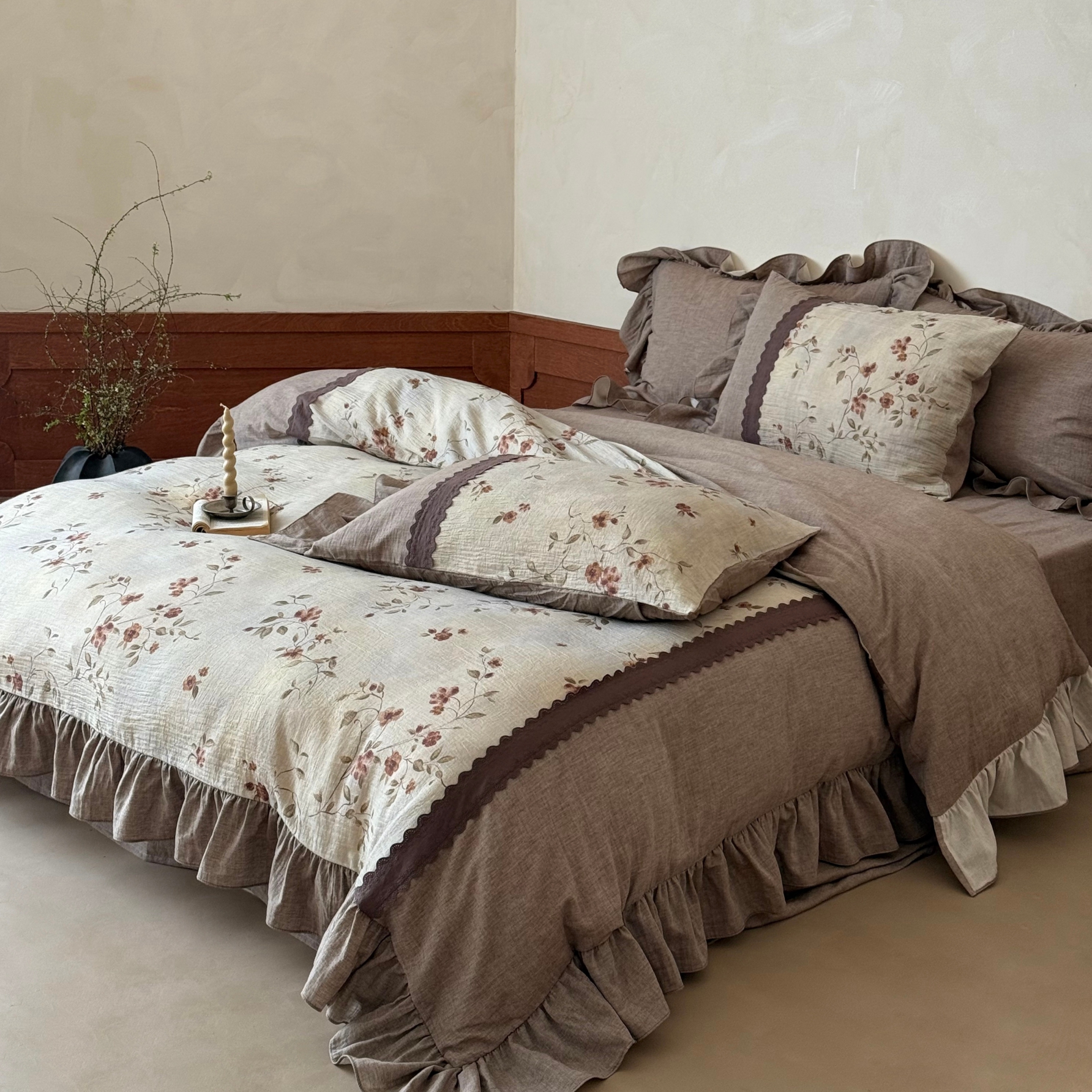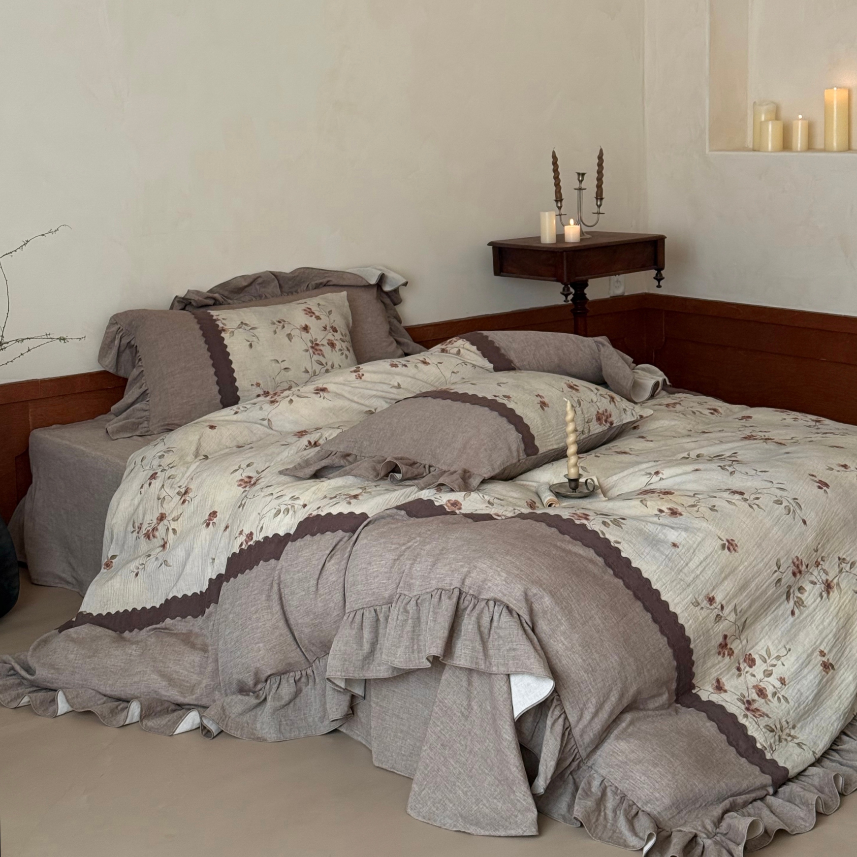 (总)佳汐蓝 2025春夏新品双层皱皱纱刺绣+织带+荷叶边四件套--白茶花,奶白,曲奇