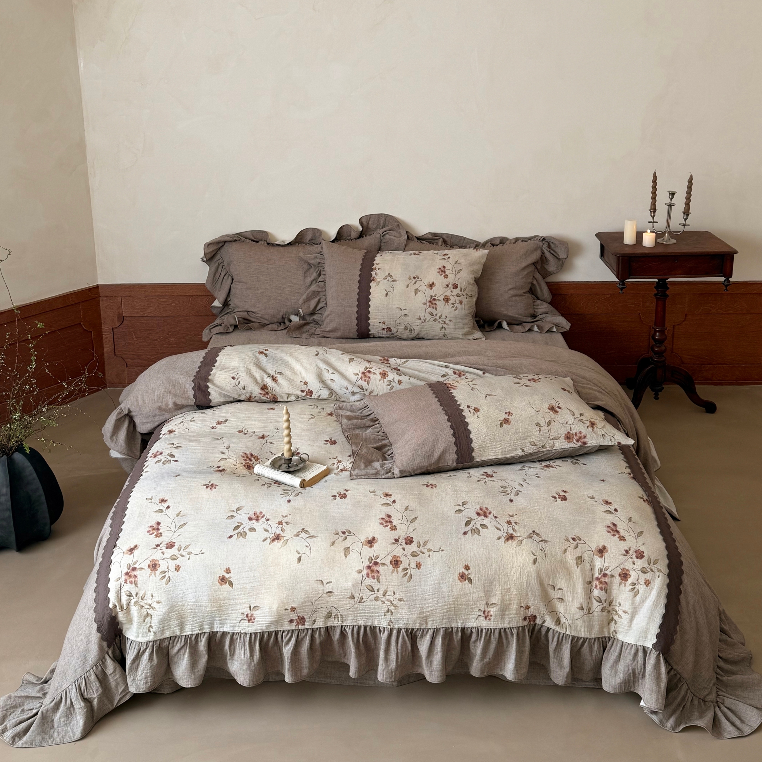 (总)佳汐蓝家纺 2026春夏新款全棉纯棉复古大提花皱皱双层纱四件套-十里蔷薇 控价:卷后不低于398,十里蔷薇-灰色,十里蔷薇-暖咖