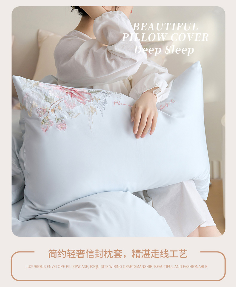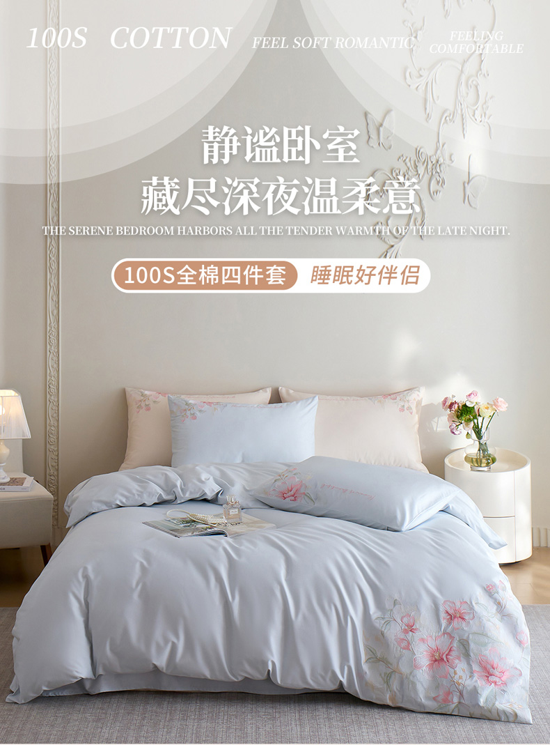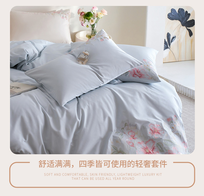 商品名称:爱缦 2026新款100S全棉CR工艺极简轻奢刺绣四件套-秘境系列(券后控价:标准318,大号338) 浅蓝