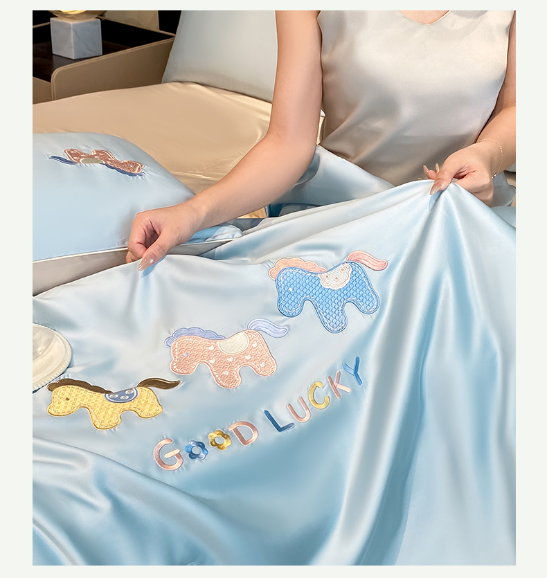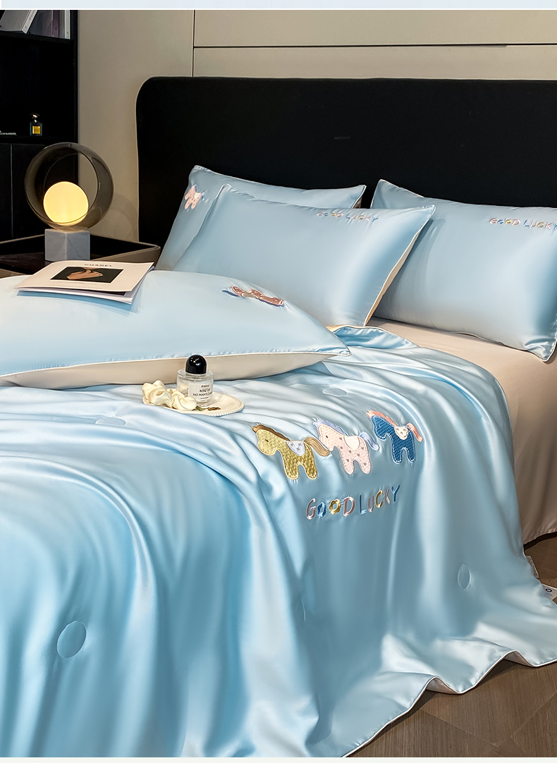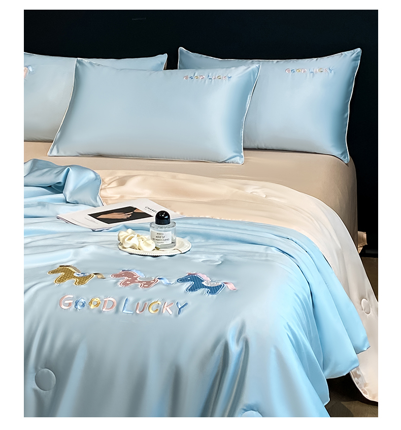 笙意家纺 2026新款小马元素刺绣夏被-以梦为马系列 以梦为马-天蓝+杏