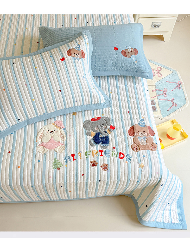 (总)优贝家纺 2026新款高克重水洗棉云感棉印+贴布绣卡通床盖夹棉软席三件套