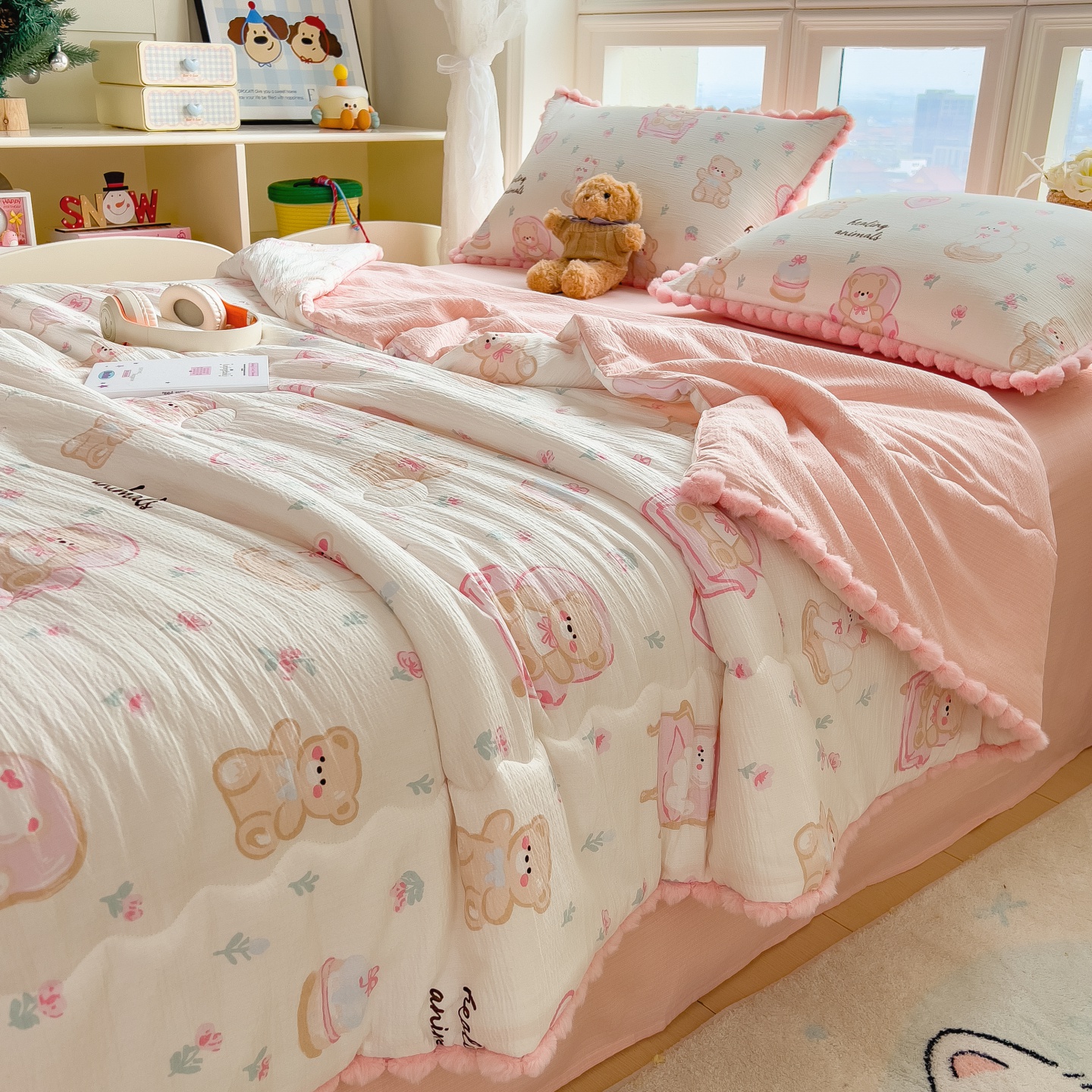 • 91家纺网 家纺一手货源 找家纺 梵克保罗 2026春夏新款10A抗菌毛球花边皱皱纱夏被单夏被空调被夏被四件套 花乡小熊