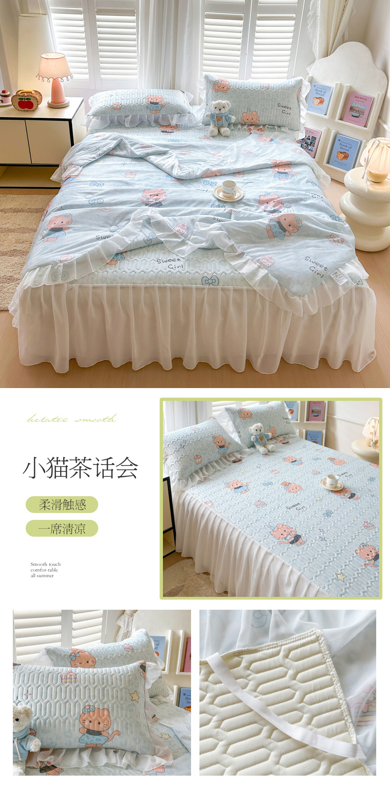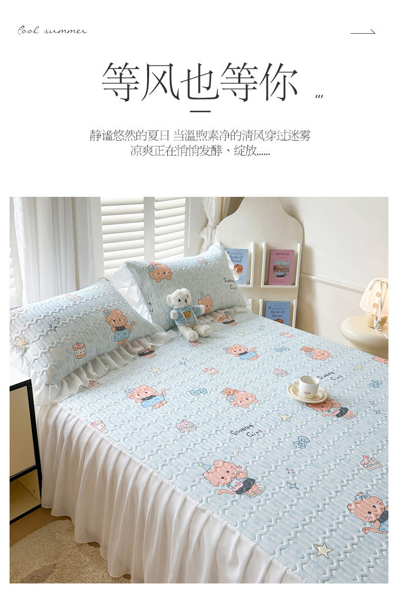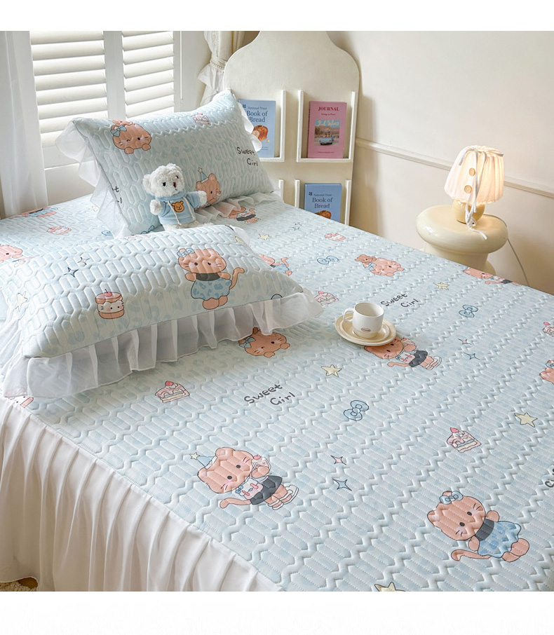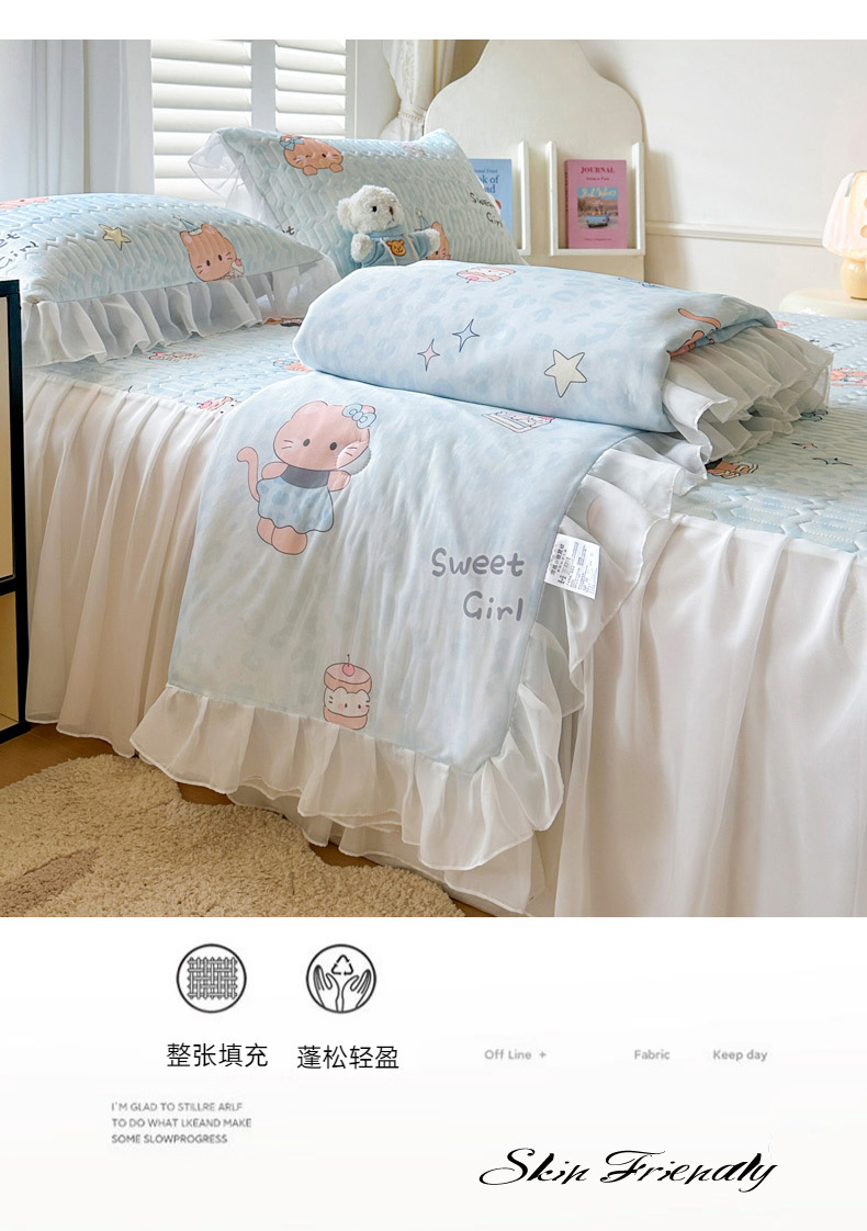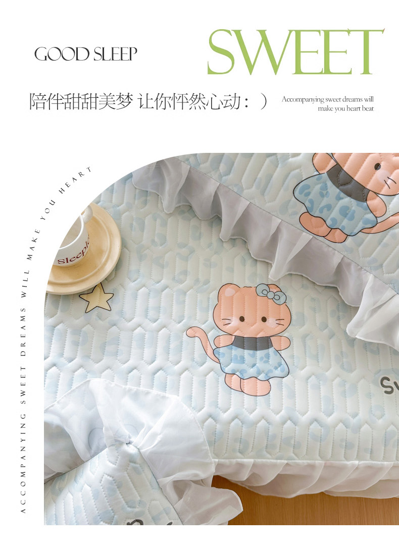 • 91家纺网 家纺一手货源 找家纺 慕澄2026新款小版印花床裙款乳胶凉席凉感丝夏被四件套 小猫茶话会