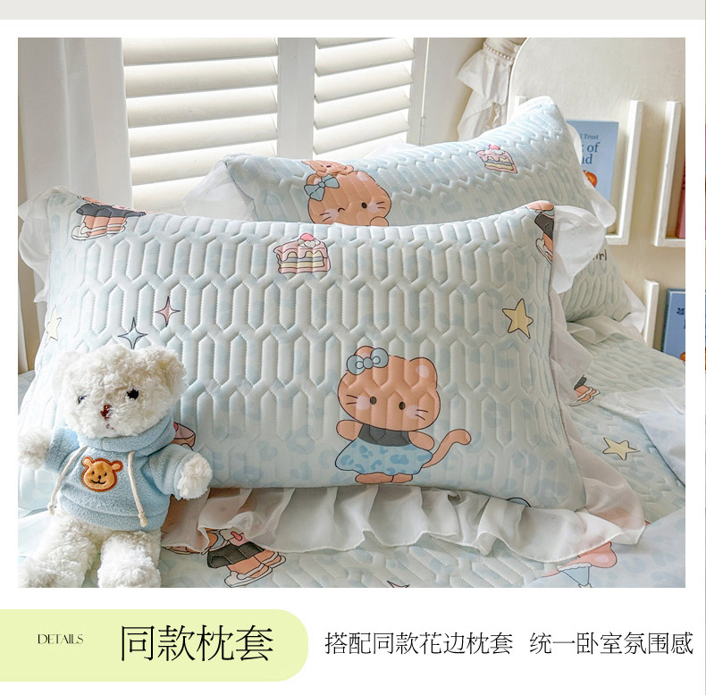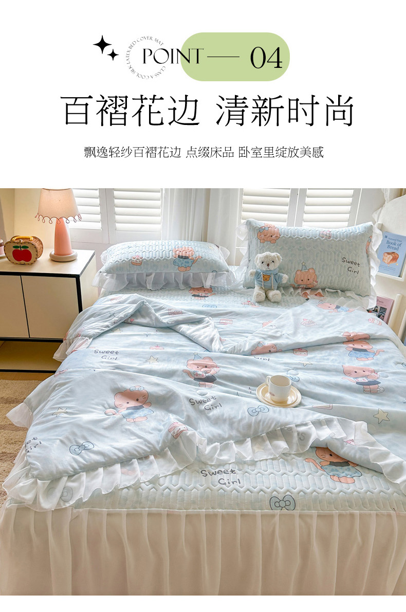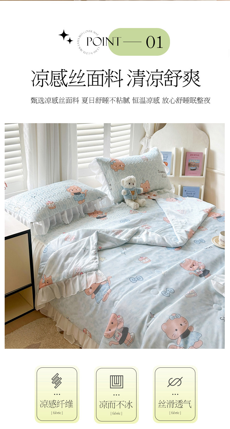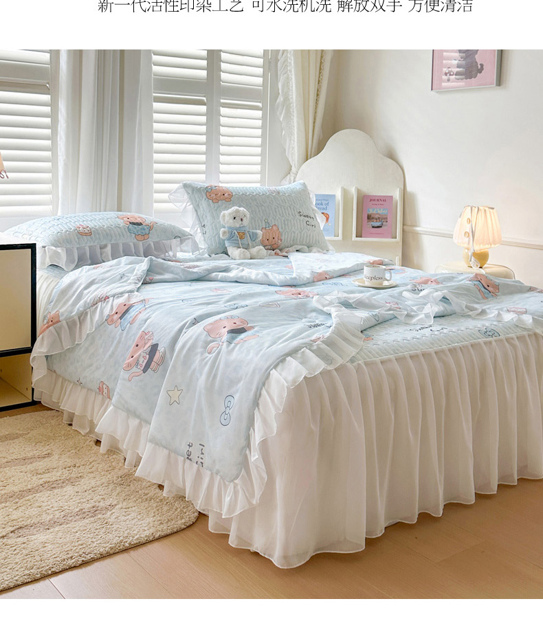 • 91家纺网 家纺一手货源 找家纺 慕澄2026新款小版印花床裙款乳胶凉席凉感丝夏被四件套 小猫茶话会