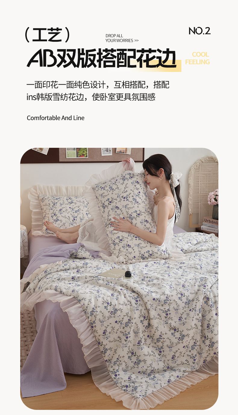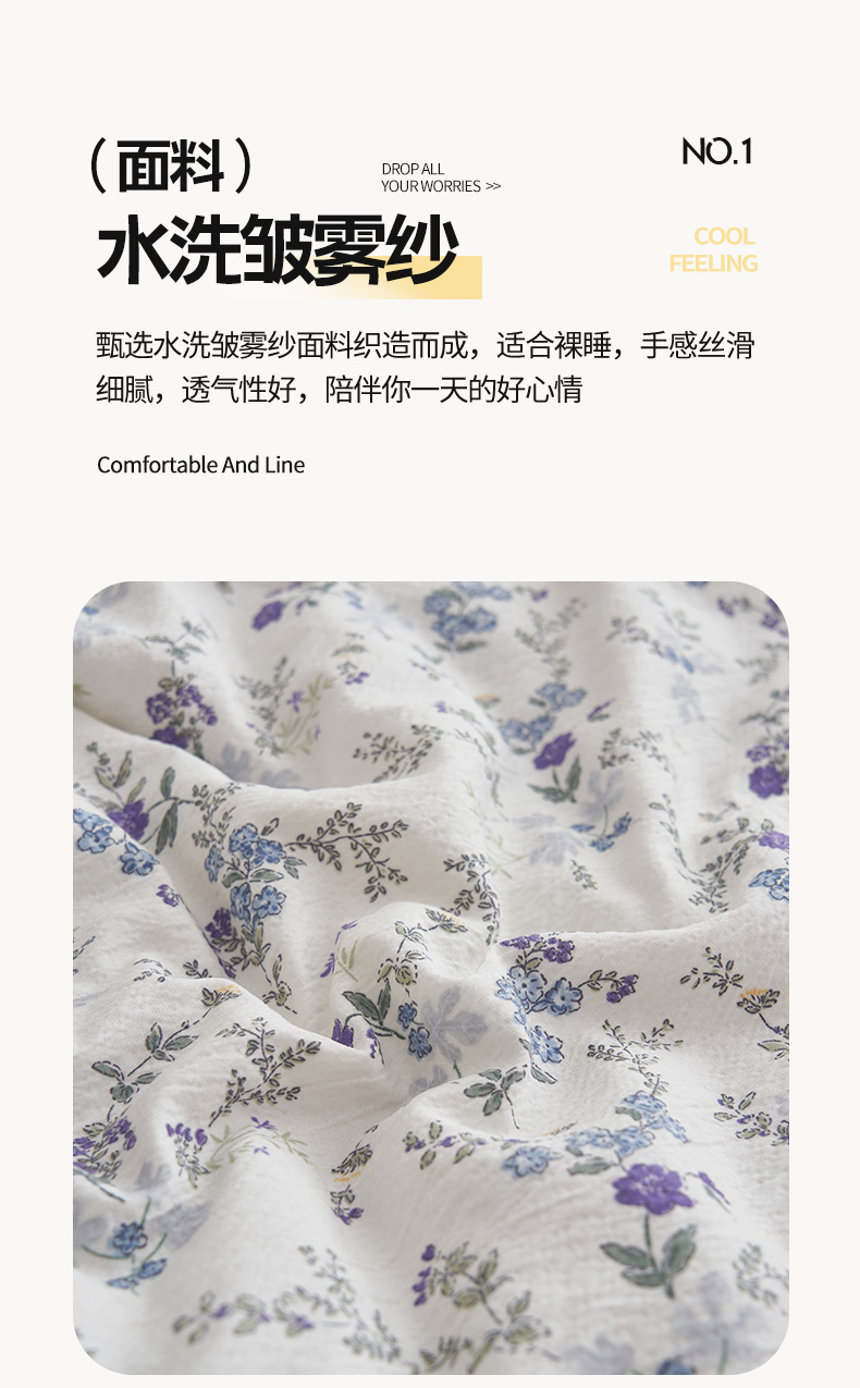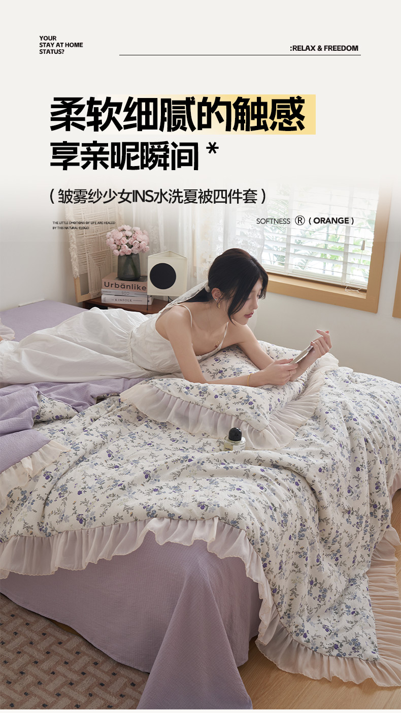 当前位置: 91家纺网 > 商品网购 > 床品套件 > 四件套 > 夏被四件套 > 晨曦家纺 2026新款皱雾纱水洗夏凉被夏被四件套少女ins风韩版 蓝花的信
